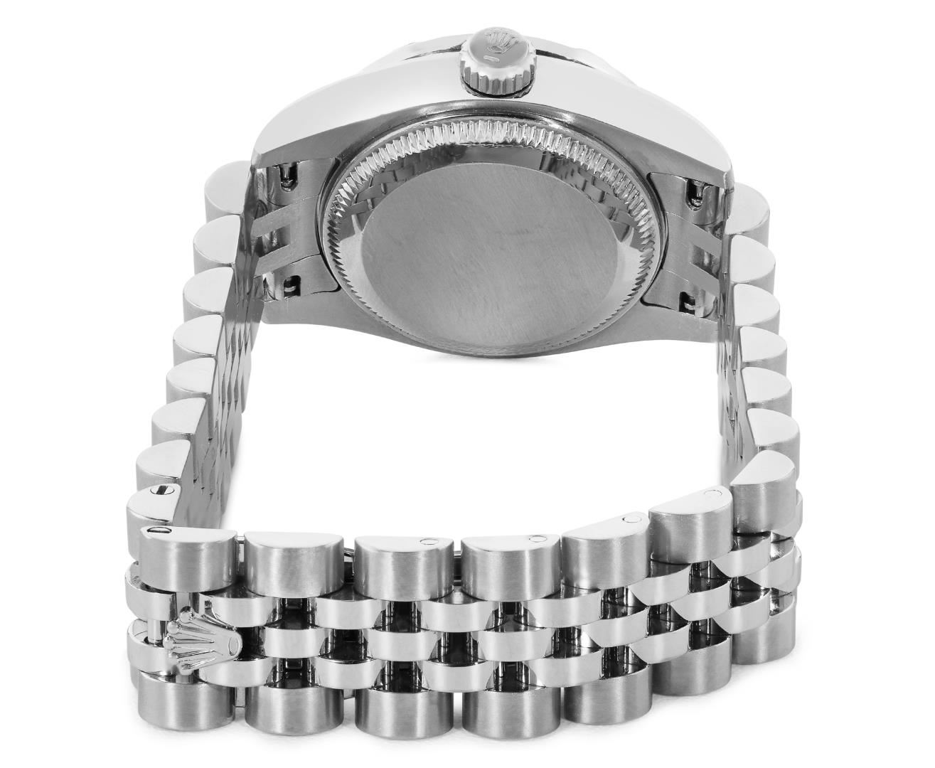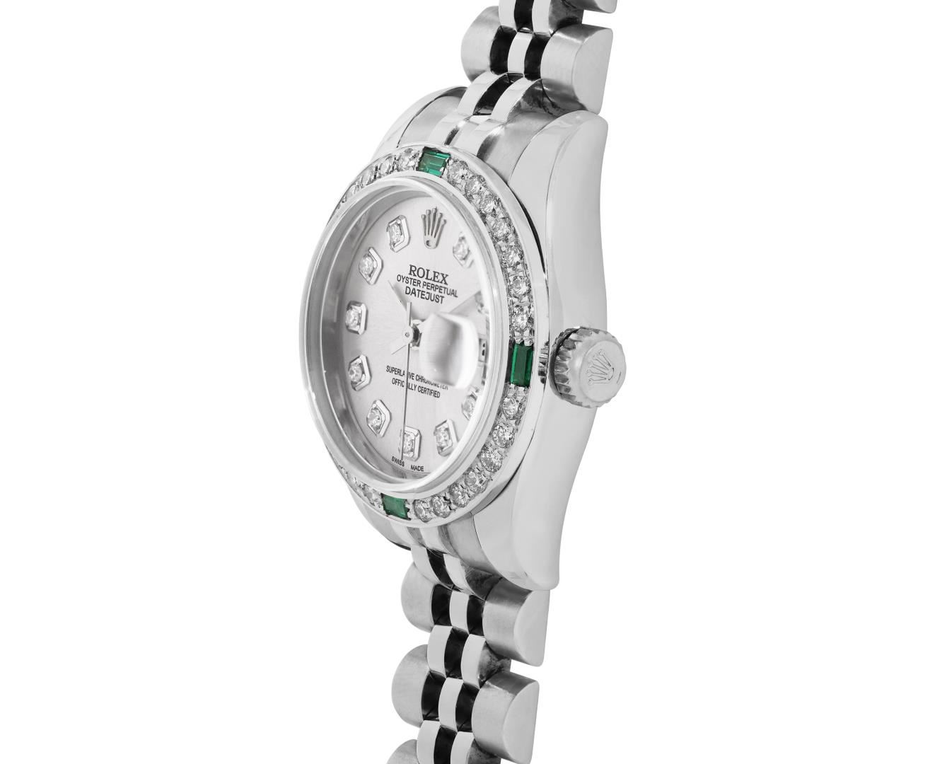One Rolex Ladies Rolex Quickset Pre Owned Stainless Steel Datejust Wristwatch Polished Bright with Satin Finish, Serviced And Electronically Tested, Stainless Steel Case: 26mm, Stainless Steel Crown, Custom Bezel: New 18K White Gold Beadset Diamond And Emerald Bezel, Diamond + Stone Count: 28 Diamonds + 4 Emeralds. Crystal: Sapphire With Magnified Date Window. Hands: Non Luminescent Hands. Rolex Movement: 2235 Automatic Winding Movement 2235. Custom Dial: Custom Silver Dial With Added Diamond Hour Markers, Diamond Count: 10 Diamonds On Dial. Date Window: 3 O'Clock Position Date Display, Model: Quickset Datejust. Condition: G-6 Extra Fine. Rolex Bracelet: Stainless Steel Jubilee Band. Bright Polish And Satin Finish. 6.0 Inch Length, Adjustable. Hidden Clasp, With Rolex Logo. This Watch Has Been Serviced And Time Tested. It Is In Excellent Condition, Free Of All Scratches And Dents. This Watch Comes With A Rolex Box.