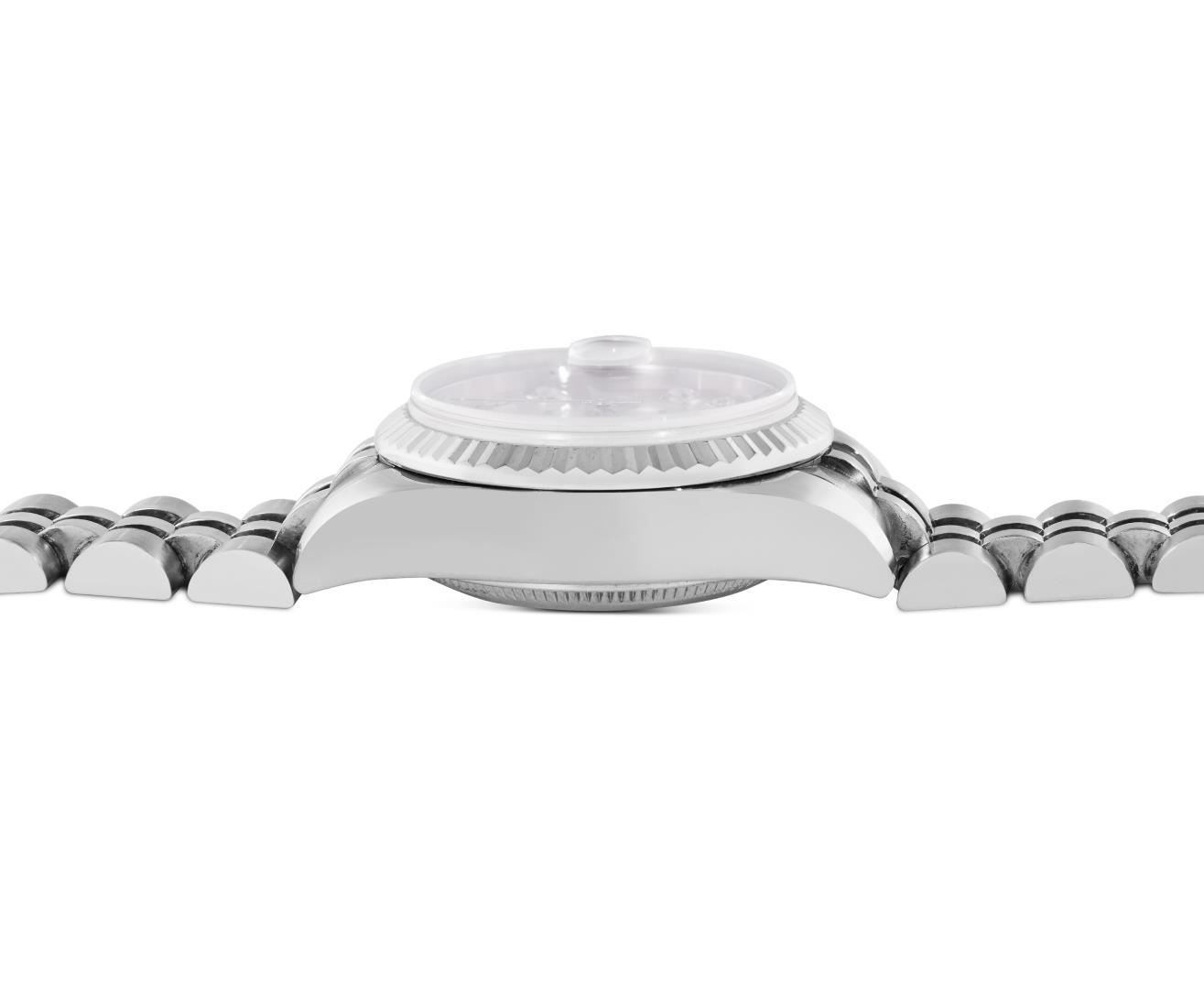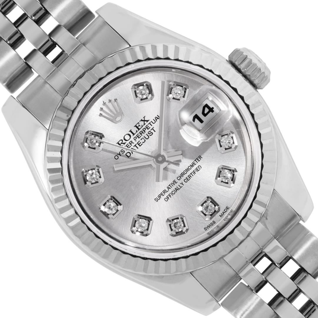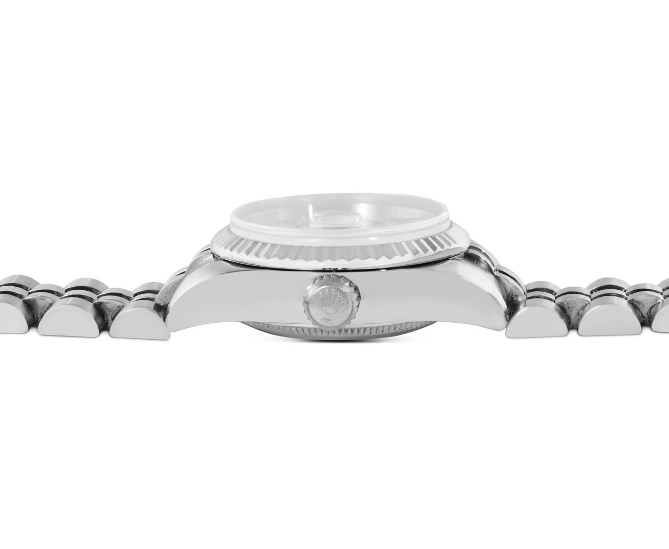 One Ladies Pre Owned Rolex Stainless Steel Datejust Wristwatch Polished Bright with Satin Finish, Serviced And Electronically Tested, Stainless Steel Case: 26mm, Stainless Steel Crown, Rolex Bezel: Rolex 18K White Gold Fluted bezel. Crystal: Sapphire With Magnified Date Window. Hands: Luminescent Hands. Rolex Movement: 2235 Automatic Winding Movement. Custom Dial: Custom Silver Dial With Added Diamond Hour Markers. Date Window: 3 O'Clock Position Date Display, Model: Quickset Datejust. Condition: G-6 Extra Fine. Rolex Bracelet: Stainless Steel Jubilee Band. Bright Polish & Satin Finish. 6.0 Inch Length, Adjustable. Hidden Clasp, With Rolex Logo. This Watch Has Been Serviced And Time Tested. It Is In Excellent Condition, Free Of All Scratches And Dents. This Watch Comes With A Rolex Box.