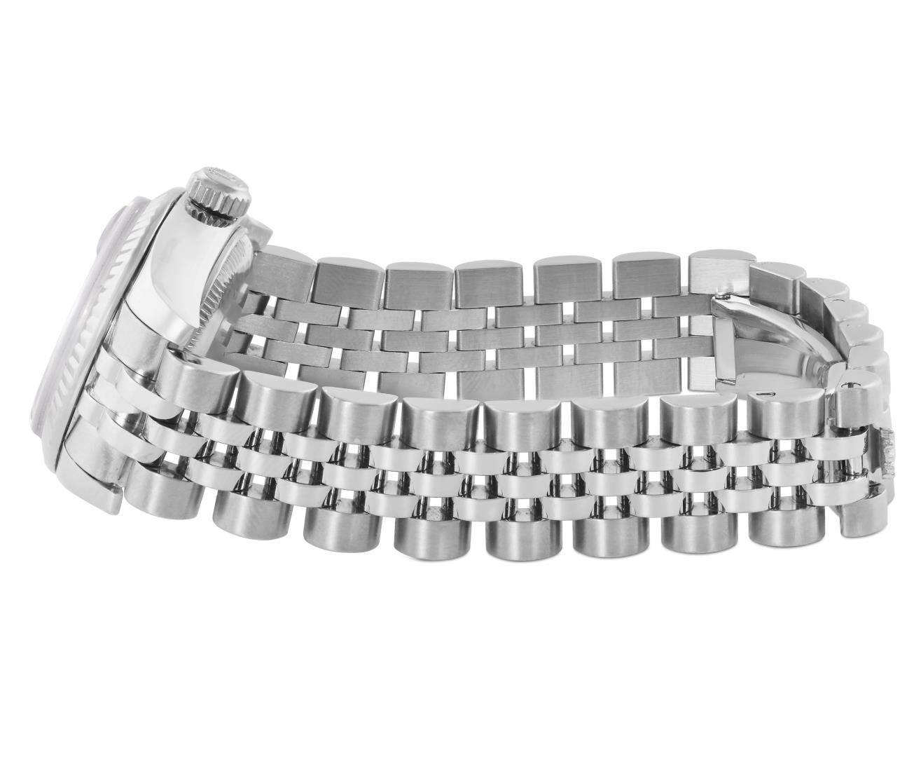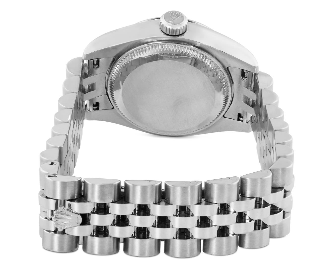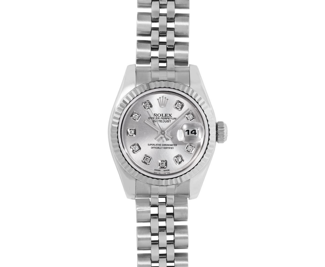 One Ladies Pre Owned Rolex Stainless Steel Datejust Wristwatch Polished Bright with Satin Finish, Serviced And Electronically Tested, Stainless Steel Case: 26mm, Stainless Steel Crown, Rolex Bezel: Rolex 18K White Gold Fluted bezel. Crystal: Sapphire With Magnified Date Window. Hands: Luminescent Hands. Rolex Movement: 2235 Automatic Winding Movement. Custom Dial: Custom Silver Dial With Added Diamond Hour Markers. Date Window: 3 O'Clock Position Date Display, Model: Quickset Datejust. Condition: G-6 Extra Fine. Rolex Bracelet: Stainless Steel Jubilee Band. Bright Polish & Satin Finish. 6.0 Inch Length, Adjustable. Hidden Clasp, With Rolex Logo. This Watch Has Been Serviced And Time Tested. It Is In Excellent Condition, Free Of All Scratches And Dents. This Watch Comes With A Rolex Box.