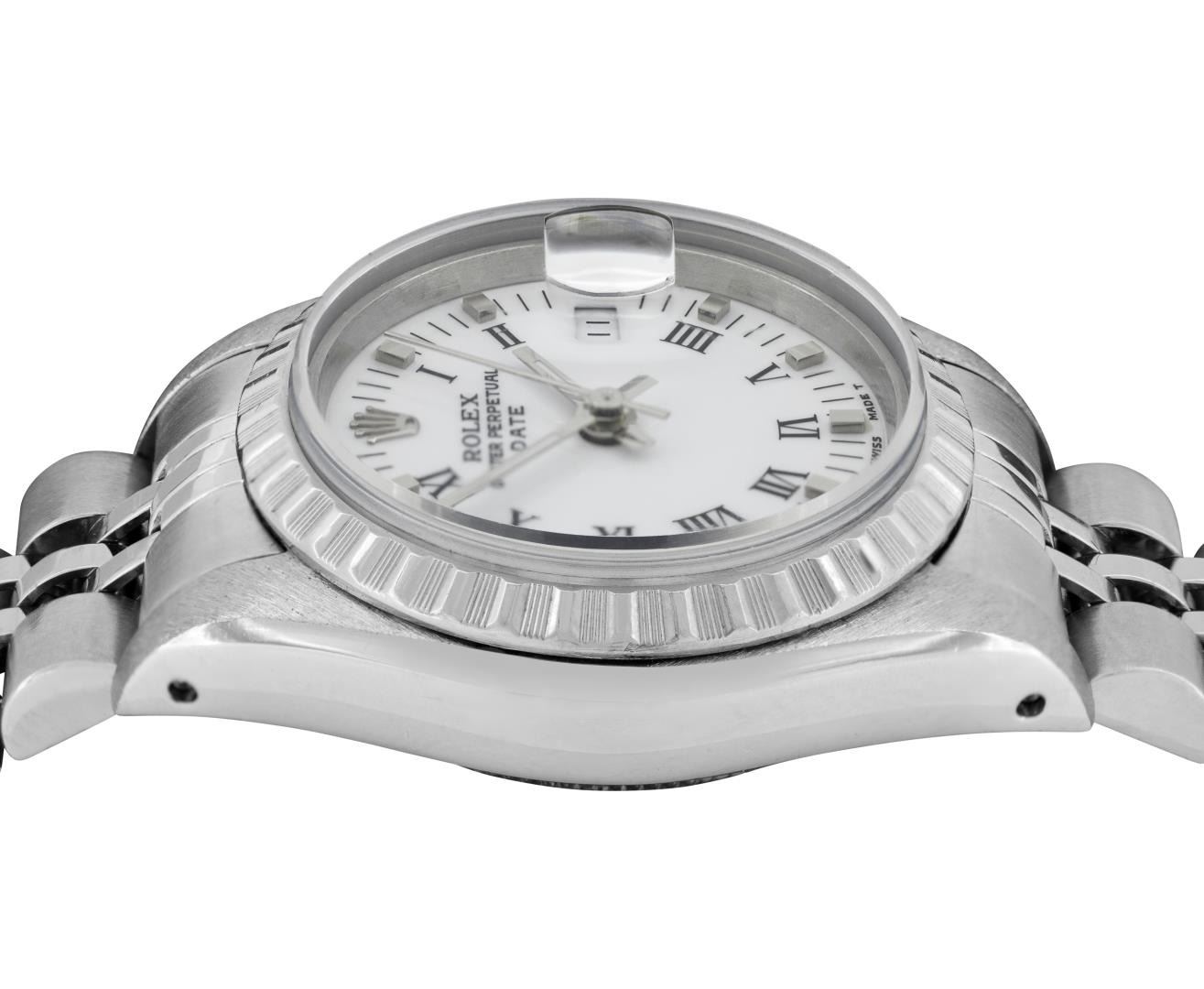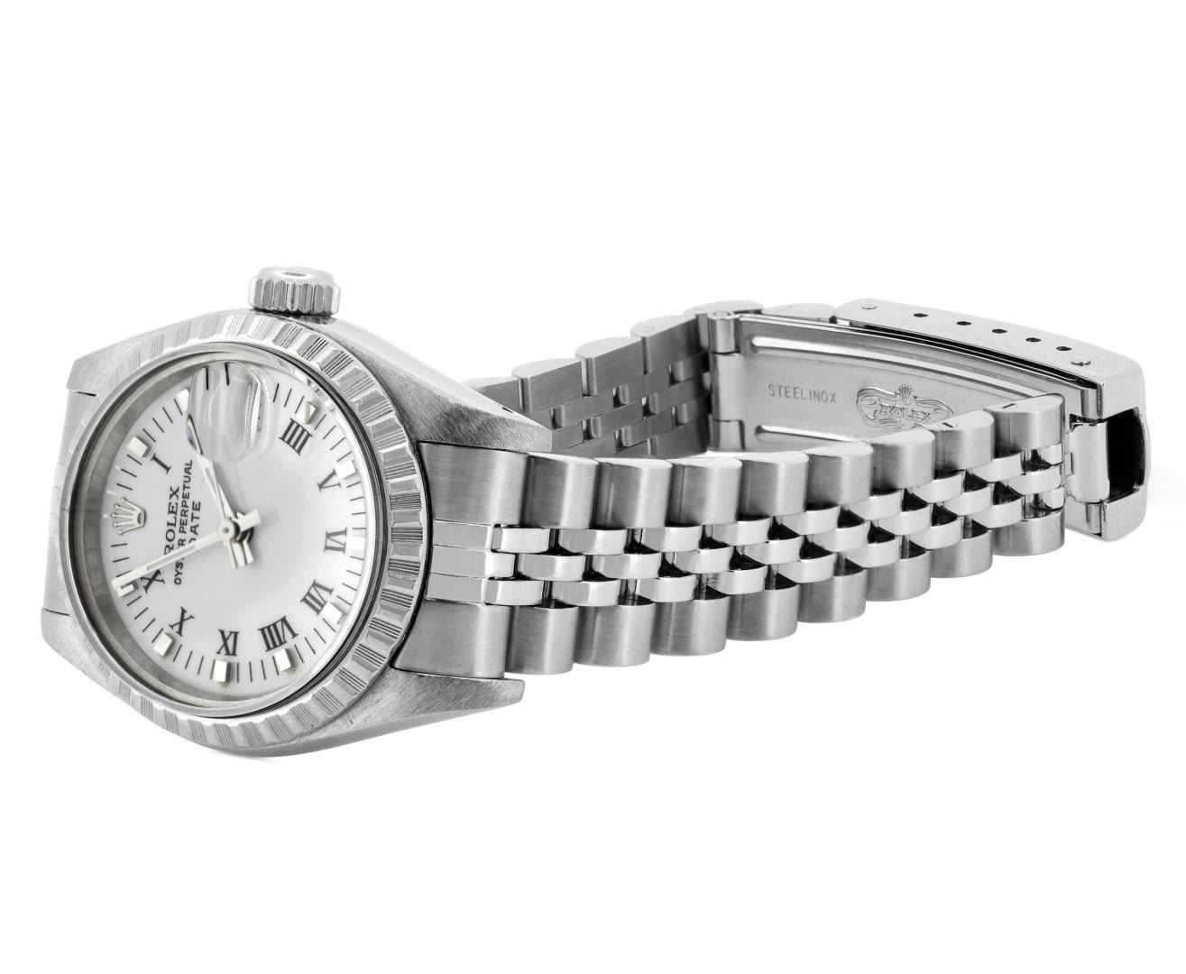 One Rolex Ladies Pre Owned Stainless Steel Date Wristwatch Polished Bright with Satin Finish, Serviced & Electronically Tested, Stainless Steel Case: 26mm, Stainless Steel Crown, Rolex Stainless Steel Engine Turn bezel. Custom Crystal: New Sapphire With Magnified Date Window. Custom Hands: New Luminescent Hands. Rolex Movement: 2135 Automatic Winding Movement. Rolex Dial: Factory White Dial With Roman Hour Markers and Index Markers And Lumi Dots and Dash Tracks. Date Window: 3 O'Clock Position Date Display, Model: Quickset Date. Condition: G-6 Extra Fine. Rolex Bracelet: Stainless Steel Jubilee Band. Bright Polish & Satin Finish. 6.0 Inch Length, Adjustable. Standard Clasp, With Rolex Logo. This Watch Has Been Serviced And Time Tested. It Is In Excellent Condition, Free Of All Scratches And Dents. This Watch Comes With A Rolex Box.