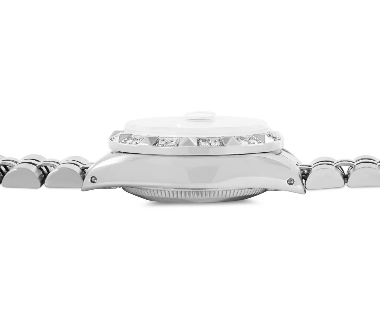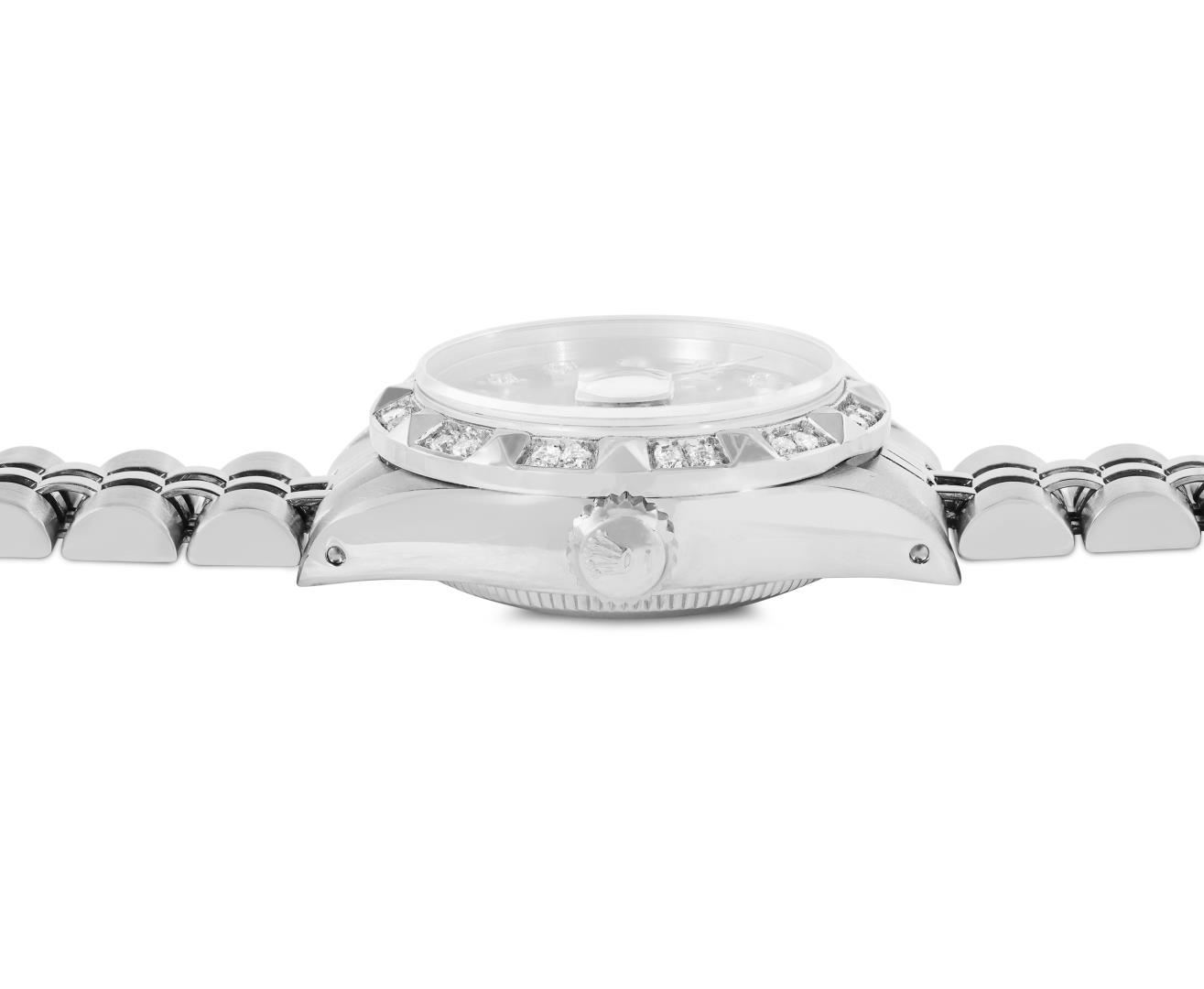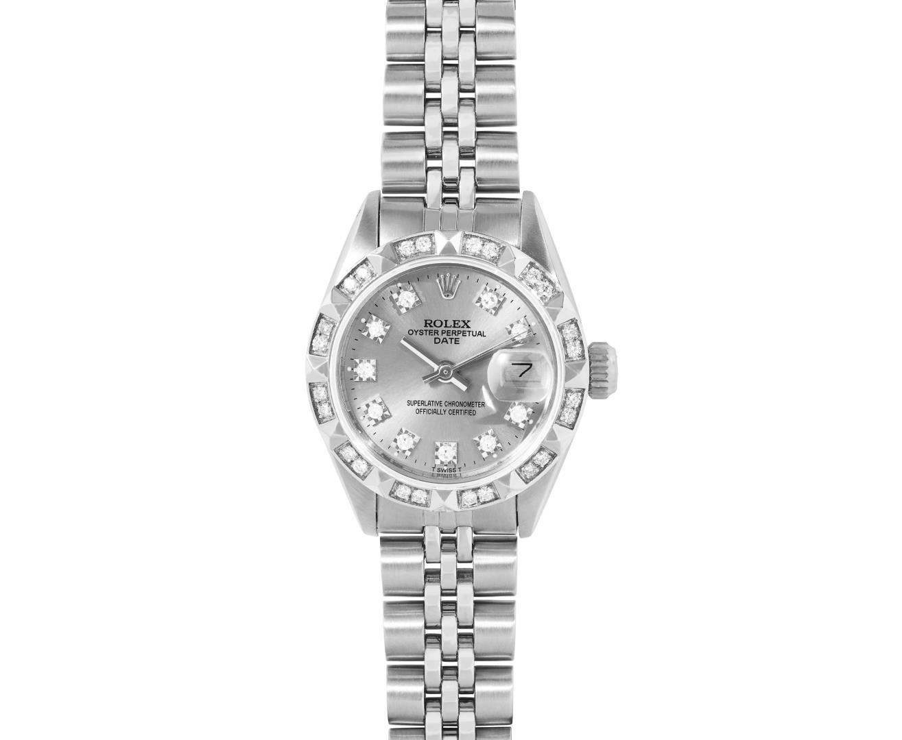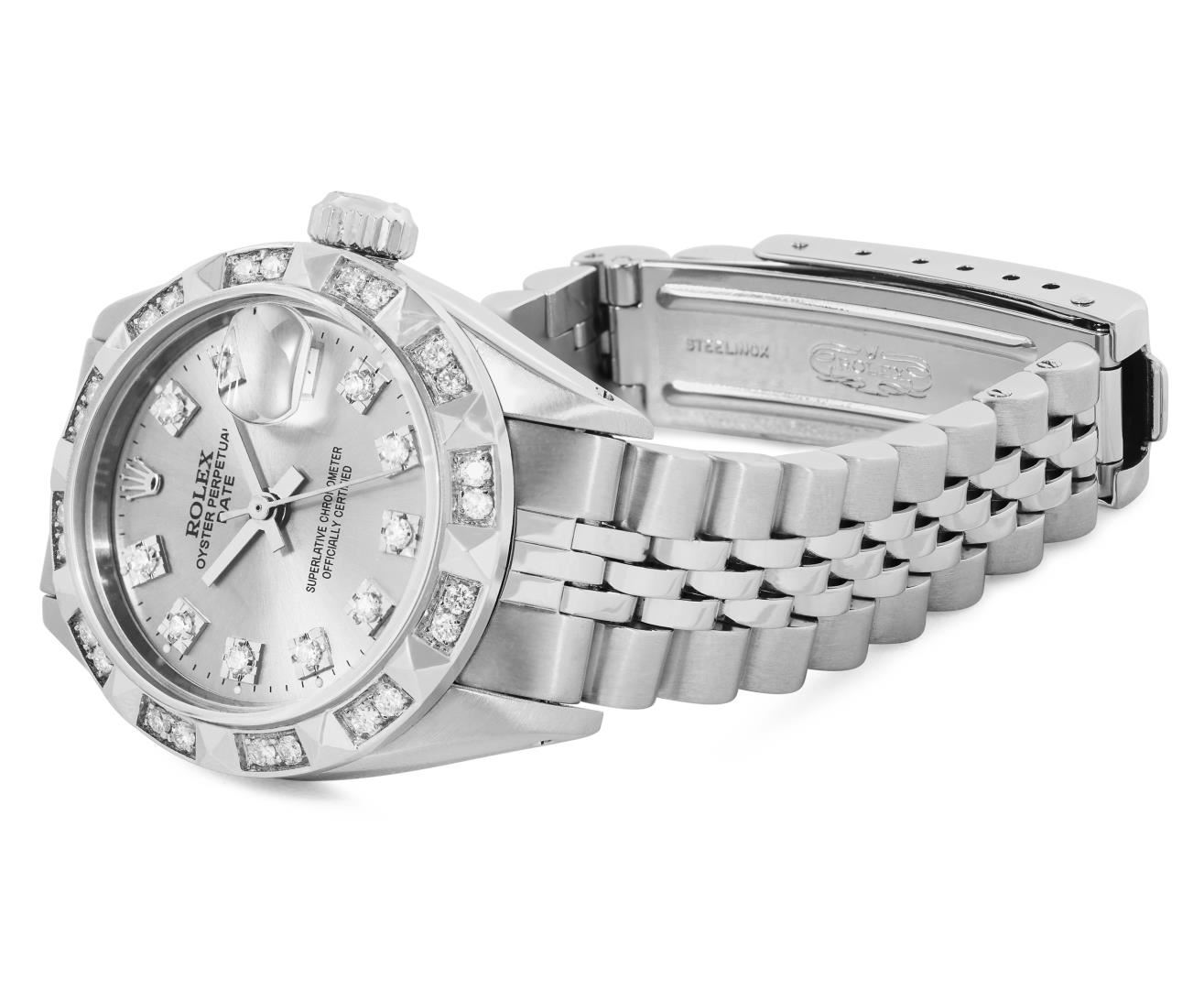 One Rolex Ladies Pre Owned Stainless Steel Date Wristwatch Polished Bright with Satin Finish, Serviced And Electronically Tested, Stainless Steel Case: 26mm, Stainless Steel Crown, Custom Bezel: New 18K White Gold Pyramid Diamond Bezel, Diamond Count: 24 Diamonds On Bezel. Custom Crystal: New Sapphire With Magnified Date Window. Custom Hands: New Solid Hands. Rolex Movement: Automatic Winding Movement 2035. Custom Dial: Custom Silver Dial With Added Diamond Hour Markers Dash Track, and Lumi Dots. Date Window: 3 O'Clock Position Date Display, Model: Date. Condition: G-6 Extra Fine. Rolex Bracelet: Stainless Steel Jubilee Band. Bright Polish And Satin Finish. 6.0 Inch Length, Adjustable. Standard Clasp, With Rolex Logo. This Watch Has Been Serviced Time Tested And Is In Excellent Condition. It Is Free Of All Scratches And Dents.