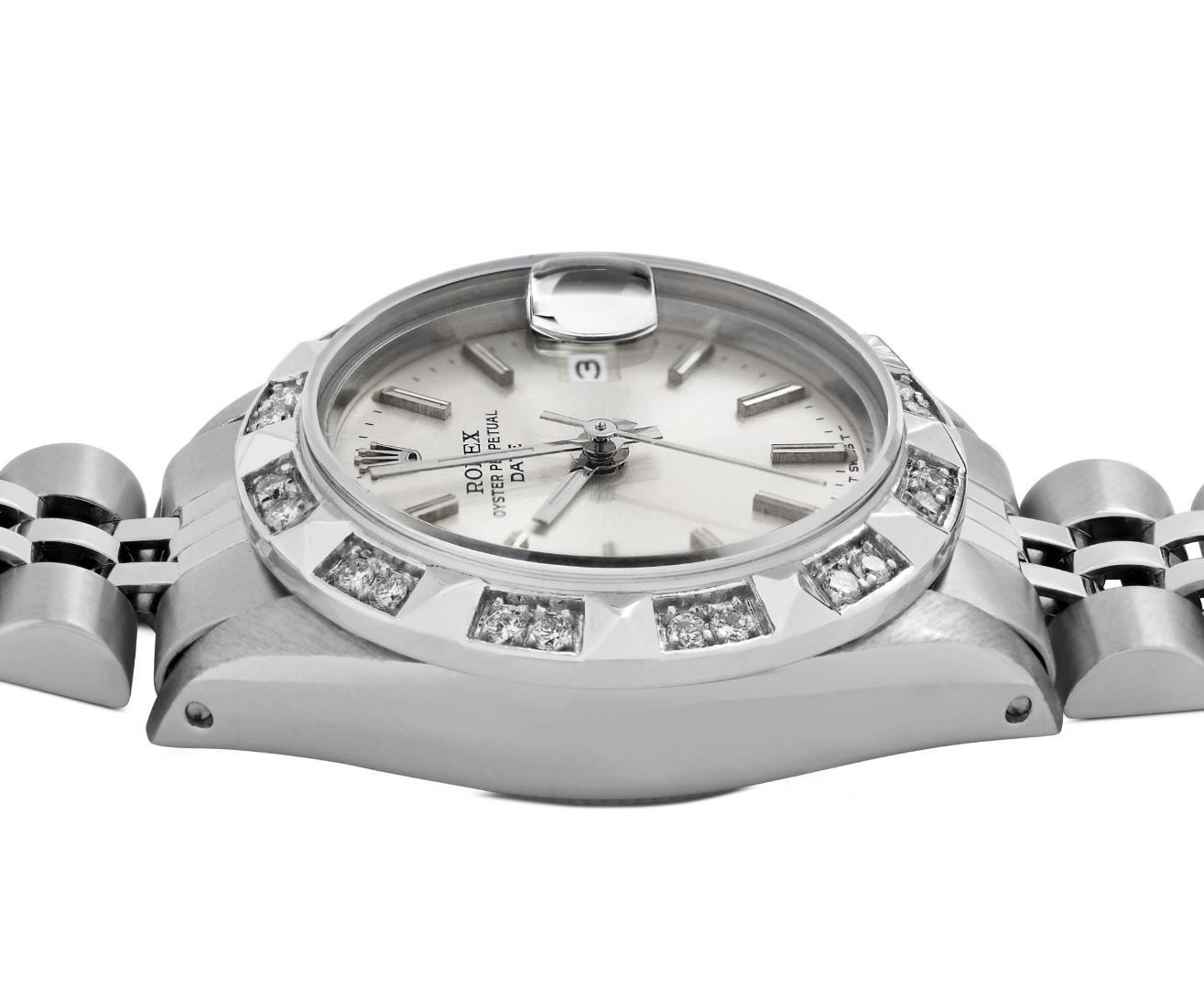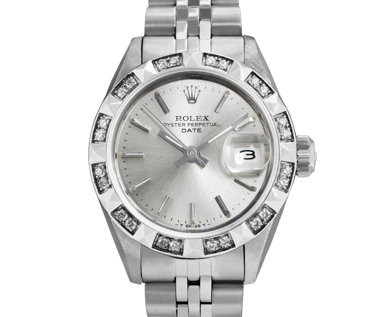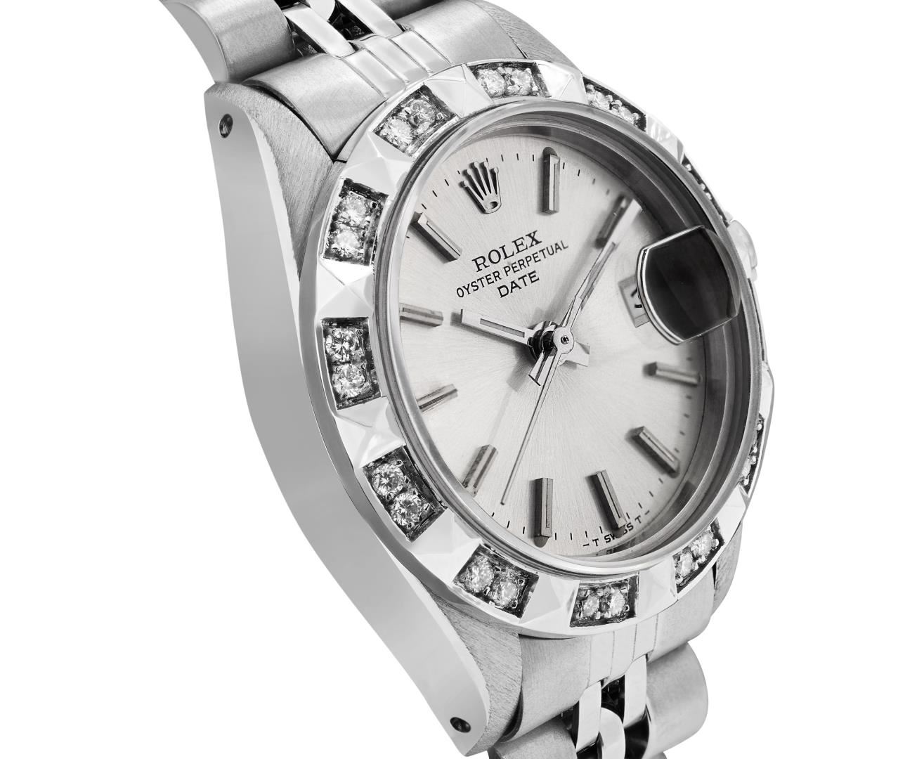 One Rolex Ladies Pre Owned Stainless Steel Date Wristwatch Polished Bright with Satin Finish, Serviced & Electronically Tested, Stainless Steel Case: 26mm, Stainless Steel Crown, Custom Bezel: New 18K White Gold Pyramid Diamond Bezel, Diamond Count: 24 Diamonds On Bezel. Custom Crystal: New Sapphire With Magnified Date Window. Custom Hands: New Luminescent Hands. Rolex Movement: Automatic Winding Movement 2030. Rolex Dial: Factory Silver Dial With Index Hour Markers And Lumi Dots. Date Window: 3 O'Clock Position Date Display, Model: Date. Condition: G-6 Extra Fine. Rolex Bracelet: Stainless Steel Jubilee Band. Bright Polish & Satin Finish. 6.0 Inch Length, Adjustable. Standard Clasp, With Rolex Logo. This Watch Has Been Serviced Time Tested And Is In Excellent Condition. It Is Free Of All Scratches And Dents.