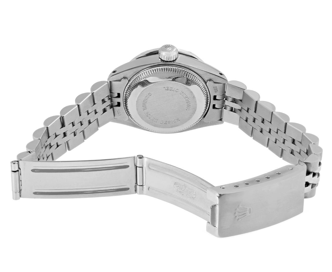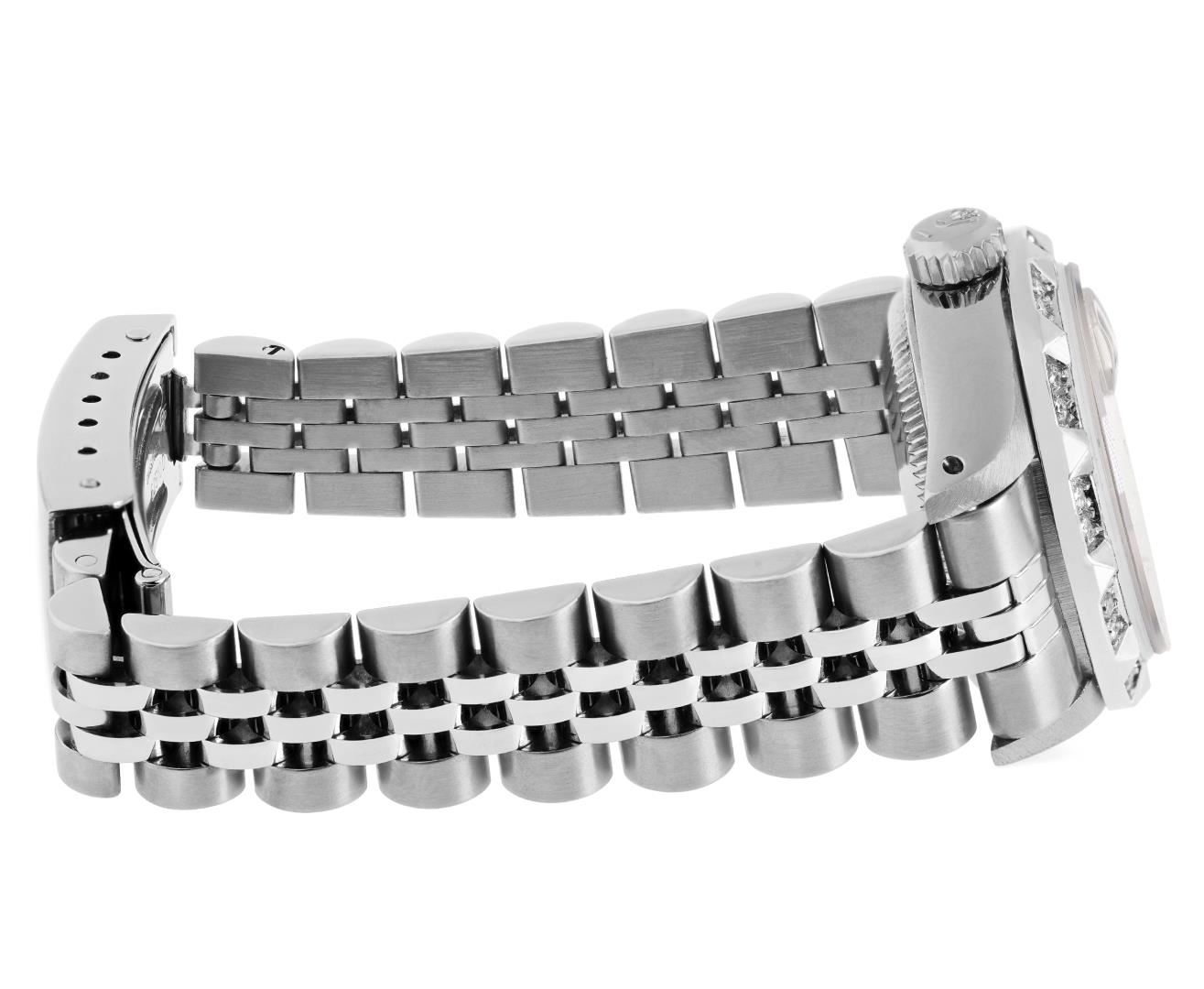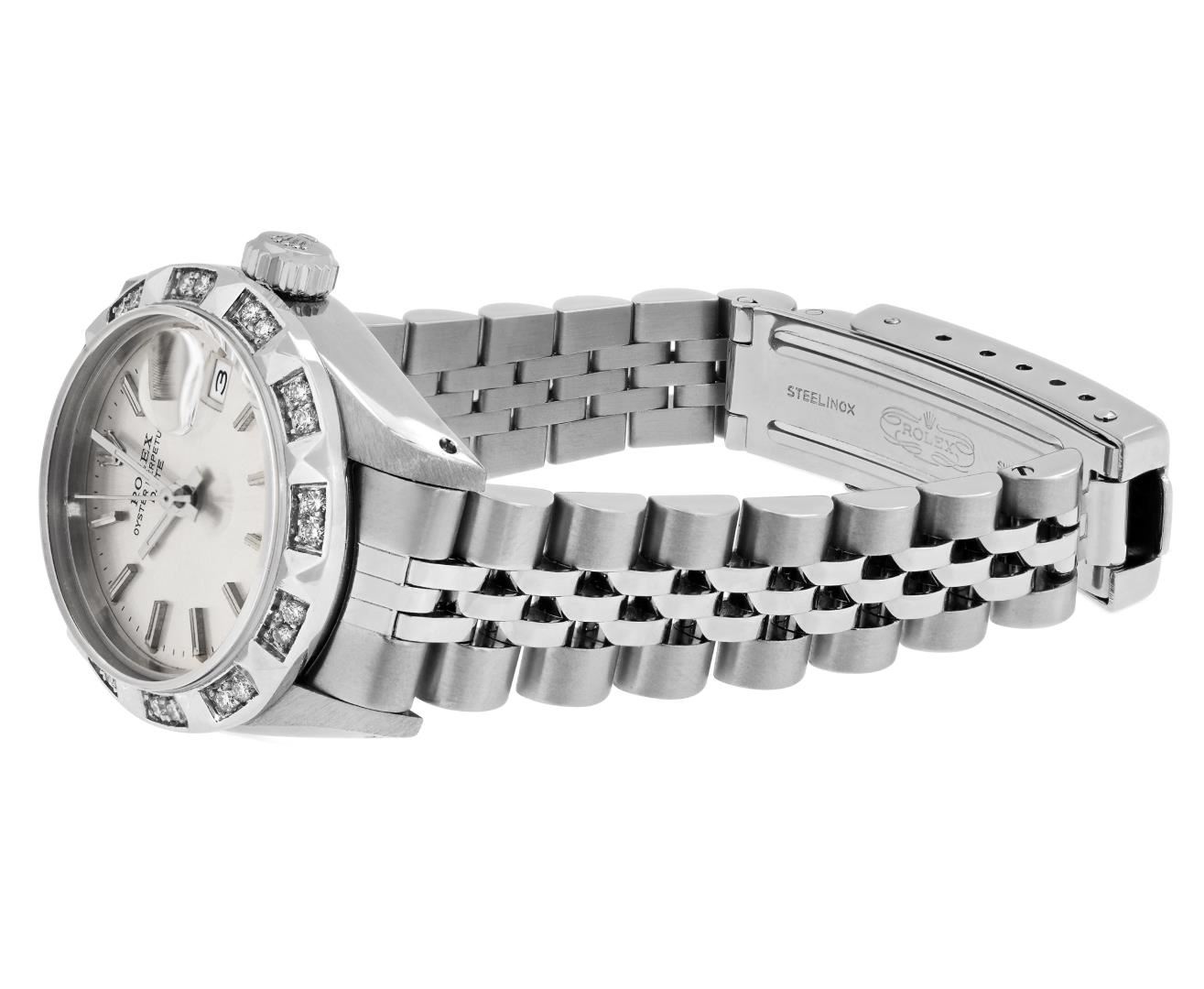 One Rolex Ladies Pre Owned Stainless Steel Date Wristwatch Polished Bright with Satin Finish, Serviced & Electronically Tested, Stainless Steel Case: 26mm, Stainless Steel Crown, Custom Bezel: New 18K White Gold Pyramid Diamond Bezel, Diamond Count: 24 Diamonds On Bezel. Custom Crystal: New Sapphire With Magnified Date Window. Custom Hands: New Luminescent Hands. Rolex Movement: Automatic Winding Movement 2030. Rolex Dial: Factory Silver Dial With Index Hour Markers And Lumi Dots. Date Window: 3 O'Clock Position Date Display, Model: Date. Condition: G-6 Extra Fine. Rolex Bracelet: Stainless Steel Jubilee Band. Bright Polish & Satin Finish. 6.0 Inch Length, Adjustable. Standard Clasp, With Rolex Logo. This Watch Has Been Serviced Time Tested And Is In Excellent Condition. It Is Free Of All Scratches And Dents.