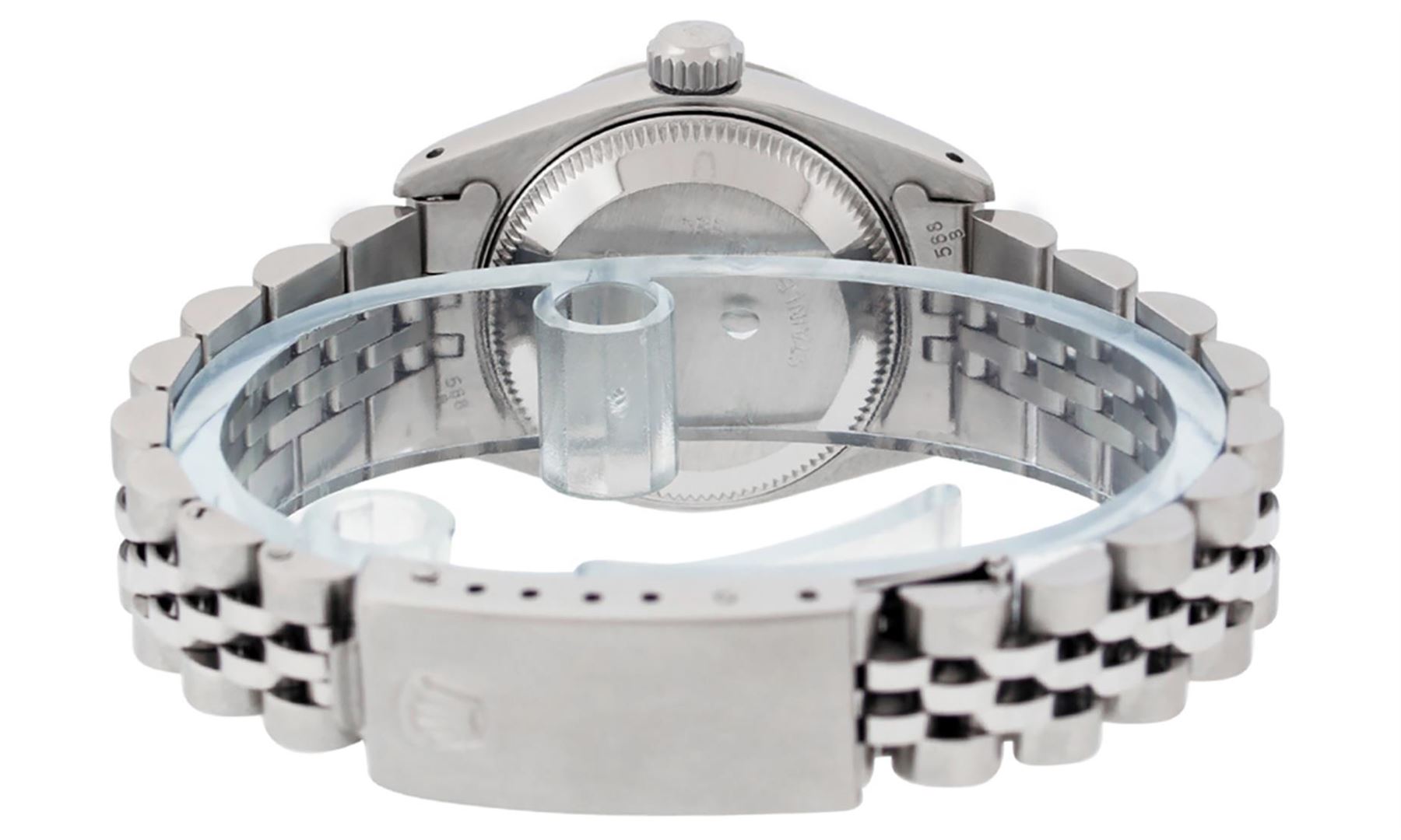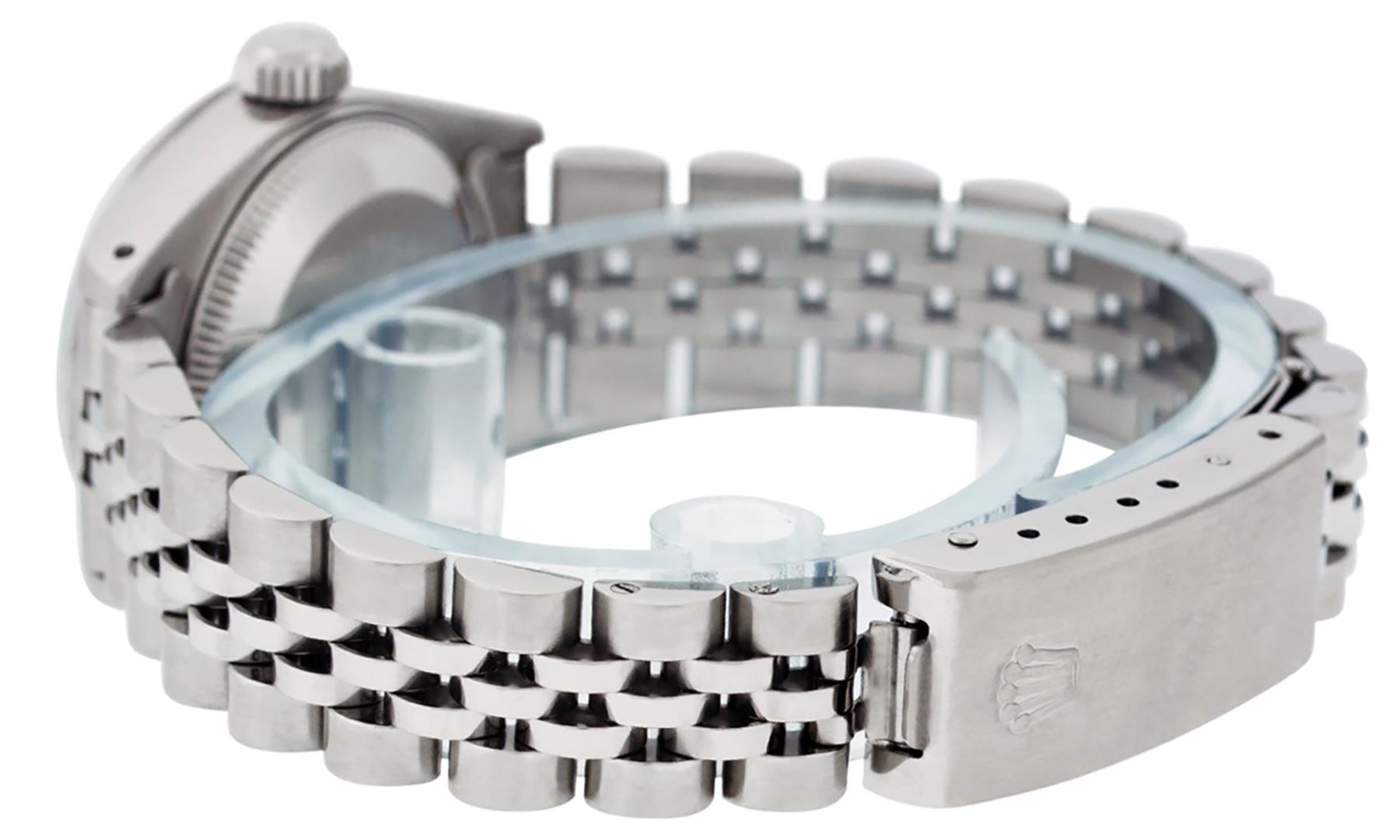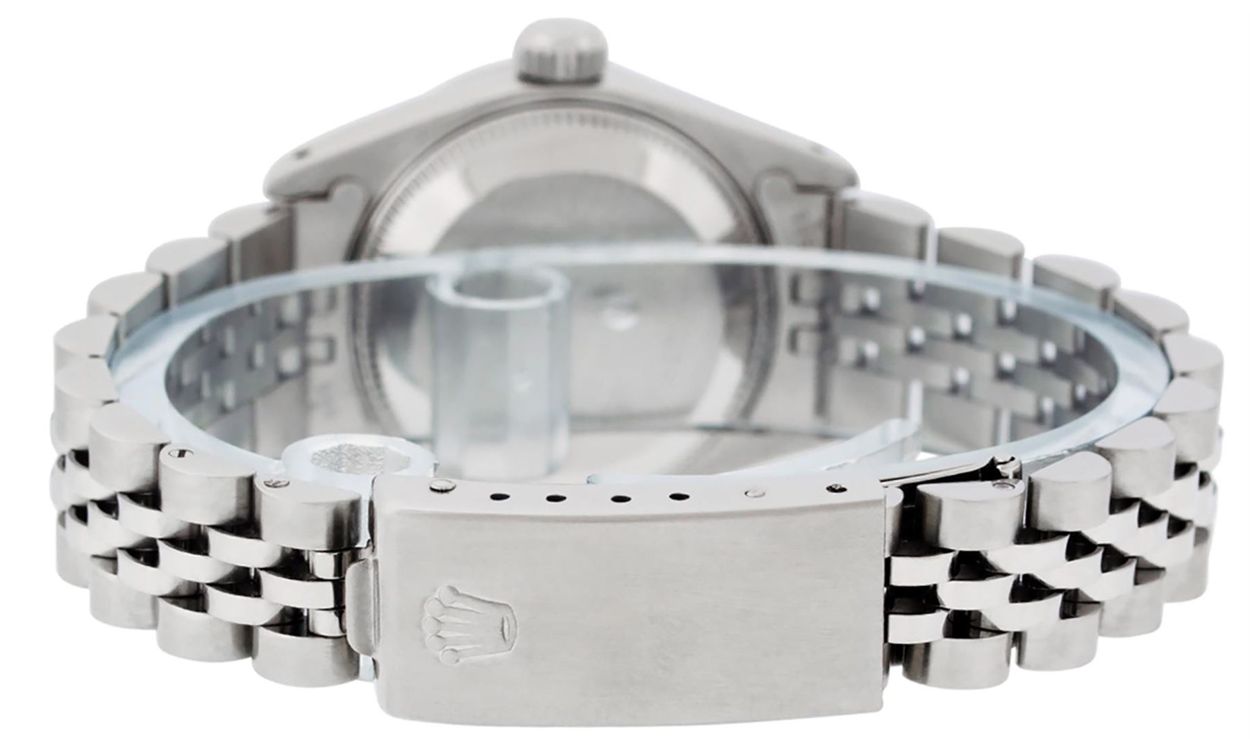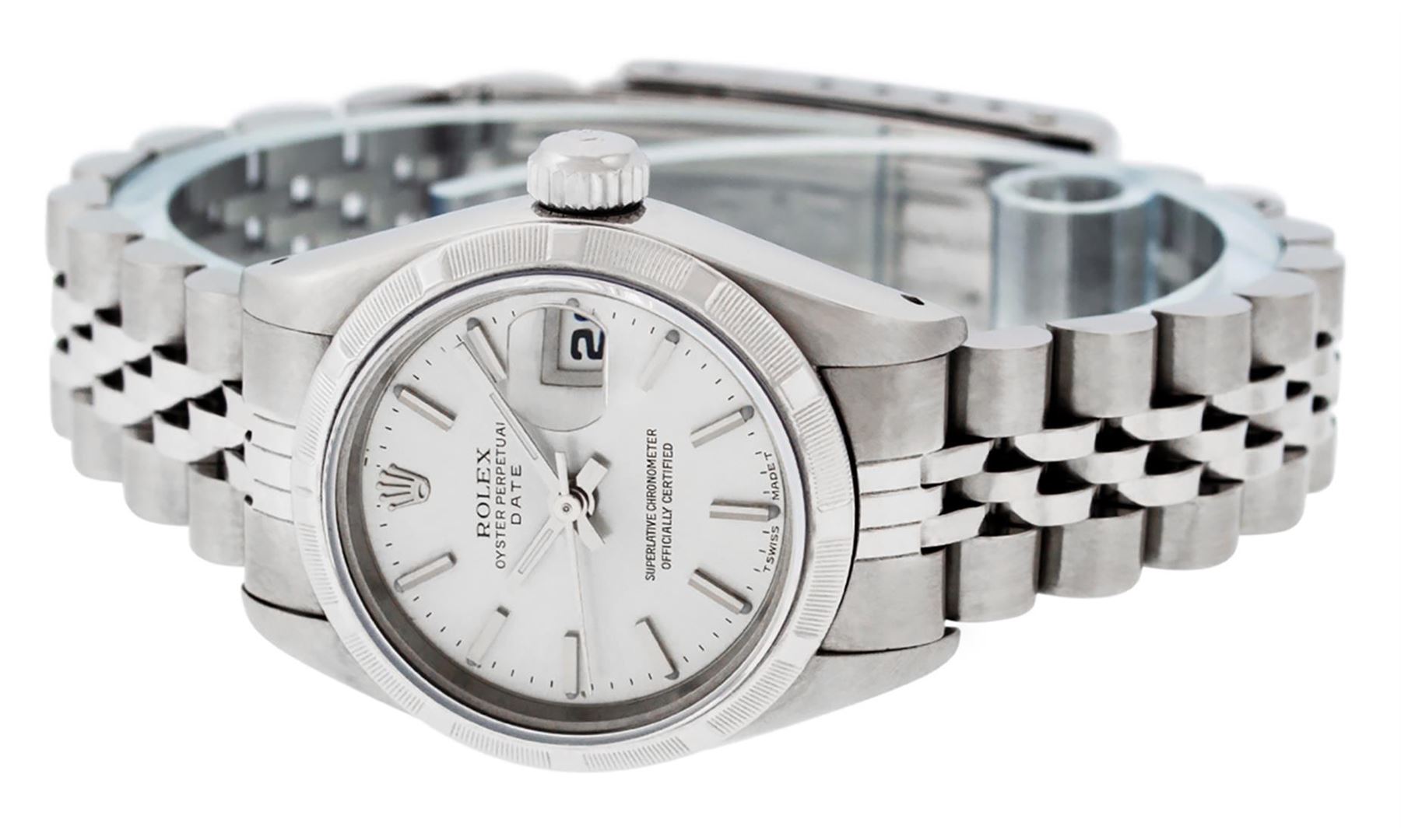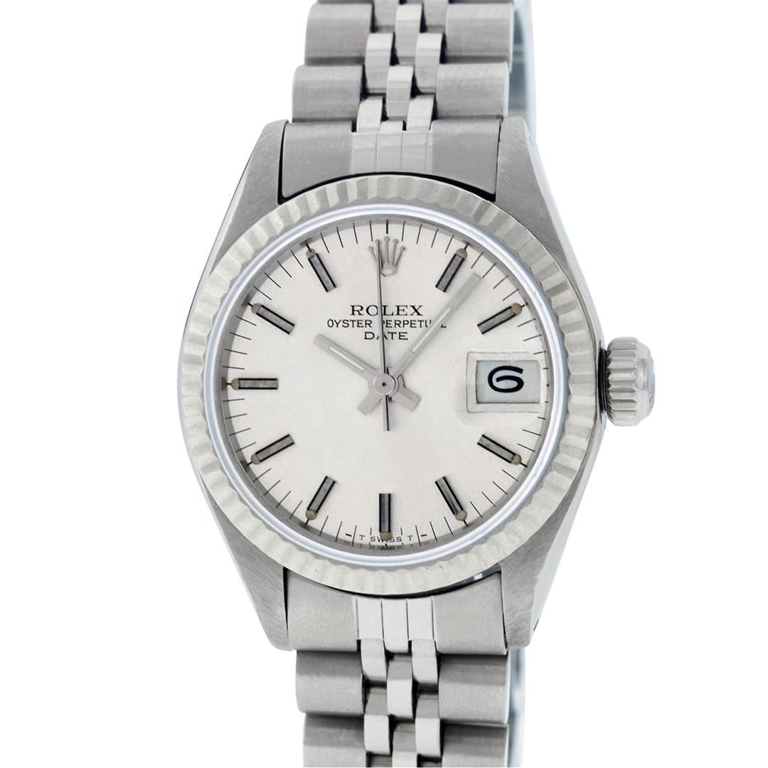 One Ladies Pre Owned Stainless Steel Rolex Date Polished Bright with Satin Finish, Serviced & Electronically Tested, Stainless Steel Case: 26mm, Stainless Steel Crown, Rolex Bezel: Stainless Steel Bezel. Custom Crystal: New Plastic With Date Window. Custom Hands: New Luminescent Hands. Rolex Movement: Automatic Winding Movement. Rolex Dial: Silver Index Dial. Date Window: 3 O'Clock Position Date Display, Model: Datejust. Condition: G-6 Extra Fine. Rolex Bracelet: Stainless Steel Jubilee Band. Bright Polish & Satin Finish. 6.0 Inch Length, Adjustable. Standard Clasp, With Rolex Logo. This Watch Has Been Serviced Time Tested And Is In Excellent Condition It Is Free Of All Scratches And Dents.