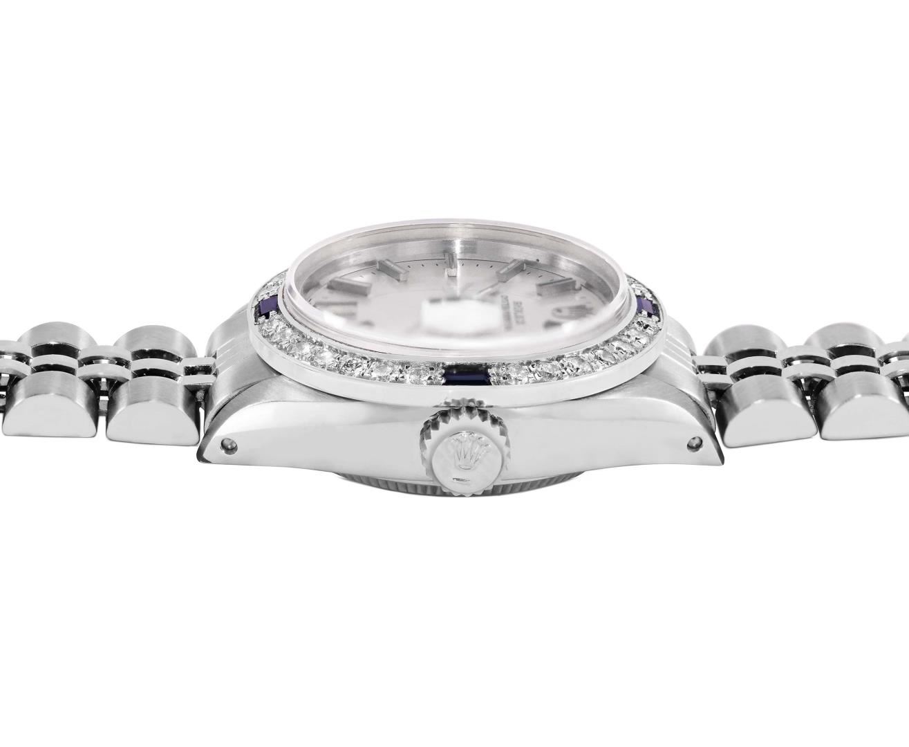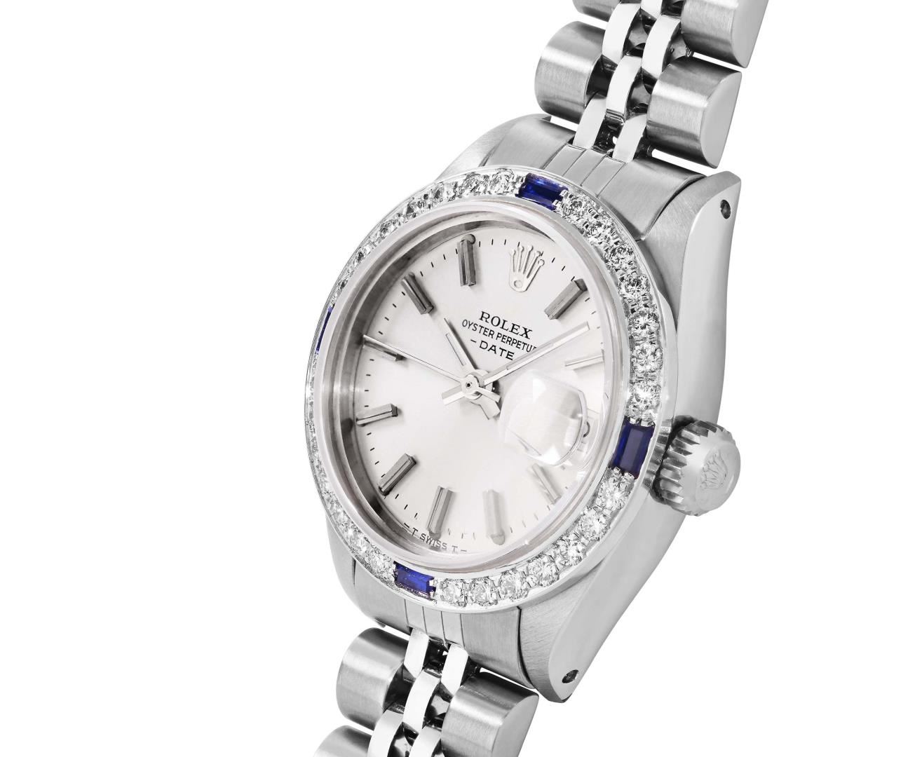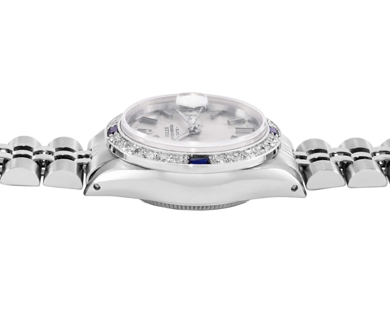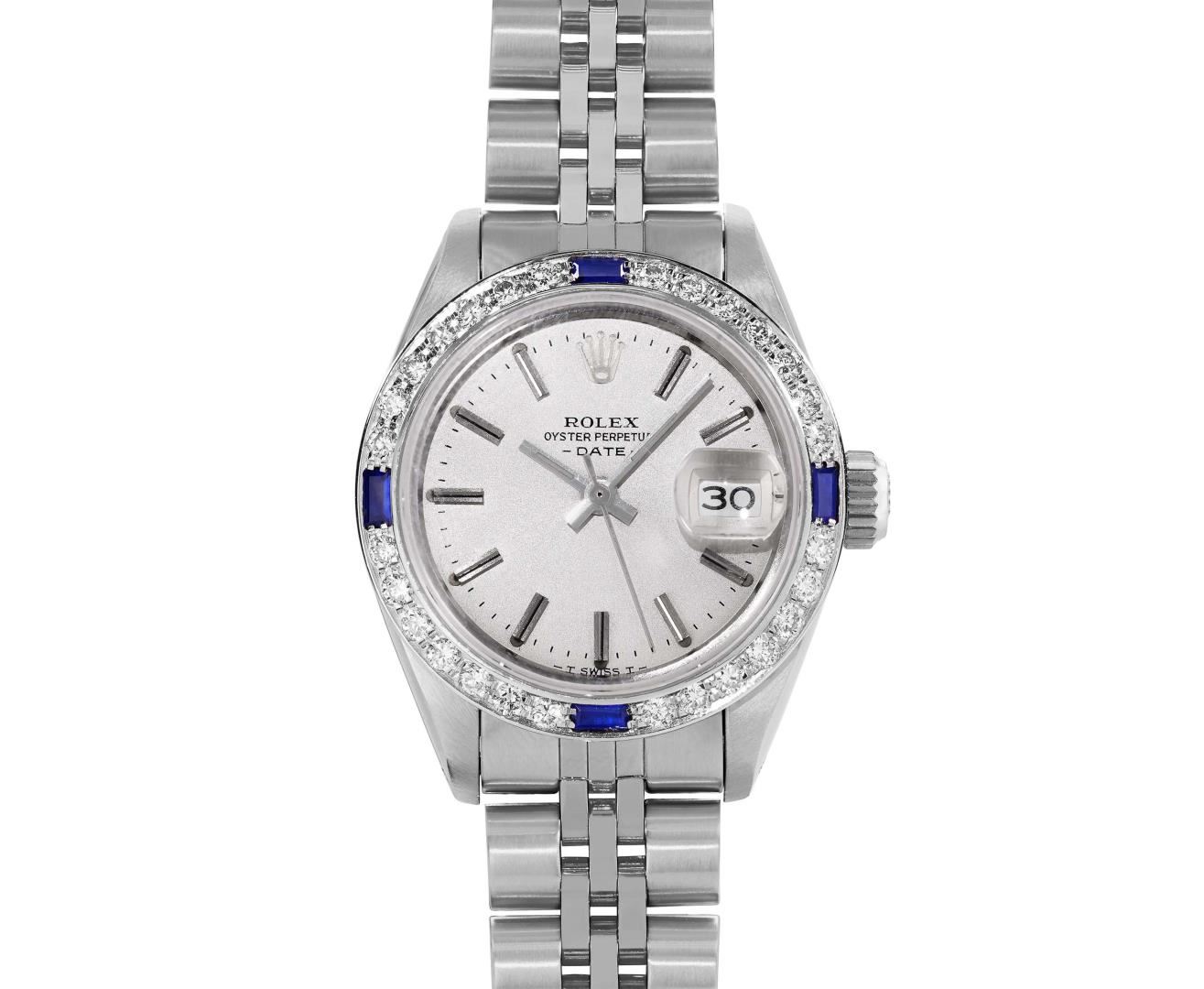 One Rolex Ladies Pre Owned Stainless Steel Date Wristwatch Polished Bright with Satin Finish, Serviced & Electronically Tested, Stainless Steel Case: 26mm, Stainless Steel Crown, Custom Bezel: New 18K White Gold Sapphire Beadset Diamond Bezel, Diamond + Gem Count: 36 Diamonds + 4 Sapphires, Clarity: SI-VS, Color: G to H. Custom Crystal: New Sapphire With Magnified Date Window. Custom Hands: New Luminescent Hands. Rolex Movement: Automatic Winding Movement 2030. Rolex Dial: Factory Silver Dial With Index Hour Markers and Lumi Markers, Dash Track, and Lumi Dots. Date Window: 3 O'Clock Position Date Display, Model: Date. Condition: G-6 Extra Fine. Rolex Bracelet: Stainless Steel Jubilee Band. Bright Polish & Satin Finish. 6.0 Inch Length, Adjustable. Standard Clasp, With Rolex Logo. This Watch Has Been Serviced Time Tested And Is In Excellent Condition. It Is Free Of All Scratches And Dents.