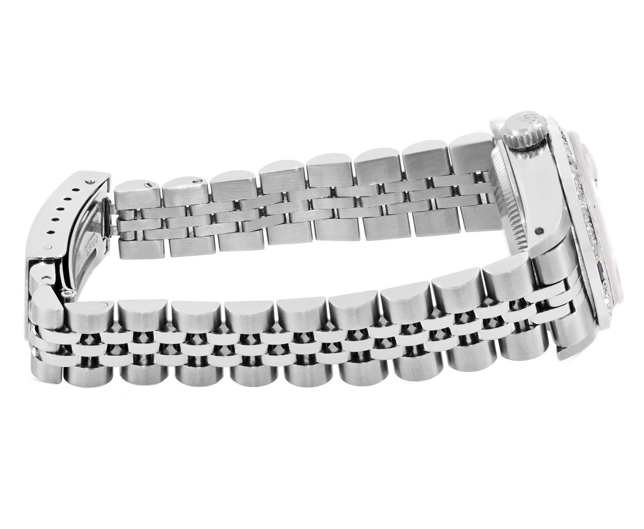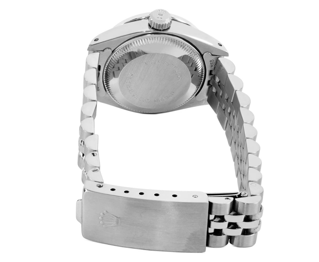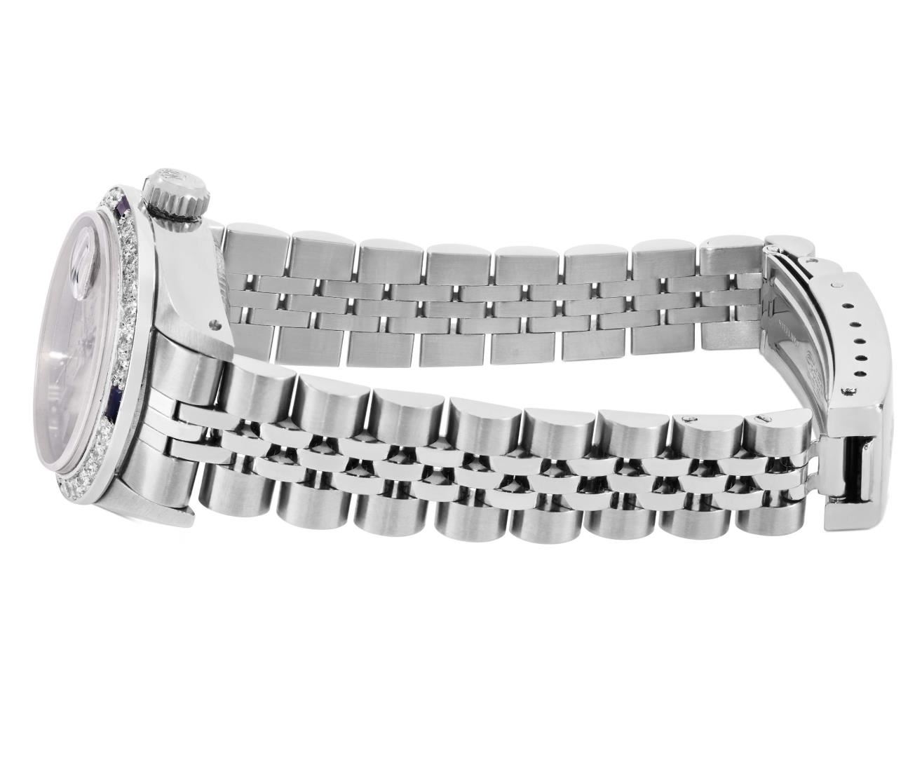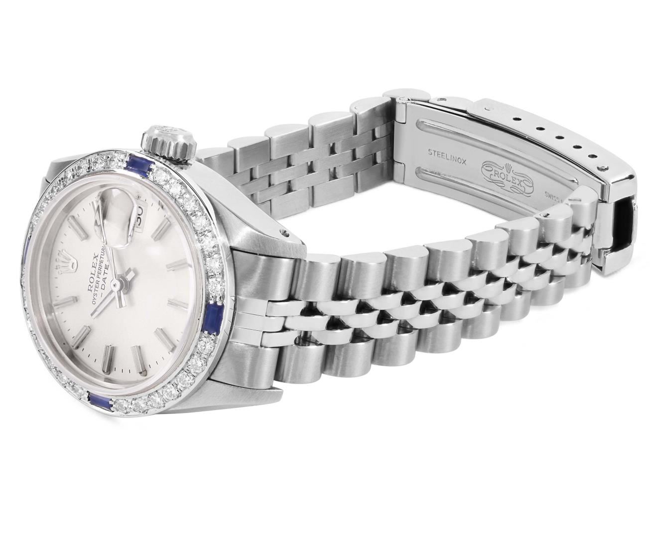 One Rolex Ladies Pre Owned Stainless Steel Date Wristwatch Polished Bright with Satin Finish, Serviced & Electronically Tested, Stainless Steel Case: 26mm, Stainless Steel Crown, Custom Bezel: New 18K White Gold Sapphire Beadset Diamond Bezel, Diamond + Gem Count: 36 Diamonds + 4 Sapphires, Clarity: SI-VS, Color: G to H. Custom Crystal: New Sapphire With Magnified Date Window. Custom Hands: New Luminescent Hands. Rolex Movement: Automatic Winding Movement 2030. Rolex Dial: Factory Silver Dial With Index Hour Markers and Lumi Markers, Dash Track, and Lumi Dots. Date Window: 3 O'Clock Position Date Display, Model: Date. Condition: G-6 Extra Fine. Rolex Bracelet: Stainless Steel Jubilee Band. Bright Polish & Satin Finish. 6.0 Inch Length, Adjustable. Standard Clasp, With Rolex Logo. This Watch Has Been Serviced Time Tested And Is In Excellent Condition. It Is Free Of All Scratches And Dents.