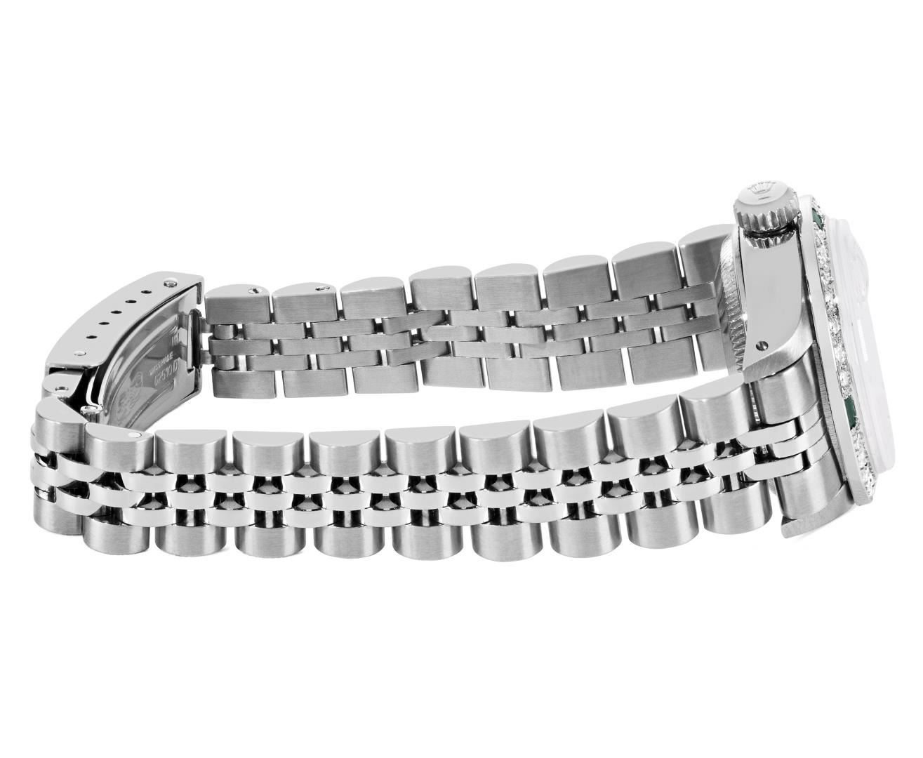 One Rolex Ladies Pre Owned Stainless Steel Date Wristwatch Polished Bright with Satin Finish, Serviced & Electronically Tested, Stainless Steel Case: 26mm, Stainless Steel Crown, Custom Bezel: New 18K White Gold Emerald Beadset Diamond Bezel, Diamond + Gem Count: 36 Diamonds + 4 Emeralds, Clarity: SI-VS, Color: G to H. Custom Crystal: New Sapphire With Magnified Date Window. Custom Hands: New Luminescent Hands. Rolex Movement: Automatic Winding Movement 2035. Rolex Dial: Factory Silver With Index Hour Markers, Lumi Dots, and Dash Tracks. Date Window: 3 O'Clock Position Date Display, Model: Date. Condition: G-6 Extra Fine. Rolex Bracelet: Stainless Steel Jubilee Band. Bright Polish & Satin Finish. 6.0 Inch Length, Adjustable. Standard Clasp, With Rolex Logo. This Watch Has Been Serviced Time Tested And Is In Excellent Condition. It Is Free Of All Scratches And Dents. This Watch Comes With A Rolex Box.