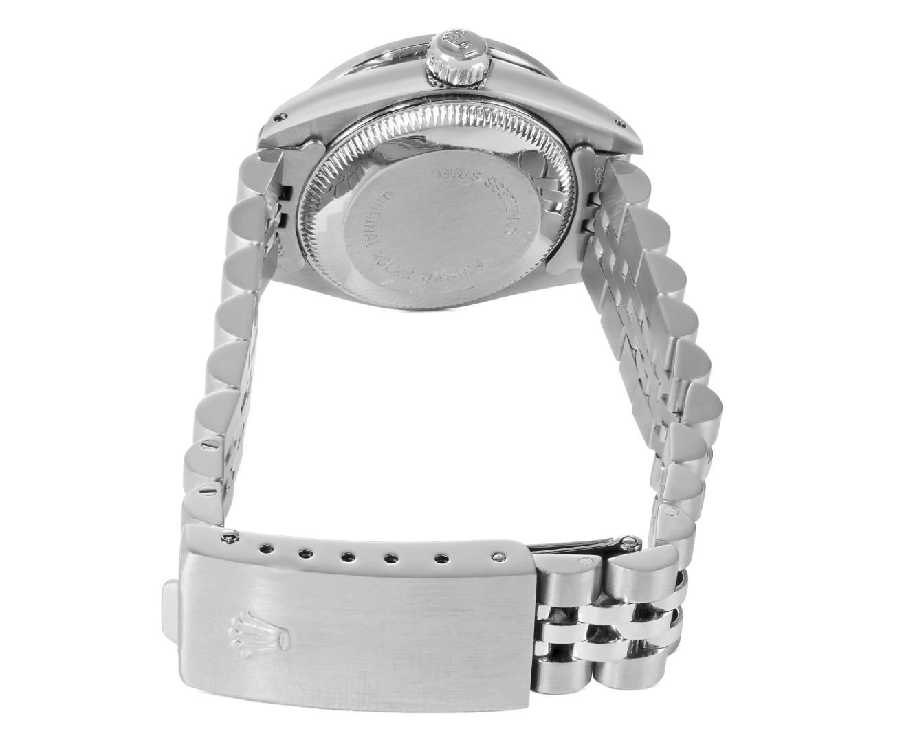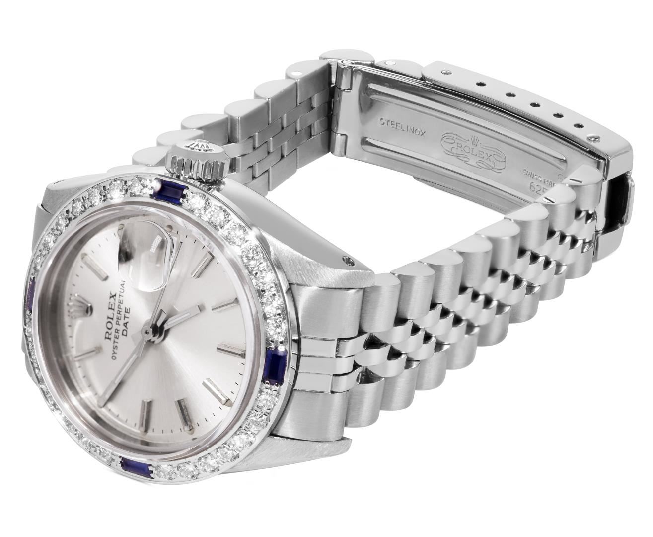 One Rolex Ladies Pre Owned Stainless Steel Date Wristwatch Polished Bright with Satin Finish, Serviced & Electronically Tested, Stainless Steel Case: 26mm, Stainless Steel Crown, Custom Bezel: New 18K White Gold Sapphire Beadset Diamond Bezel, Diamond + Gem Count: 36 Diamonds + 4 Sapphires, Clarity: SI-VS, Color: G to H. Custom Crystal: New Sapphire With Magnified Date Window. Custom Hands: New Luminescent Hands. Rolex Movement: Automatic Winding Movement 2035. Rolex Dial: Factory Silver With Index Hour Markers and Lumi Markers, Dash Track, and Lumi Dots. Date Window: 3 O'Clock Position Date Display, Model: Date. Condition: G-6 Extra Fine. Rolex Bracelet: Stainless Steel Jubilee Band. Bright Polish & Satin Finish. 6.0 Inch Length, Adjustable. Standard Clasp, With Rolex Logo. This Watch Has Been Serviced Time Tested And Is In Excellent Condition. It Is Free Of All Scratches And Dents.