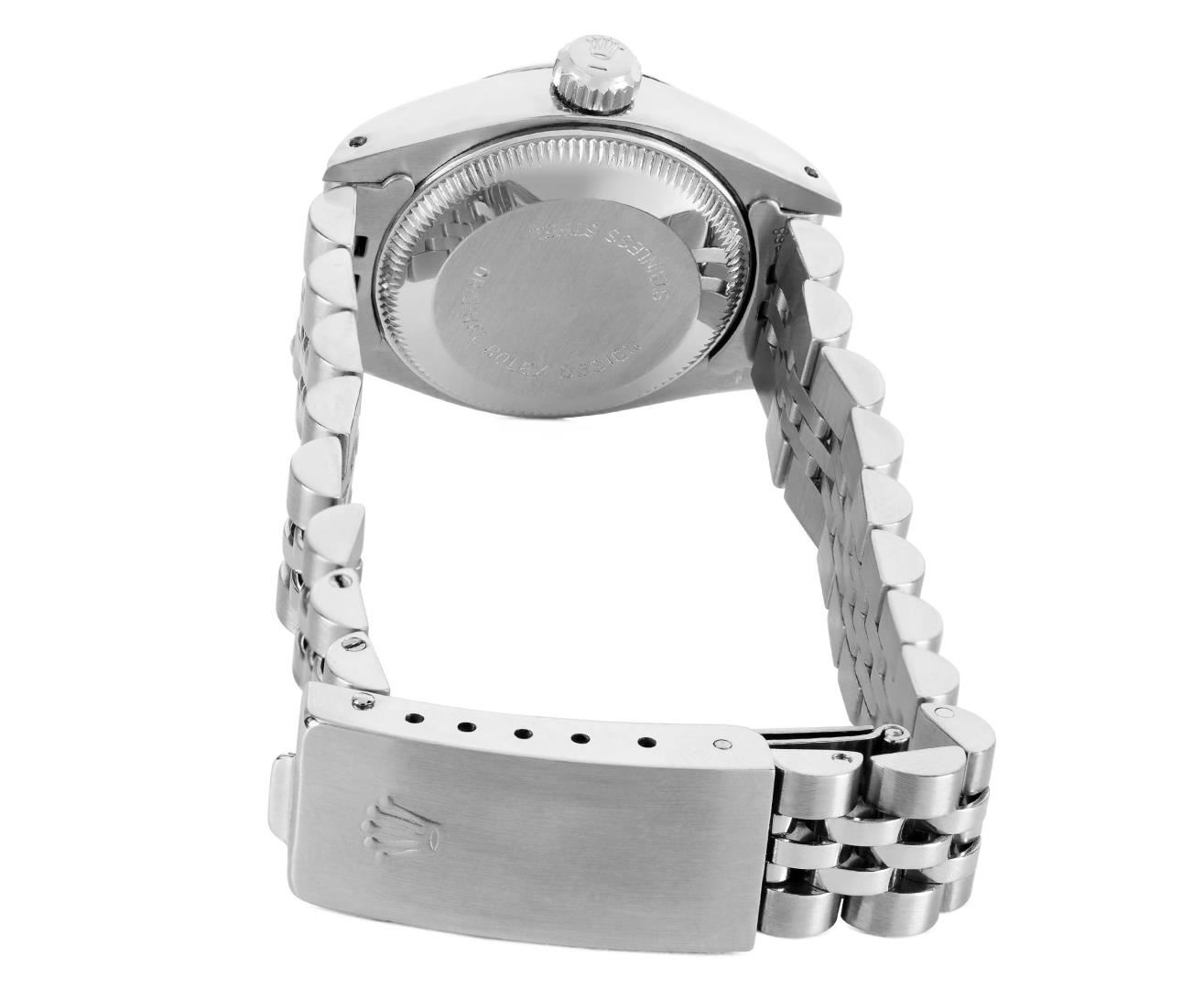 One Rolex Ladies Pre Owned Stainless Steel Date Wristwatch Polished Bright with Satin Finish, Serviced & Electronically Tested, Stainless Steel Case: 26mm, Stainless Steel Crown, 14K White Gold Fluted Bezel, Custom Crystal: New Acrylic With Magnifying Date Window. Custom Hands: New Luminescent Hands. Rolex Movement: Automatic Winding Movement 2035. Rolex Dial: Factory Silver With Index Hour Markers, Dash Tracks, And Lumi Dots. Date Window: 3 O'Clock Position Date Display, Model: Date. Condition: G-6 Extra Fine. Rolex Bracelet: Stainless Steel Jubilee Band. Bright Polish & Satin Finish. 6.0 Inch Length, Adjustable. Standard Clasp, With Rolex Logo. This Watch Has Been Serviced Time Tested And Is In Excellent Condition. It Is Free Of All Scratches And Dents.