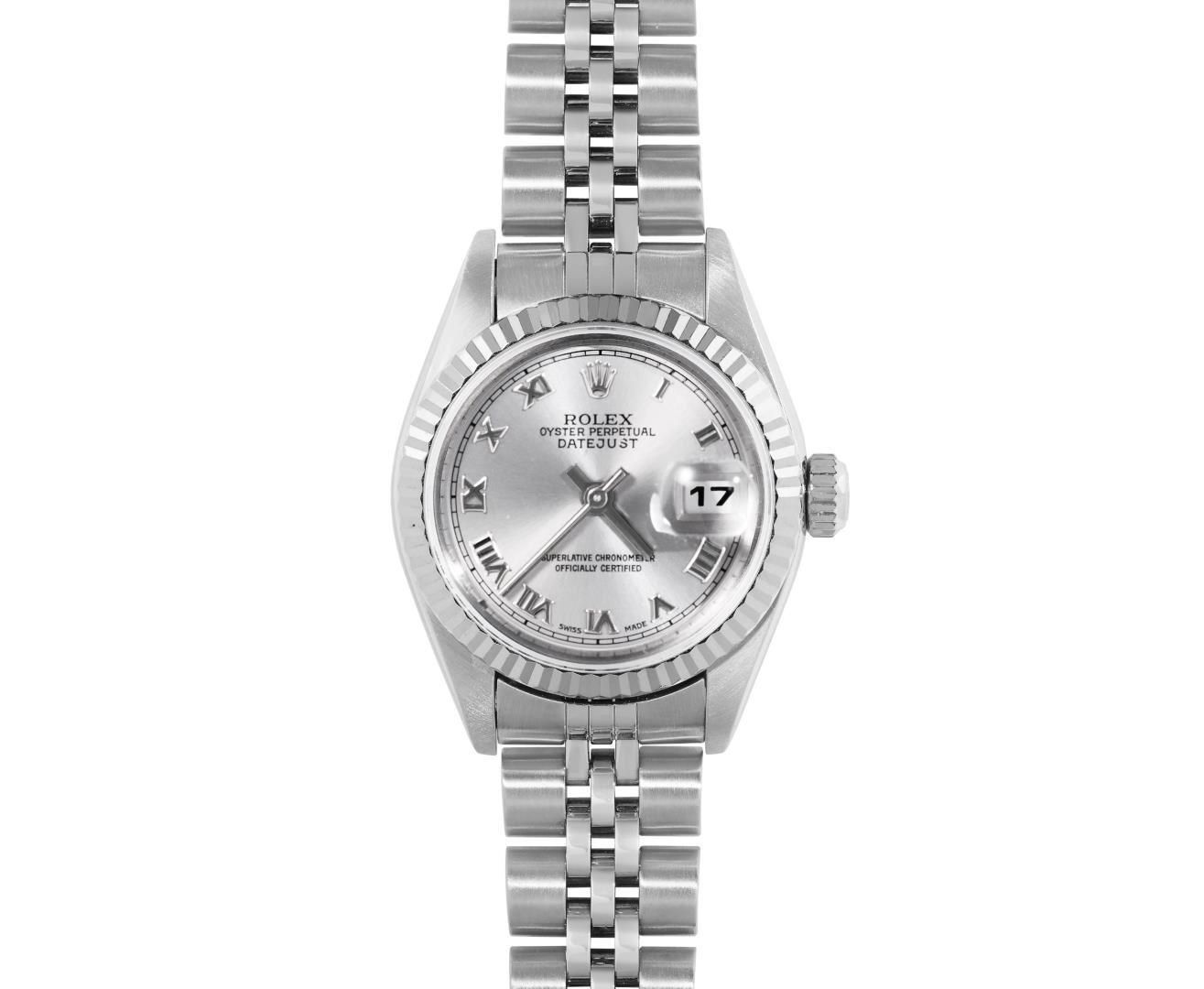 One Rolex Ladies Pre Owned Quickset Stainless Steel Datejust Wristwatch Polished Bright with Satin Finish, Serviced And Electronically Tested, Stainless Steel Case: 26mm, Stainless Steel Crown, Rolex Bezel: 18K White Gold Fluted Bezel. Crystal: Sapphire With Magnified Date Window. Hands: Solid Hands. Rolex Movement: 2235 Automatic Winding Movement. Rolex Dial: Factory Silver With Roman Hour Markers, and Square Track. Date Window: 3 O'Clock Position Date Display, Model: Quickset Datejust. Condition: G-6 Extra Fine. Rolex Bracelet: Stainless Steel Jubilee Band. Bright Polish And Satin Finish. 6.0 Inch Length, Adjustable. Standard Clasp, With Rolex Logo. This Watch Has Been Serviced Time Tested And Is In Excellent Condition. It Is Free Of All Scratches And Dents.