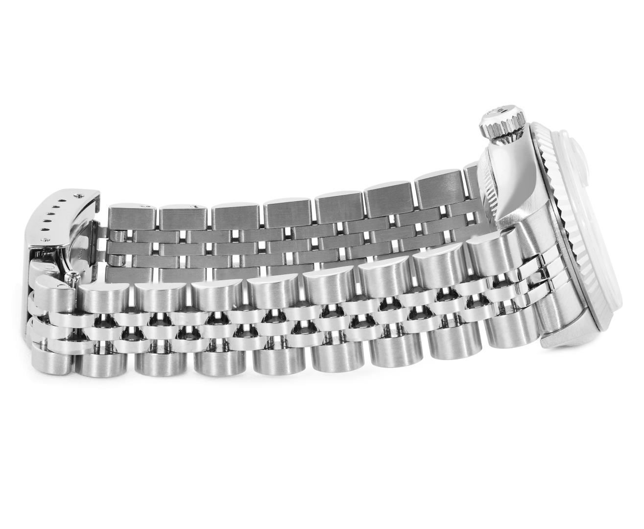 One Rolex Ladies Pre Owned Quickset Stainless Steel Datejust Wristwatch Polished Bright with Satin Finish, Serviced And Electronically Tested, Stainless Steel Case: 26mm, Stainless Steel Crown, Rolex Bezel: 18K White Gold Fluted Bezel. Crystal: Sapphire With Magnified Date Window. Hands: Solid Hands. Rolex Movement: 2235 Automatic Winding Movement. Rolex Dial: Factory Silver With Roman Hour Markers, and Square Track. Date Window: 3 O'Clock Position Date Display, Model: Quickset Datejust. Condition: G-6 Extra Fine. Rolex Bracelet: Stainless Steel Jubilee Band. Bright Polish And Satin Finish. 6.0 Inch Length, Adjustable. Standard Clasp, With Rolex Logo. This Watch Has Been Serviced Time Tested And Is In Excellent Condition. It Is Free Of All Scratches And Dents.