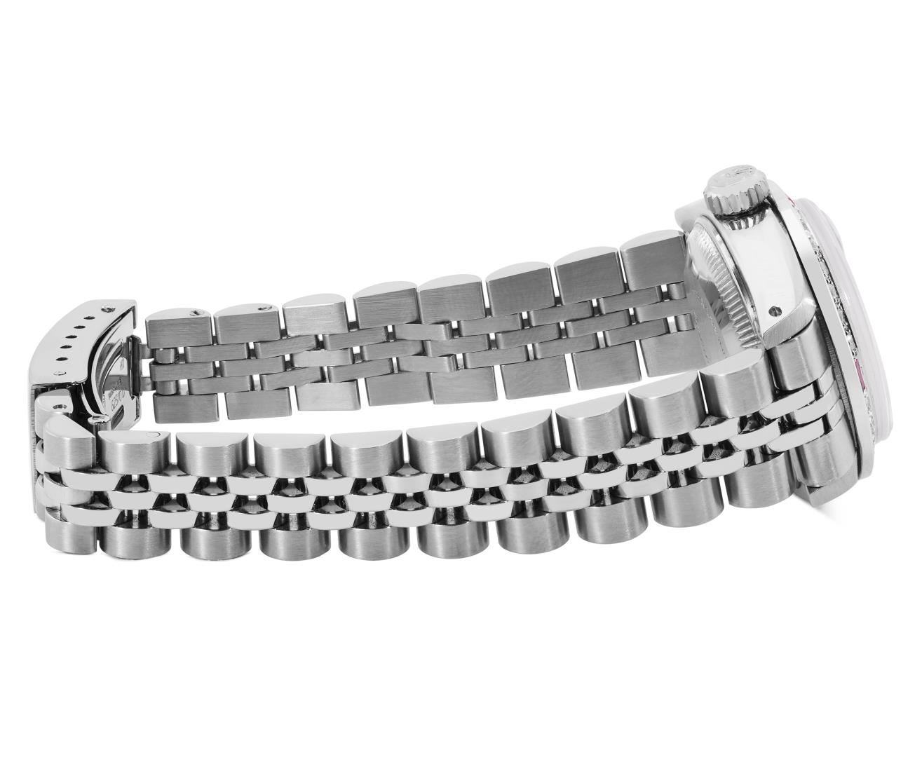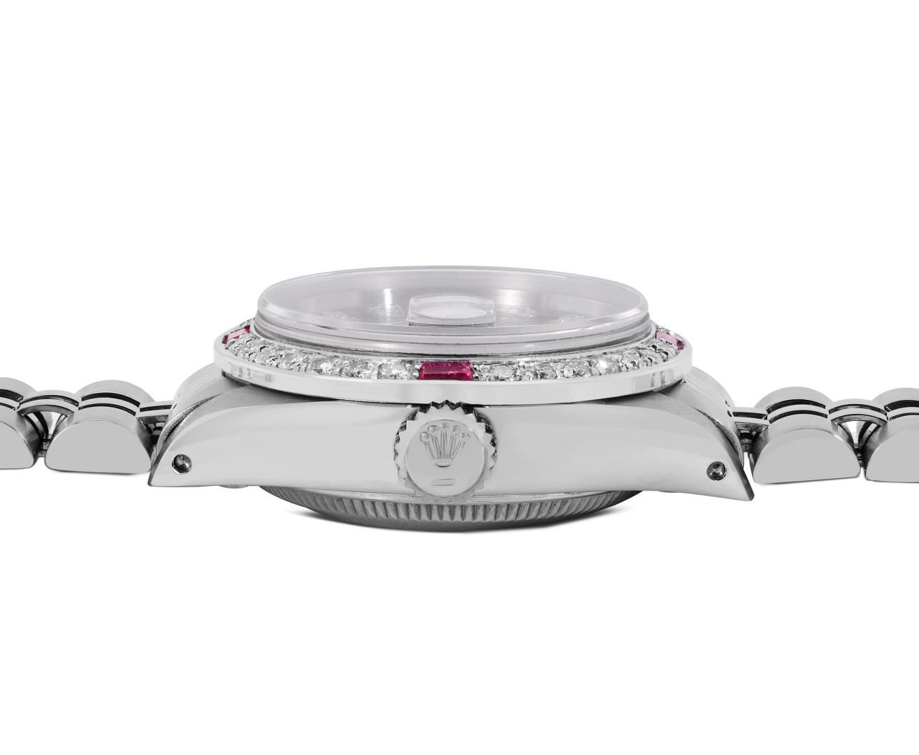 One Rolex Ladies Pre Owned Stainless Steel Date Wristwatch Polished Bright with Satin Finish, Serviced and Electronically Tested, Stainless Steel Case: 26mm, Stainless Steel Crown, Custom Bezel: New 18K White Gold Ruby Beadset Diamond Bezel, Diamond + Gem Count: 36 Diamonds + 4 Rubies. Custom Crystal: New Sapphire With Magnified Date Window. Rolex Movement: Automatic Winding Movement 2035. Custom Dial: Custom Slate Gray Dial With Added Diamond Hour Markers, Dash Tracks, And Lumi Dots. Date Window: 3 O'Clock Position Date Display, Model: Date. Condition: G-6 Extra Fine. Rolex Bracelet: Stainless Steel Jubilee Band. Bright Polish and Satin Finish. 6.0 Inch Length, Adjustable. Standard Clasp, With Rolex Logo. This Watch Has Been Serviced Time Tested And Is In Excellent Condition. It Is Free Of All Scratches And Dents.