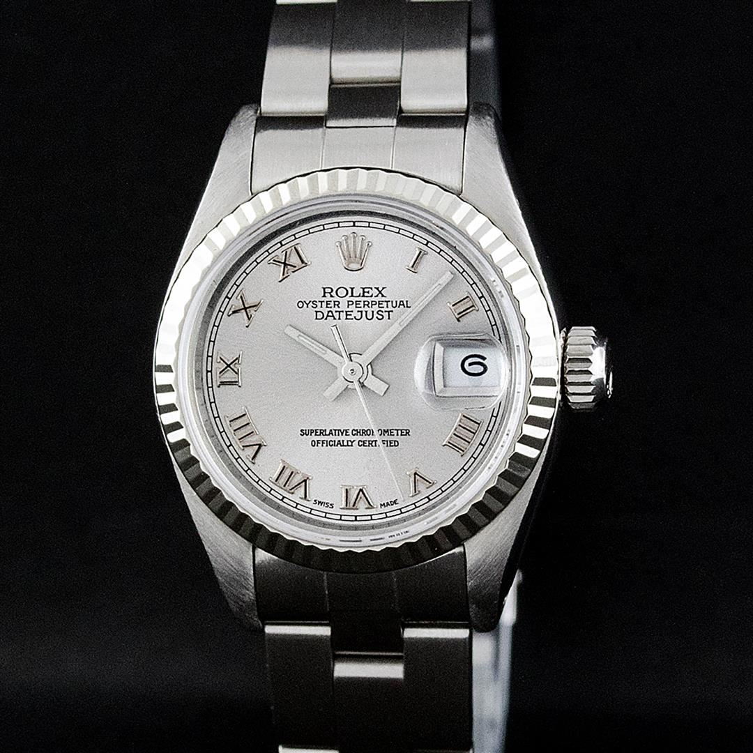 One Ladies Pre Owned Stainless Steel Rolex Datejust Polished Bright with Satin Finish, Serviced & Electronically Tested, Rolex Stainless Steel Case: 26mm, Rolex Stainless Steel Crown, Rolex Bezel: 14K White Gold Bezel. Custom Crystal: New Acrylic With Date Window. Custom Hands: New Luminescent Hands. Rolex Movement: Automatic Winding Movement. Custom Dial: Refinished To Slate Grey Roman Dial With Square Track. Date Window: 3 O'Clock Position Date Display, Model: Datejust. Condition: G-6 Extra Fine. Rolex Bracelet: Stainless Steel Oyster Band. Bright Polish & Satin Finish. 6.0 Inch Length, Adjustable. Standard Clasp, With Rolex Logo. This Watch Has Been Serviced Time Tested And Is In Excellent Condition It Is Free Of All Scratches And Dents.