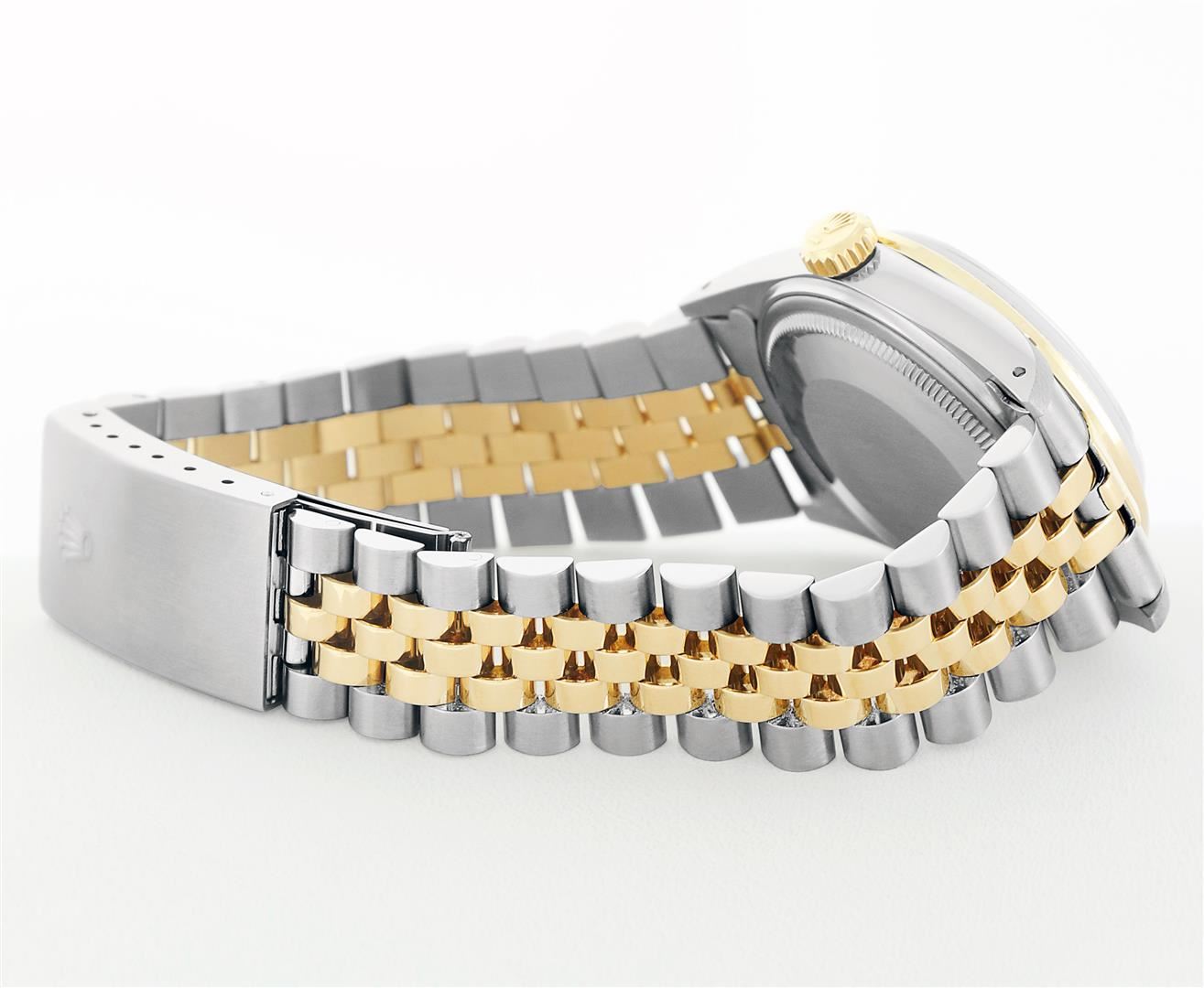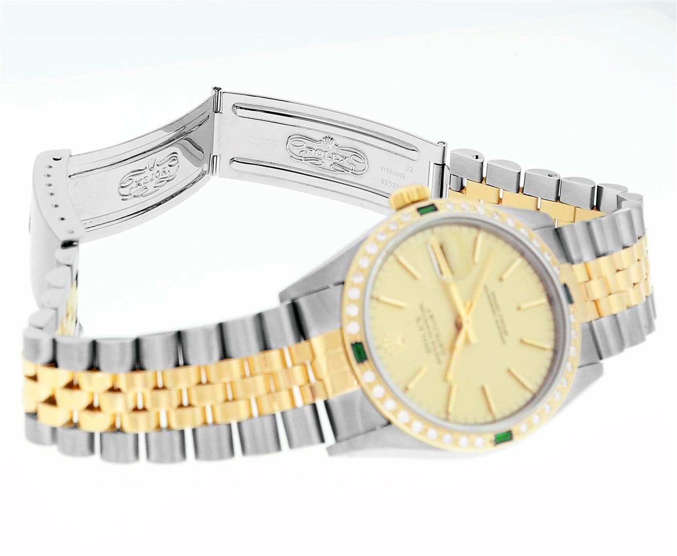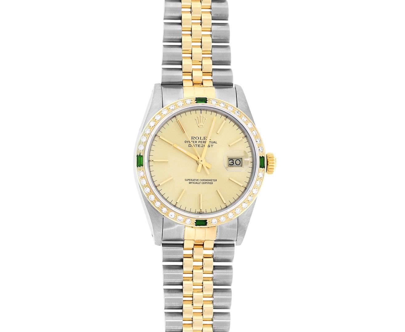 One Mens Rolex Quickset Pre Owned Two Tone 14K Yellow Gold And Stainless Steel Datejust Polished, Serviced & Electronically Tested, Rolex Yellow Gold & Stainless Steel Case: 36mm, Rolex 14K Yellow Gold Crown, Custom Bezel: New 18K Yellow Diamond + Emerald Beadset Bezel, Stone Count: 36 Diamonds + 4 Emeralds, Total Weight.75 Carat, Clarity: SI-VS, Color: G to H. Custom Crystal: New Sapphire With Magnified Date Window. Custom Hands: New Luminecent Hands. Rolex Movement: Automatic Winding Movement 3035. Rolex Dial: Champagne Dial With Index Hour Markers Dash Track And Lumi Dots. Date Window: 3 O'Clock Position Date Display, Quickset, Model: Datejust. Condition: G-6 Extra Fine. Rolex Bracelet: Two Tone 14K Yellow Gold & Stainless Steel Jubilee Band. Bright Polish. 7.0 Inch Length, Adjustable. Standard Clasp, With Rolex Logo. This Watch Has Been Serviced Time Tested And Is In Excellent Condition It Is Free Of All Scratches And Dents.
