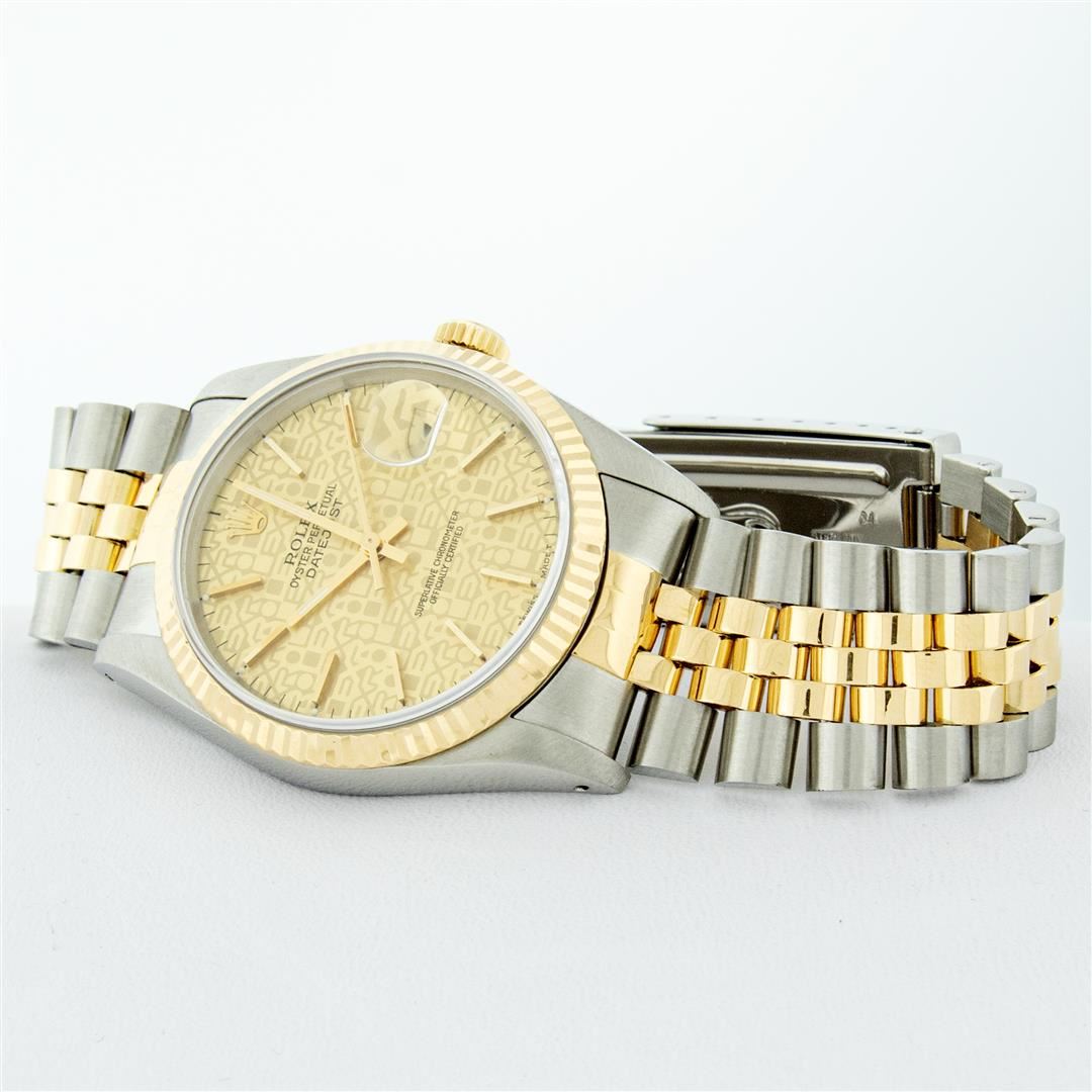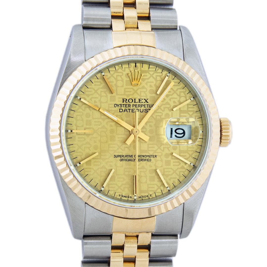 One Mens Rolex Two Tone 18K Yellow Gold And Stainless Steel Datejust Polished, Serviced & Electronically Tested, Yellow Gold & Stainless Steel Case: 36mm, 18K Yellow Gold Crown, Rolex Bezel: 18K Yellow Gold Fluted Bezel. Crystal: Sapphire With Magnified Date Window. Custom Hands: New Luminescent Hands. Rolex Movement: Automatic Winding Movement 3135. Rolex Dial: Champagne Jubilee Dial With Index Hour Markers and Track With Lumi Dots. Date Window: 3 O'Clock Position Date Display, Quickset, Model: Datejust. Condition: G-6 Extra Fine. Rolex Bracelet: Two Tone 18K Yellow Gold & Stainless Steel Jubilee Band. Bright Polish. 7.0 Inch Length, Adjustable. Standard Clasp, With Rolex Logo. This Watch Has Been Serviced Time Tested And Is In Excellent Condition It Is Free Of All Scratches And Dents.