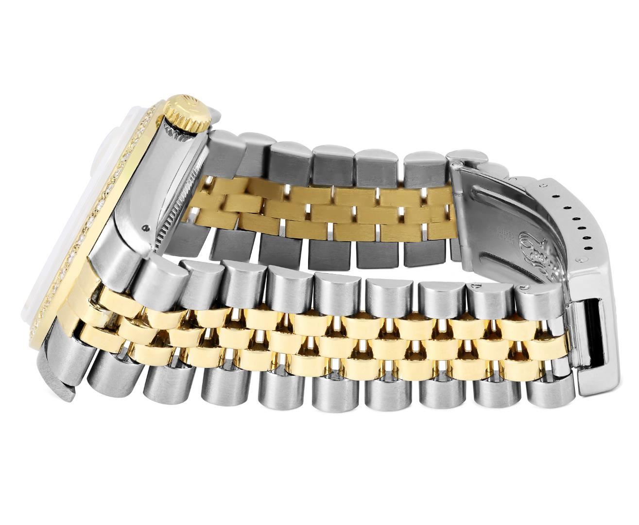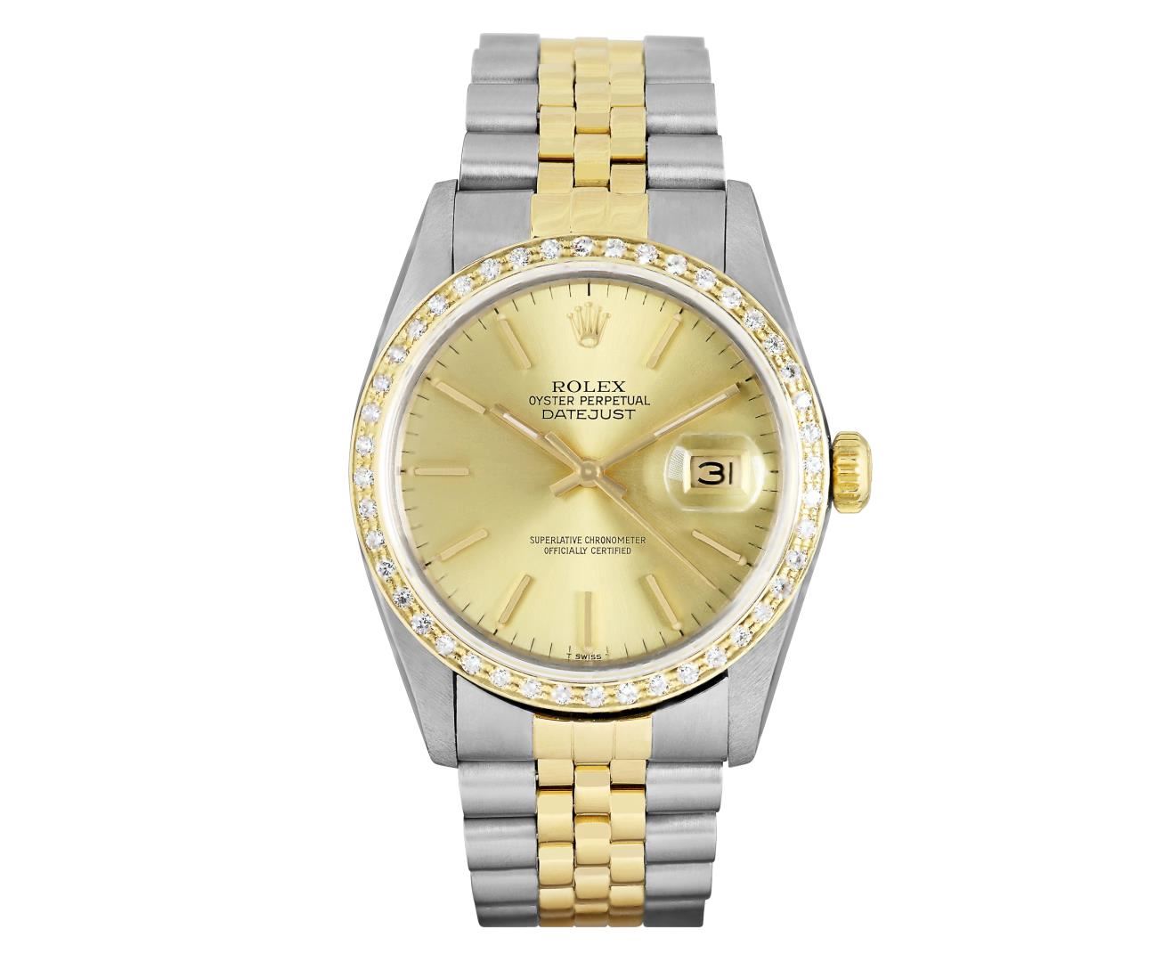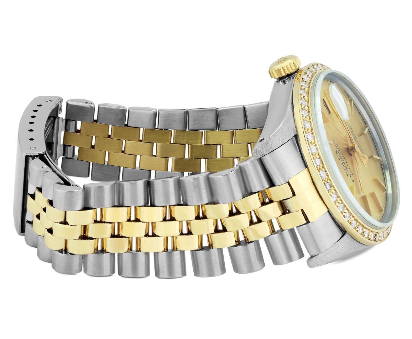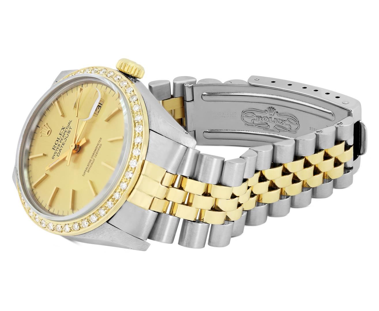 One Mens Pre Owned Yellow Gold Two Tone Rolex Datejust Polished, Serviced & Electronically Tested, Rolex Yellow Gold And Stainless Steel Case: 36mm, Rolex Yellow Gold Crown, Custom Bezel: New 18K Yellow Gold Beadset Diamond Bezel, Diamond Count: 44 Diamonds. Custom Crystal: New Sapphire With Magnified Date Window. Custom Hands: New Luminecent Hands. Rolex Movement: Automatic Winding Movement 3035. Rolex Dial: Champagne Dial With Index Hour Markers and Dash Track With Lumi Dots. Date Window: 3 O'Clock Position Date Display, Quickset, Model: Quickset Datejust. Condition: G-6 Extra Fine. Rolex Bracelet: Two Tone Yellow Gold & Stainless Steel Jubilee Band. Bright Polish. 7.0 Inch Length, Adjustable. Standard Clasp, With Rolex Logo. This Watch Has Been Serviced Time Tested And Is In Excellent Condition It Is Free Of All Scratches And Dents.