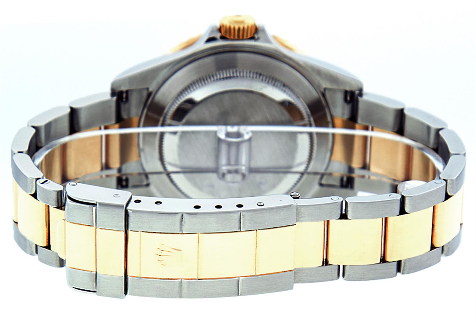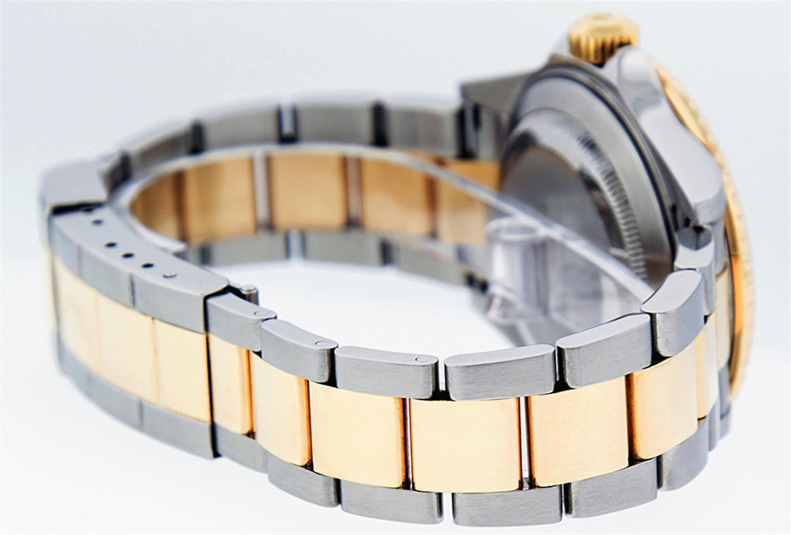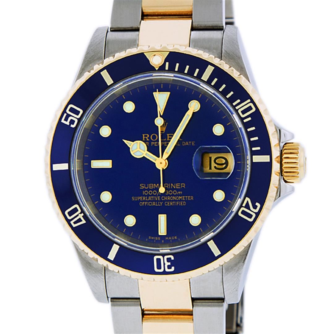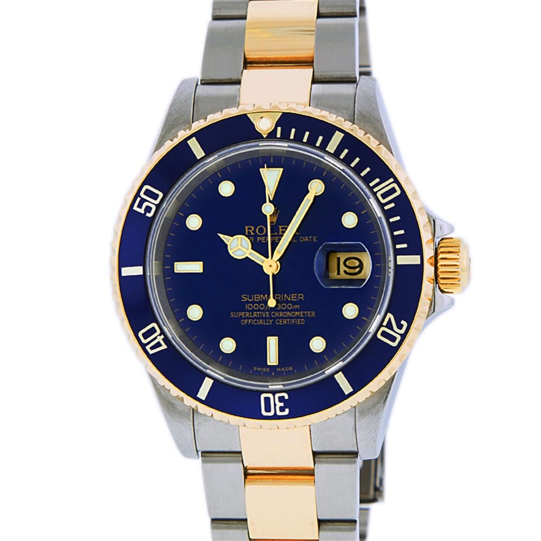 One Mens Pre Owned Rolex 18K Yellow Gold And Stainless Steel Two Tone Submariner With Date Polished, Serviced & Electronically Tested, Rolex Stainless Steel Case: 40mm, Rolex Yellow Gold Crown, Rolex Bezel: Yellow Gold Rotatable Bezel With Blue Insert. Crystal: Sapphire With Magnified Date Window Lens. Rolex Movement: Automatic Winding Movement Caliber 3135. Rolex Dial: Rolex Blue Submariner Dial with Luminous Index Hour Markers, Date Window: 3 O'Clock Position Date Display, Model: Submariner, Quickset, Condition: G-6 Extra Fine. Rolex Bracelet: Stainless Steel and Yellow Gold Oyster Band With Gold Through The Buckle. Bright Polish & Satin Finish. 7.0 Inch Length, Adjustable. Standard Yellow Gold Clasp, With Rolex Logo.