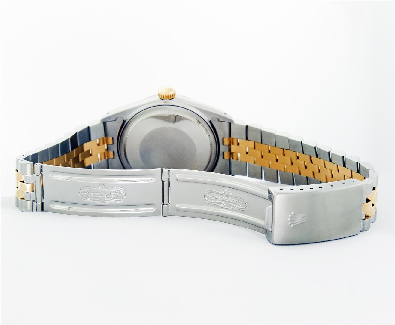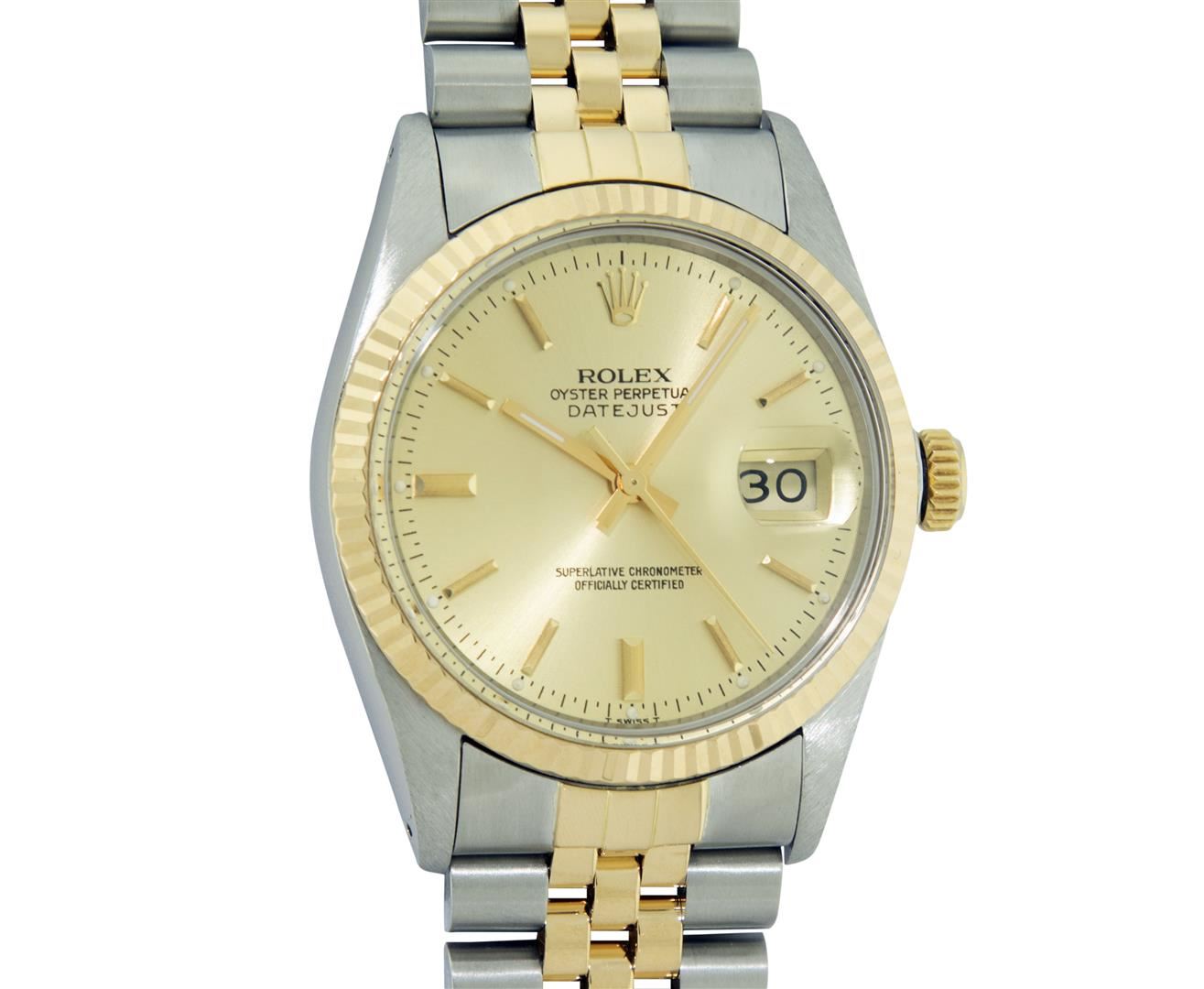 One Mens Rolex Pre Owned 14K Two Tone Yellow Gold And Stainless Steel Datejust Polished, Serviced & Electronically Tested, Yellow Gold & Stainless Steel Case: 36mm, Yellow Gold Crown, Rolex Bezel: 14K Yellow Gold Fluted Bezel. Custom Crystal: New Acrylic With Magnified Date Window. Custom Hands: New Luminescent Hands. Rolex Movement: Automatic Winding Movement 3035. Rolex Dial: Champagne Index Dial With Dash Track & Lumi Dots. Date Window: 3 O'Clock Position Date Display, Quickset, Model: Datejust. Condition: G-6 Extra Fine. Rolex Bracelet: Two Tone 14K Yellow Gold And Stainless Steel Jubilee Band. Bright Polish. 7.0 Inch Length, Adjustable. Standard Clasp, With Rolex Logo. This Watch Has Been Serviced Time Tested And Is In Excellent Condition It Is Free Of All Scratches And Dents.