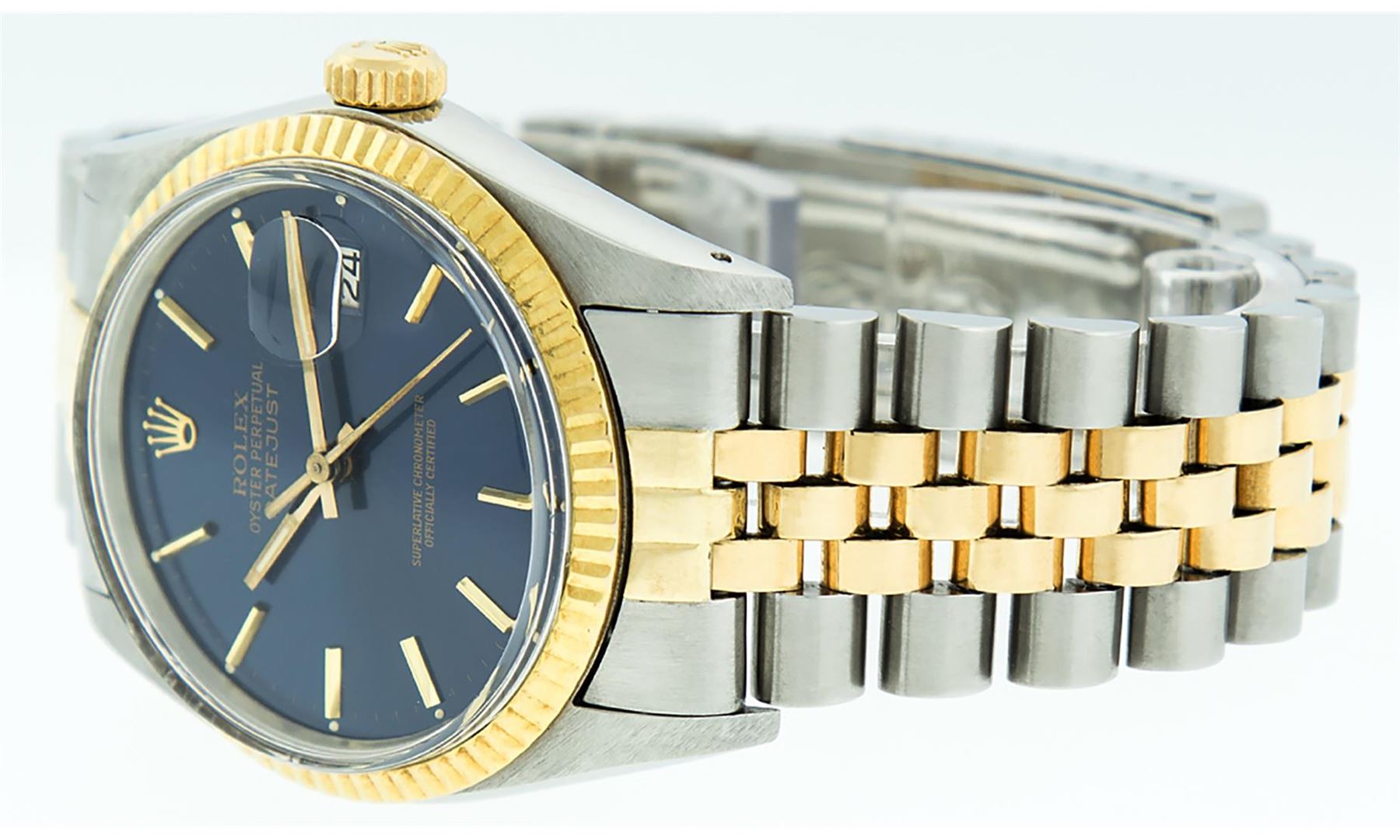 One Mens Rolex Pre Owned Two Tone 14K Yellow Gold And Stainless Steel Datejust Polished, Serviced & Electronically Tested, Rolex Yellow Gold & Stainless Steel Case: 36mm, Rolex Yellow Gold Crown, Rolex Bezel: 14K Yellow Gold Fluted Bezel. Custom Crystal: New Acrylic With Magnified Date Window. Rolex Hands: Luminecent Hands. Rolex Movement: Automatic Winding Movement 3035. Rolex Dial: Blue Index Dial With Index Track. Date Window: 3 O'Clock Position Date Display, Quickset, Model: Datejust. Condition: G-6 Extra Fine. Rolex Bracelet: Two Tone 14K Yellow Gold & Stainless Steel Jubilee Band. Bright Polish. 7.0 Inch Length, Adjustable. Standard Clasp, With Rolex Logo. This Watch Has Been Serviced Time Tested And Is In Excellent Condition It Is Free Of All Scratches And Dents.