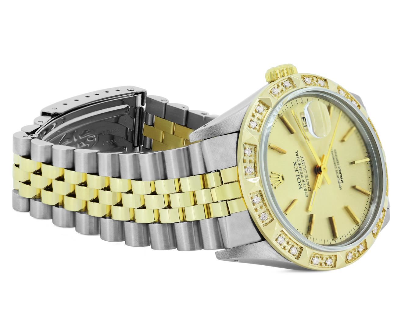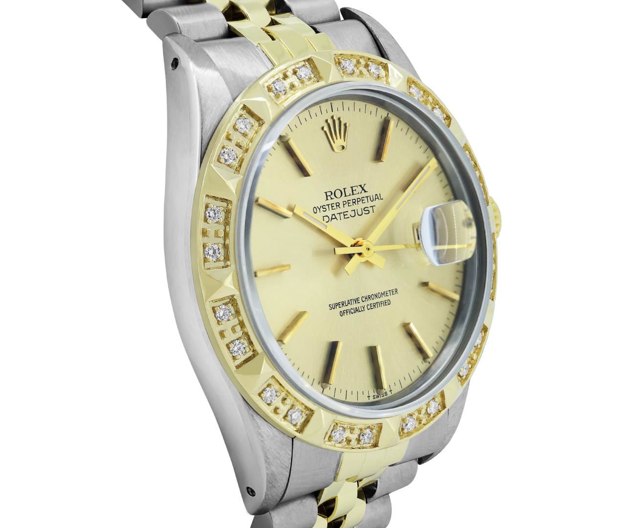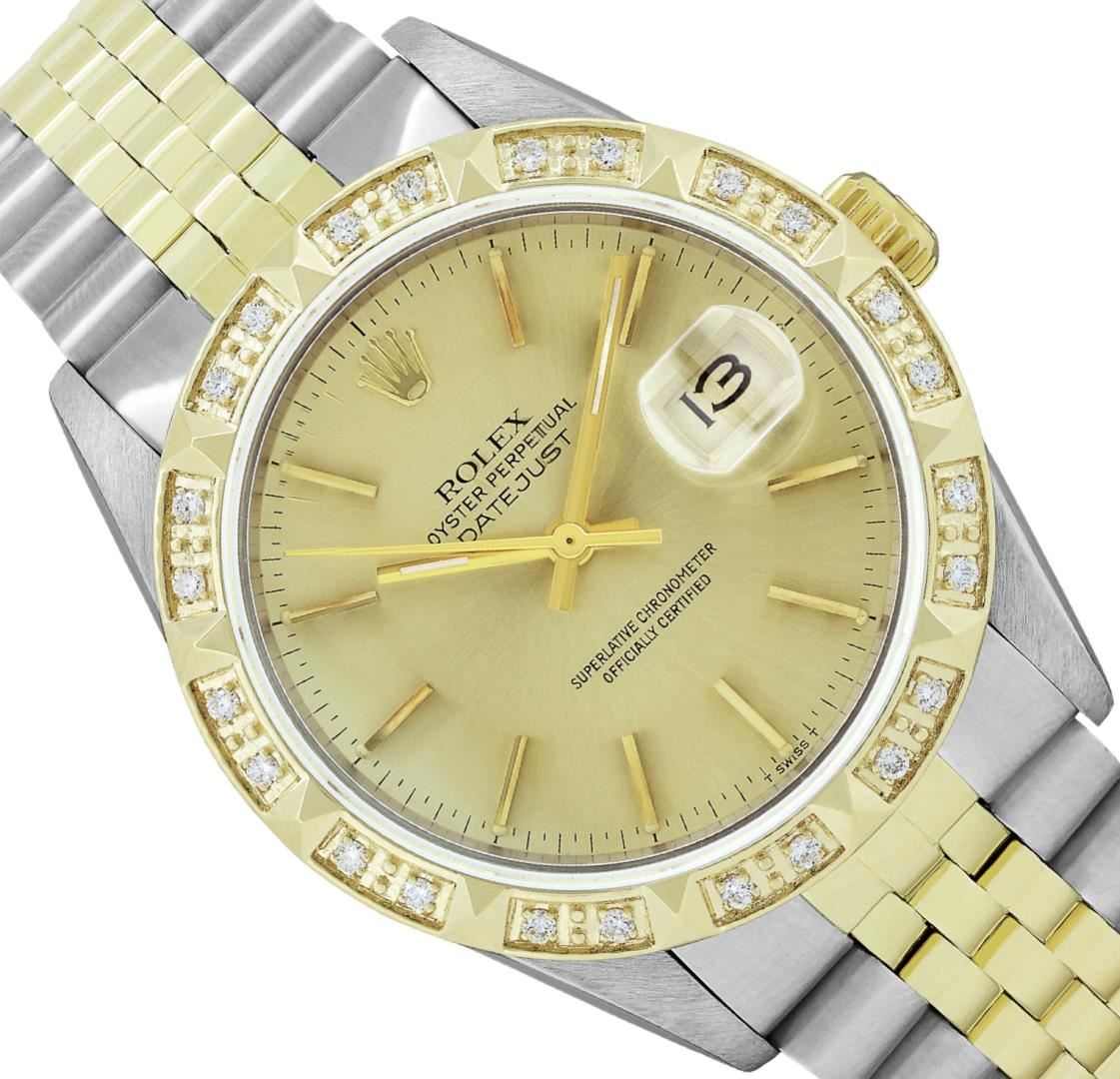 One Mens Pre Owned Yellow Gold And Steel Two Tone Rolex Datejust Polished, Serviced & Electronically Tested, Rolex Yellow Gold & Stainless Steel Case: 36mm, Rolex Yellow Gold Crown, Custom Bezel: New 18K Yellow Gold Pyramid Diamond Bezel, Diamond Count: 24 Diamonds On Dial, Total Weight .75 Carat, Clarity: SI-VS, Color: G to H. Custom Crystal: New Sapphire With Magnified Date Window. Custom Hands: New Luminescent Hands. Rolex Movement: Automatic Winding Movement 3035. Rolex Dial: Champagne Dial With Index Hour Markers and Small Track With Lumi Dots. Date Window: 3 O'Clock Position Date Display, Quickset, Model: Quickset Datejust. Condition: G-6 Extra Fine. Rolex Bracelet: Two Tone Yellow Gold & Stainless Steel Jubilee Band. Bright Polish. 7.0 Inch Length, Adjustable. Fold Clasp, With Rolex Logo. This Watch Has Been Serviced Time Tested And Is In Excellent Condition It Is Free Of All Scratches And Dents. This Watch Comes With A Rolex Box.