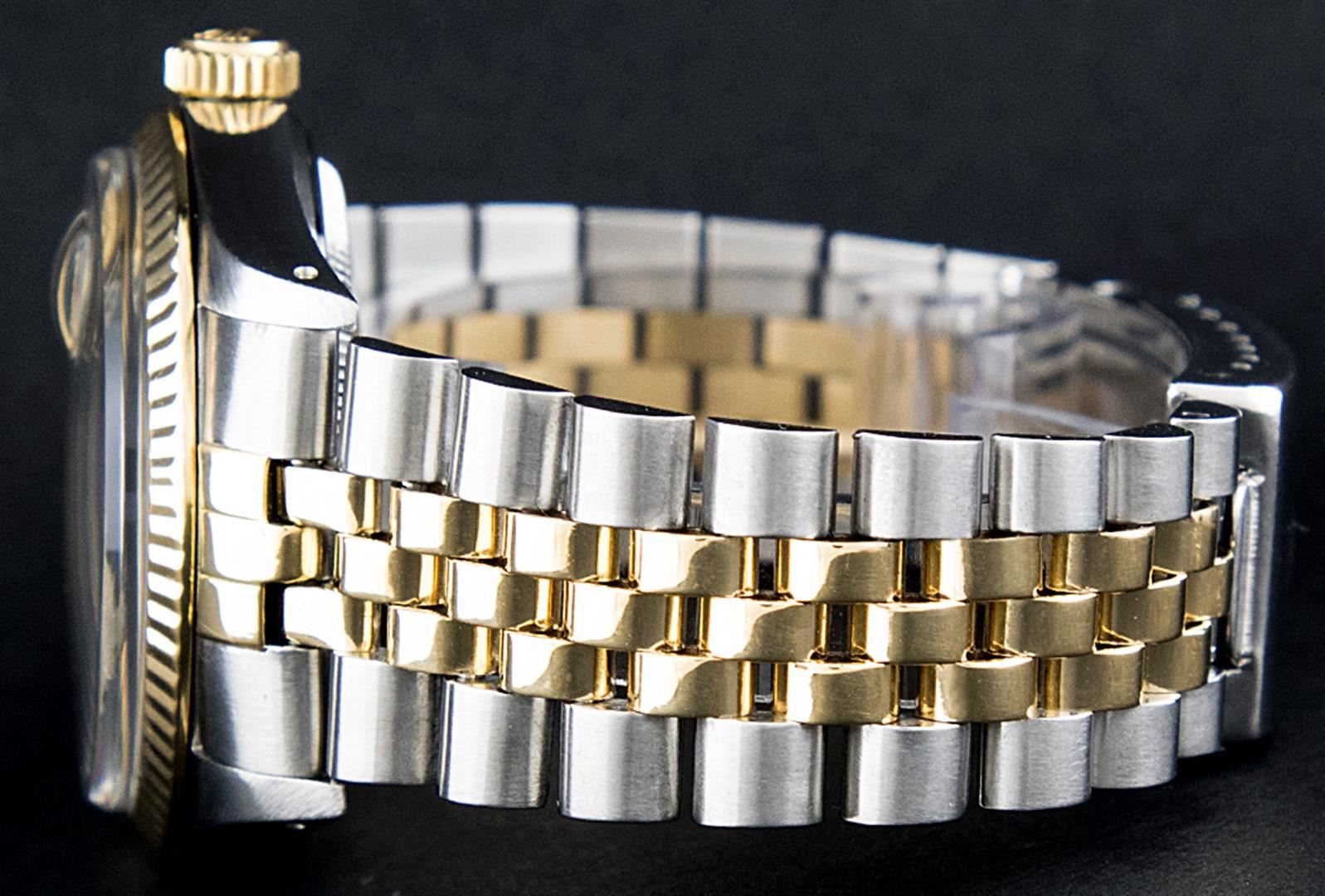 One Mens Rolex Pre Owned 14K Two Tone Yellow Gold And Stainless Steel Datejust Polished, Serviced & Electronically Tested, Rolex Yellow Gold & Stainless Steel Case: 36mm, Rolex Yellow Gold Crown, Rolex Bezel: 14K Yellow Gold Fluted Bezel. Custom Crystal: New Acrylic With Magnified Date Window. Custom Hands: New Luminescent Hands. Rolex Movement: Automatic Winding Movement 3035. Rolex Dial: Champagne Tapestry Index Dial With Roman Square Track. Date Window: 3 O'Clock Position Date Display, Quickset, Model: Datejust. Condition: G-6 Extra Fine. Rolex Bracelet: Two Tone 14K Yellow Gold & Stainless Steel Jubilee Band. Bright Polish. 7.0 Inch Length, Adjustable. Standard Clasp, With Rolex Logo. This Watch Has Been Serviced Time Tested And Is In Excellent Condition It Is Free Of All Scratches And Dents.