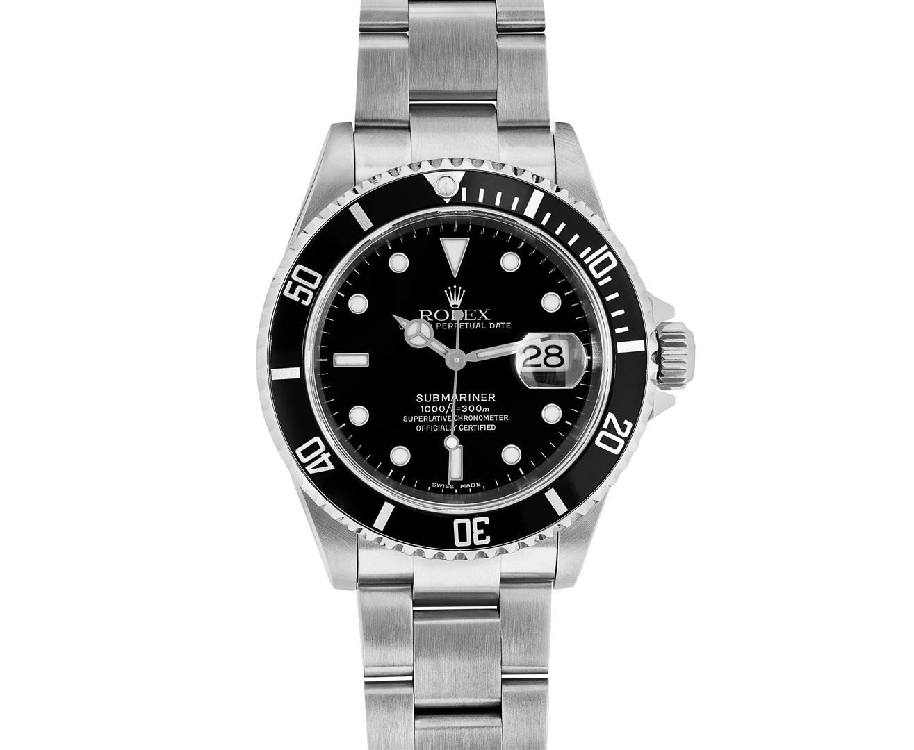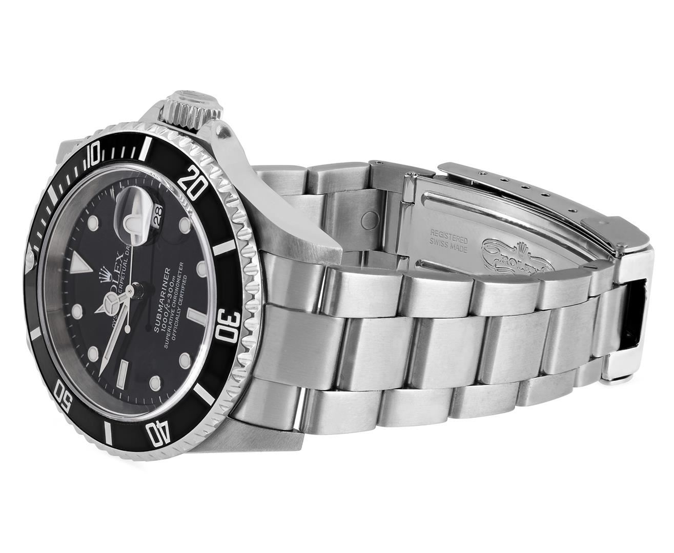 One Mens Pre Owned Rolex Stainless Steel Submariner With Date Polished, Serviced & Electronically Tested, Rolex Stainless Steel Case: 40mm, Rolex Stainless Steel Crown, Rolex Bezel: Stainless Steel Rotatable Bezel With Black Insert. Crystal: Sapphire With Magnified Date Window. Rolex Movement: Automatic Winding Movement Caliber 3135. Rolex Dial: Black Submariner Dial with Luminous Index Hour Markers And Dash Track. Date Window: 3 O'Clock Position Date Display, Model: No Holes Date Submariner, Quickset, Condition: G-6 Extra Fine. Rolex Bracelet: Stainless Steel Oyster Band. Bright Polish & Satin Finish. 7.0 Inch Length, Adjustable. Fold Clasp, With Rolex Logo. This Watch Comes With A Rolex Box.