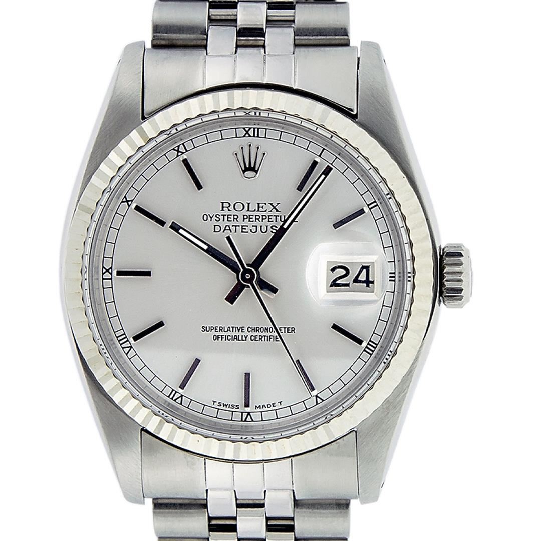 One Mens Pre Owned Rolex Stainless Steel Rolex Datejust Polished, Serviced & Electronically Tested, Rolex Stainless Steel Case: 36mm, Rolex Stainless Steel Crown, Rolex Bezel: 14K White Gold Fluted Bezel. Custom Crystal: New Acrylic With Magnified Date Window. Hands: Luminescent Hands. Rolex Movement: Automatic Winding Movement 3035. Rolex Dial: Silver Index With Roman Square Track. Date Window: 3 O'Clock Position Date Display, Quickset, Model: Datejust, Condition: G-6 Extra Fine. Rolex Bracelet: Stainless Steel Jubilee Band. Bright Polish & Satin Finish. 7.0 Inch Length, Adjustable. Standard Clasp, With Rolex Logo. This Watch Has Been Serviced Time Tested And Is In Excellent Condition It Is Free Of All Scratches And Dents.