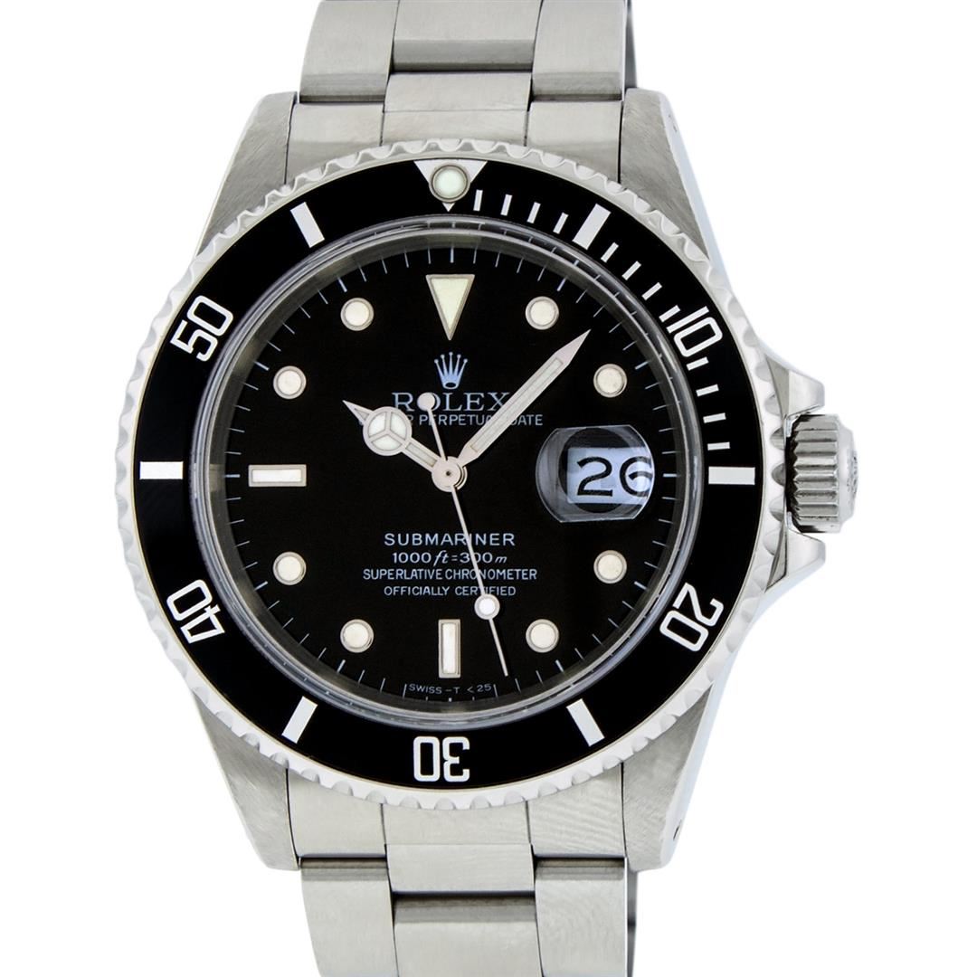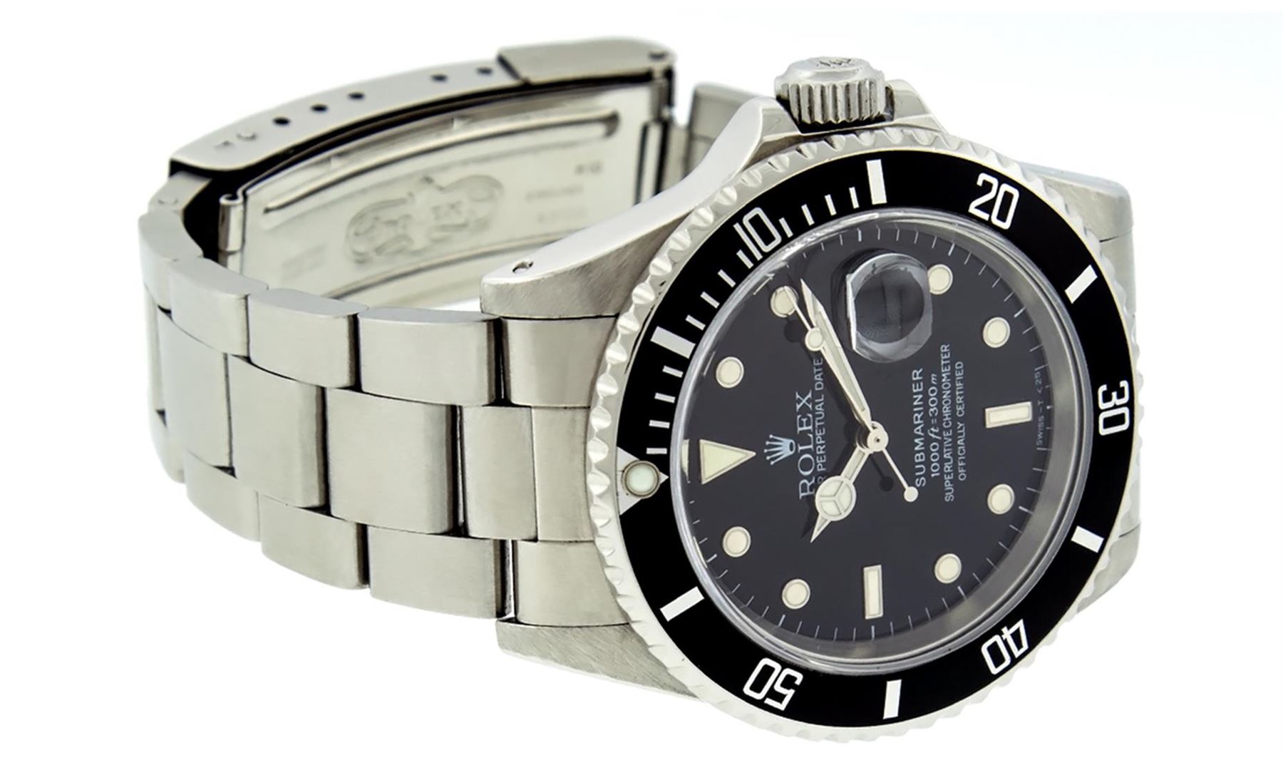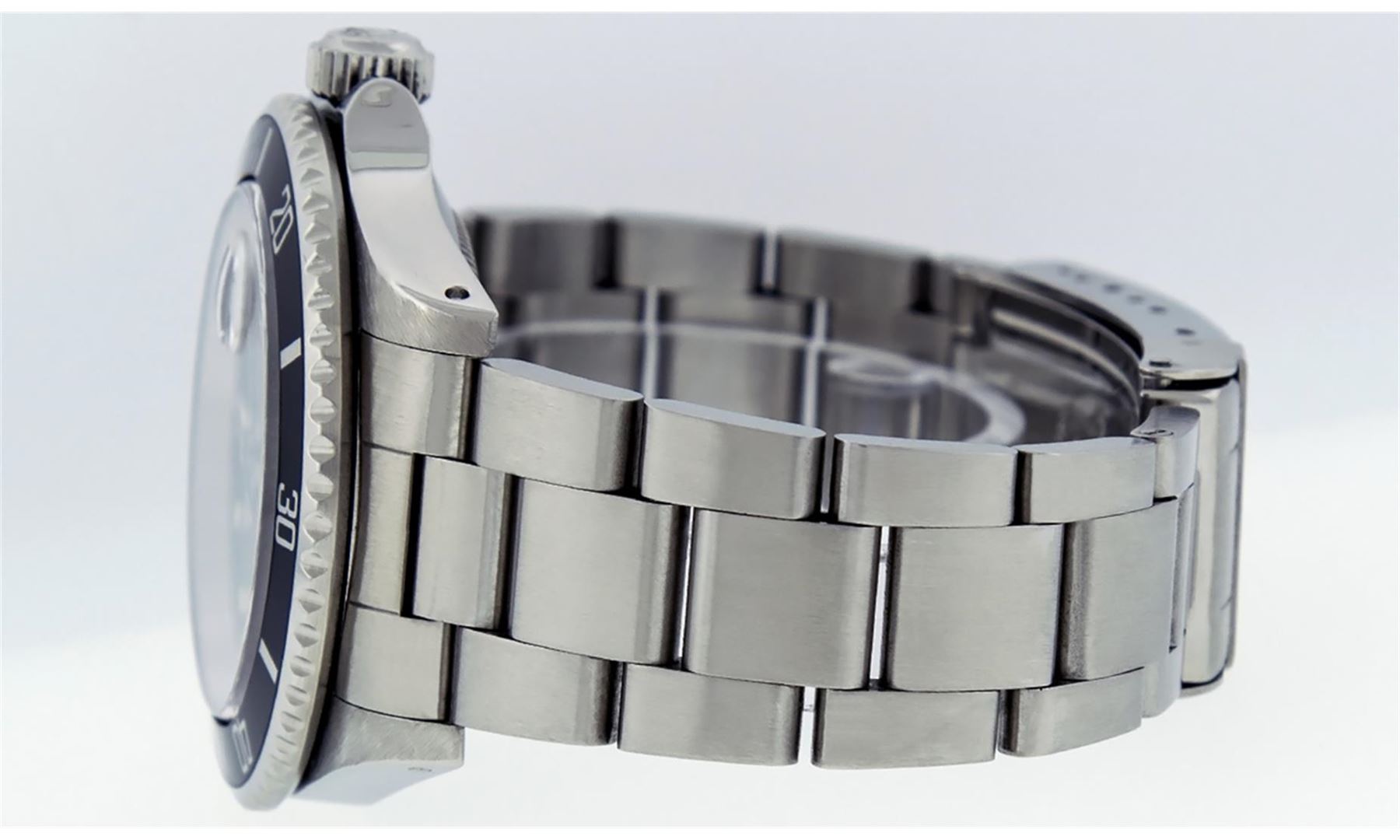 One Mens Pre Owned Rolex Stainless Steel Submariner With Date Polished, Serviced & Electronically Tested, Rolex Stainless Steel Case: 40mm, Rolex Stainless Steel Crown, Rolex Bezel: Stainless Steel Rotatable Bezel With Black Insert. Crystal: Sapphire With Magnified Date Window. Rolex Movement: Automatic Winding Movement Caliber 3135. Rolex Dial: Black Submariner Dial, Hands: Submariner Hands. Date Window: 3 O'Clock Position Date Display, Model: Submariner, Quickset, Condition: G-6 Extra Fine. Rolex Bracelet: Stainless Steel Oyster Band. Bright Polish & Satin Finish. 7.0 Inch Length, Adjustable. Standard Clasp, With Rolex Logo.