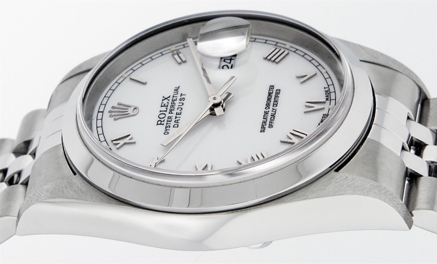 One Mens Rolex Pre Owned Quickset Stainless Steel Datejust Polished Bright with Satin Finish, Serviced & Electronically Tested, Rolex Stainless Steel Case: 36mm, Rolex Stainless Steel Crown, Rolex Bezel: Stainless Steel Smooth Bezel. Crystal: Sapphire With Magnified Date Window. Rolex Movement: Automatic Winding Movement Caliber 3135. Rolex Dial: White Roman With Square Track and Lumi Dot. Date Window: 3 O'Clock Position Date Display, Quickset, Model: Quickset Datejust. Condition: G-6 Extra Fine. Rolex Bracelet: Stainless Steel Jubilee Band. Bright Polish & Satin Finish. 7.0 Inch Length, Adjustable. Standard Clasp, With Rolex Logo. This Pre Owned Watch Has Been Serviced Time Tested And Is In Excellent Condition It Is Free Of All Scratches And Dents.