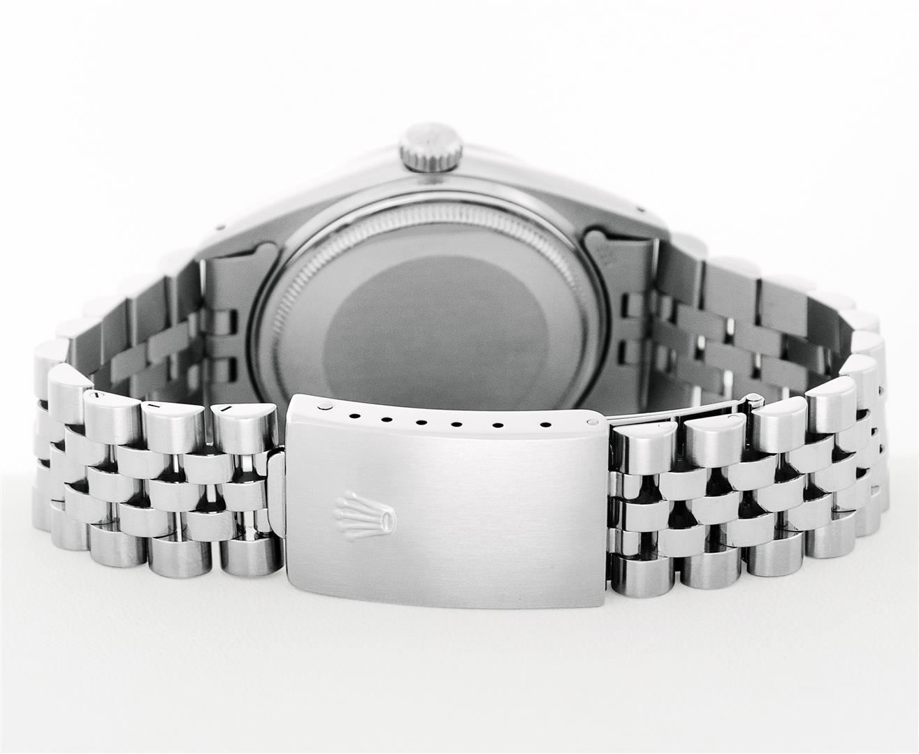 One Mens Pre Owned Stainless Steel Rolex Datejust Polished Bright with Satin Finish, This Watch Has Been Serviced & Electronically Tested, Rolex Stainless Steel Case: 36mm, Rolex Stainless Steel Crown, Custom Bezel: New 18K White Gold Emerald Beadset Diamond Bezel, Diamond + Gem Count: 36 Diamonds + 4 Emeralds, Total Weight 1.00 Carat, Clarity: SI-VS, Color: G to H. Custom Crystal: New Sapphire With Magnified Date Window. Custom Hands: New Luminescent Hands. Rolex Movement: Automatic Winding Movement 3035. Rolex Dial: Silver Index With Dash Track & Lumi Dots. Date Window: 3 O'Clock Position Date Display, Quickset, Model: Datejust, Condition: G-6 Extra Fine. Rolex Bracelet: Stainless Steel Jubilee Band. Bracelet: 7.0 Inch Length, Adjustable. Standard Clasp, With Rolex Logo. This Watch Has Been Serviced Time Tested And Is In Excellent Condition It Is Free Of All Scratches And Dents.