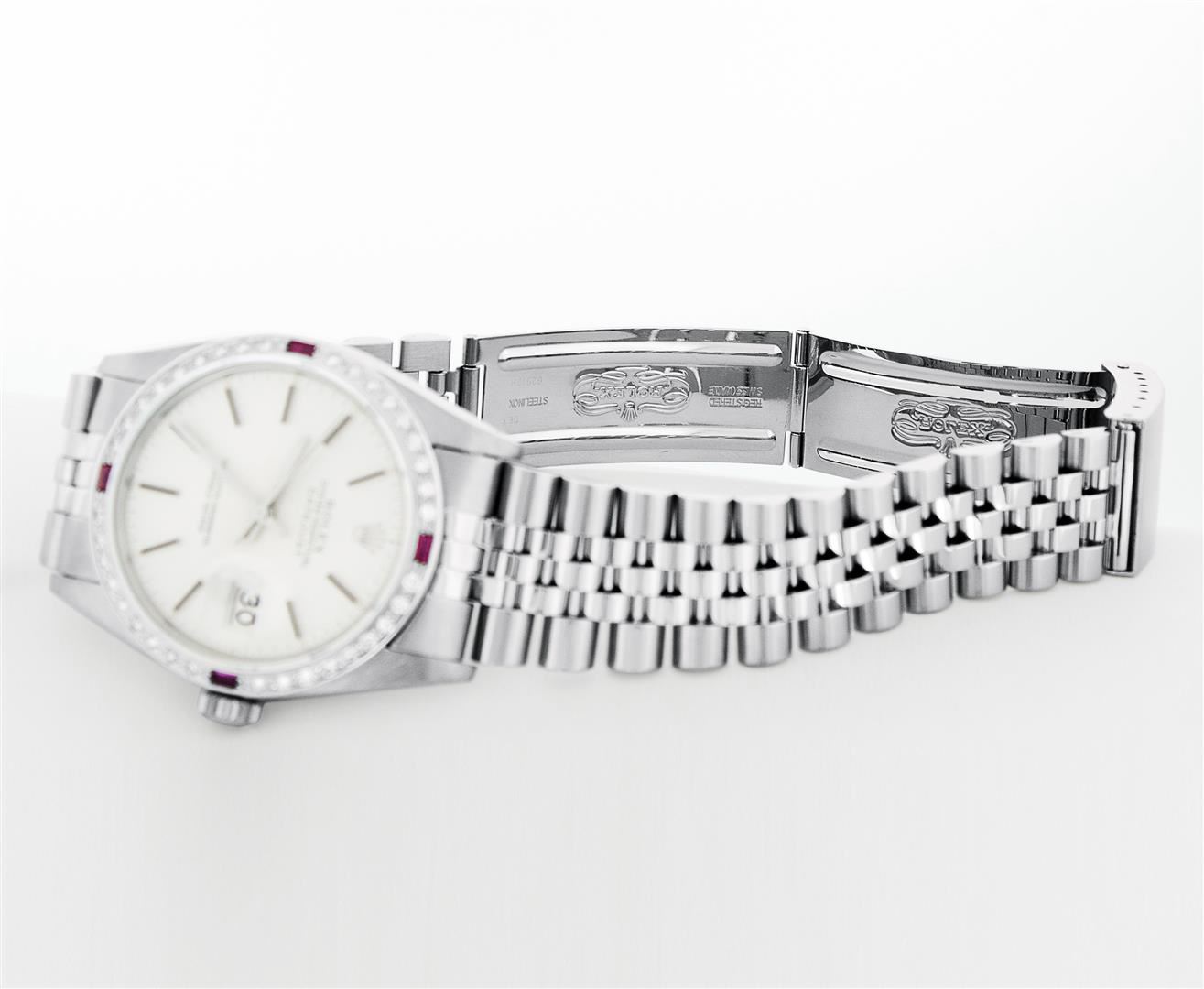 One Mens Pre Owned Stainless Steel Rolex Datejust Polished Bright with Satin Finish, This Watch Has Been Serviced & Electronically Tested, Rolex Stainless Steel Case: 36mm, Rolex Stainless Steel Crown, Custom Bezel: New 18K White Gold Ruby Beadset Diamond Bezel, Diamond + Gem Count: 36 Diamonds + 4 Rubies, Total Weight 1.00 Carat, Clarity: SI-VS, Color: G to H. Custom Crystal: New Sapphire With Magnified Date Window. Custom Hands: New Luminescent Hands. Rolex Movement: Automatic Winding Movement 3035. Rolex Dial: Silver Index With Dash Track & Lumi Dots. Date Window: 3 O'Clock Position Date Display, Quickset, Model: Datejust, Condition: G-6 Extra Fine. Rolex Bracelet: Stainless Steel Jubilee Band. Bracelet: 7.0 Inch Length, Adjustable. Standard Clasp, With Rolex Logo. This Watch Has Been Serviced Time Tested And Is In Excellent Condition It Is Free Of All Scratches And Dents.