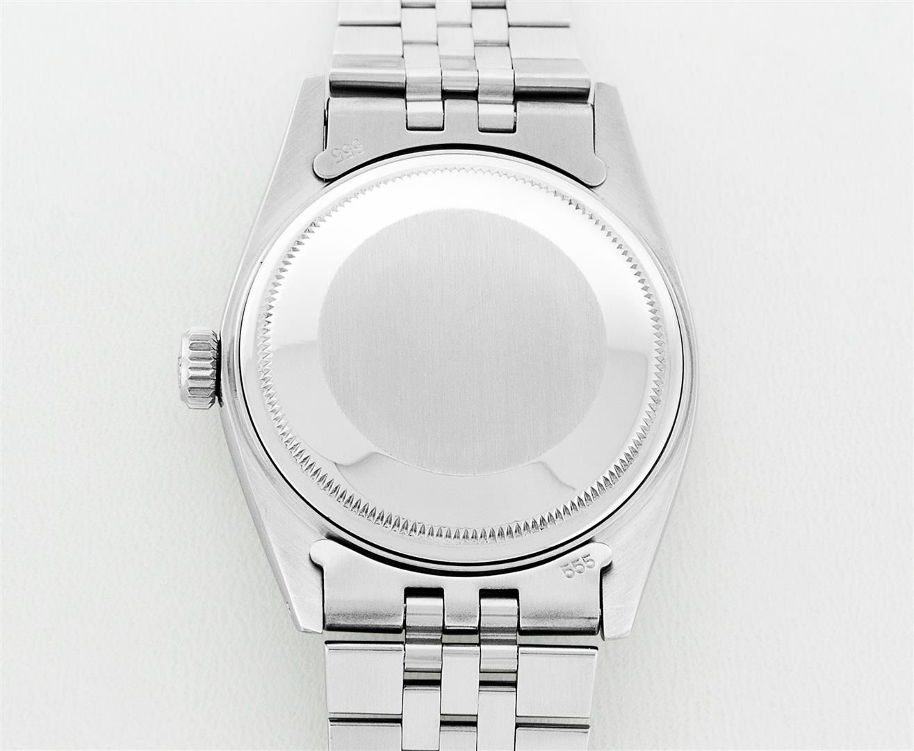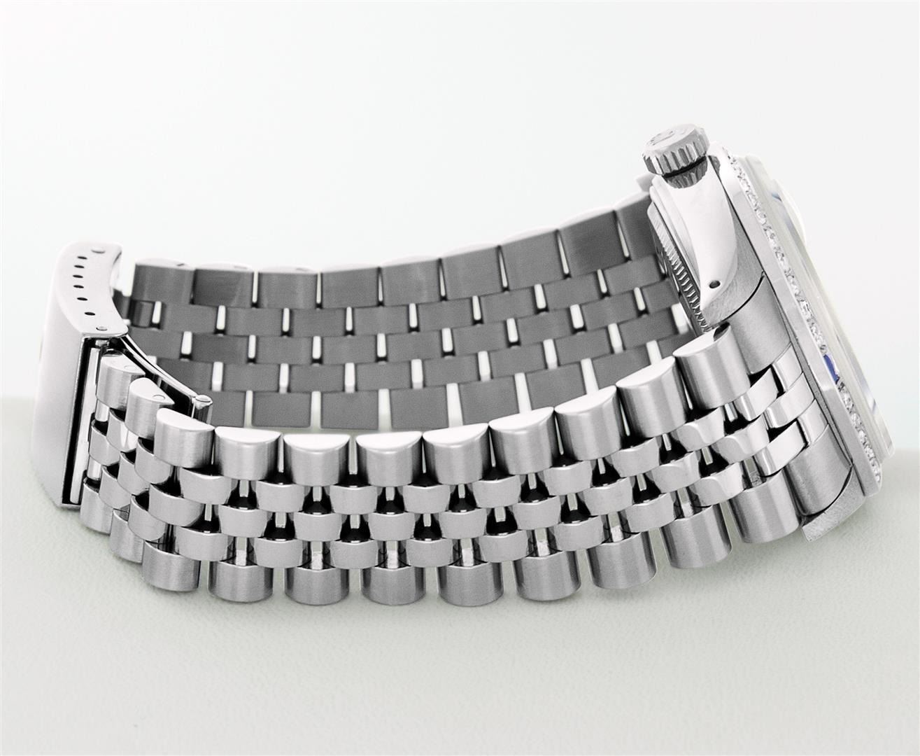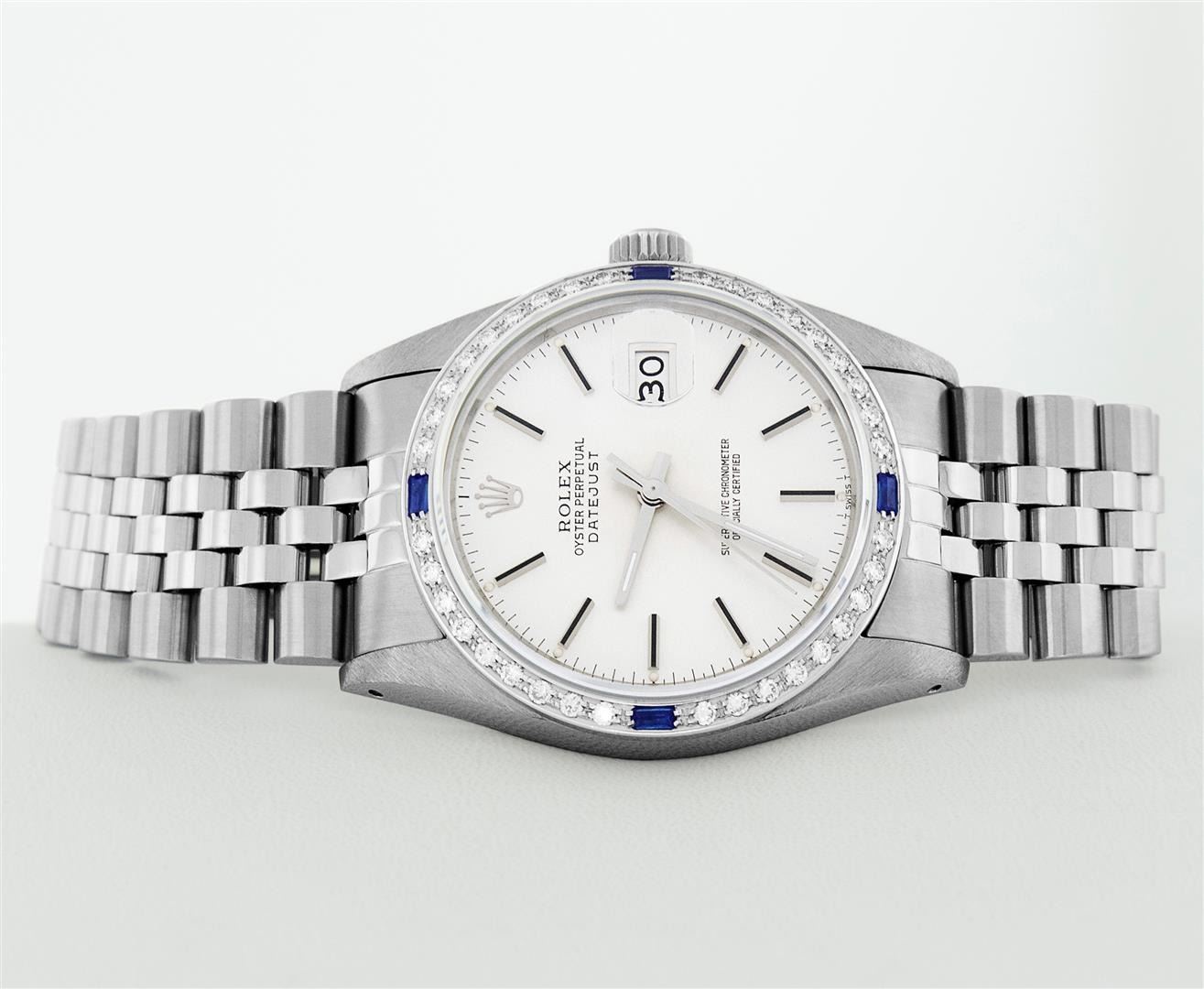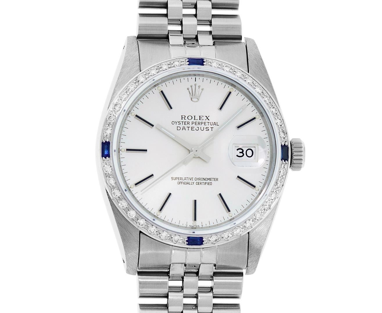 One Mens Pre Owned Stainless Steel Rolex Datejust Polished Bright with Satin Finish, This Watch Has Been Serviced & Electronically Tested, Rolex Stainless Steel Case: 36mm, Rolex Stainless Steel Crown, Custom Bezel: New 18K White Gold Sapphire Beadset Diamond Bezel, Diamond + Gem Count: 36 Diamonds + 4 Sapphires, Total Weight 1.00 Carat, Clarity: SI-VS, Color: G to H. Custom Crystal: New Sapphire With Magnified Date Window. Custom Hands: New Luminescent Hands. Rolex Movement: Automatic Winding Movement 3035. Rolex Dial: Silver Index With Dash Track & Lumi Dots. Date Window: 3 O'Clock Position Date Display, Quickset, Model: Datejust, Condition: G-6 Extra Fine. Rolex Bracelet: Stainless Steel Jubilee Band. Bracelet: 7.0 Inch Length, Adjustable. Standard Clasp, With Rolex Logo. This Watch Has Been Serviced Time Tested And Is In Excellent Condition It Is Free Of All Scratches And Dents.