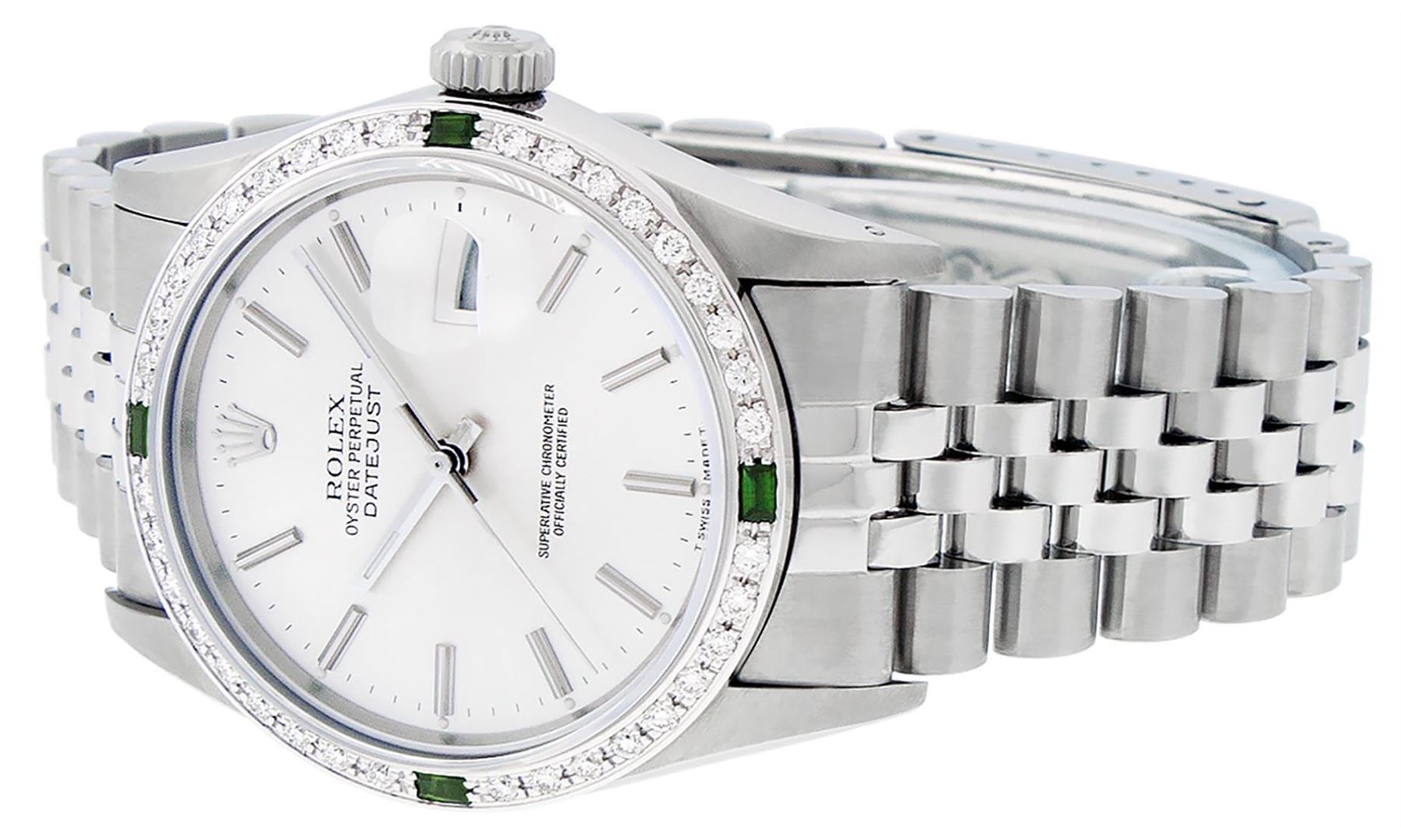 One Mens Pre Owned Stainless Steel Rolex Datejust Polished Bright with Satin Finish, This Watch Has Been Serviced & Electronically Tested, Rolex Stainless Steel Case: 36mm, Rolex Stainless Steel Crown, Custom Bezel: New 18K White Gold Emerald Beadset Diamond Bezel, Diamond + Gem Count: 36 Diamonds + 4 Emeralds, Total Weight 1.00 Carat, Clarity: SI-VS, Color: G to H. Custom Crystal: New Sapphire With Date Window. Custom Hands: New Luminescent Hands. Rolex Movement: Automatic Winding Movement 3035. Rolex Dial: Silver Index With Dash Track & Lumi Dots. Date Window: 3 O'Clock Position Date Display, Quickset, Model: Datejust, Condition: G-6 Extra Fine. Rolex Bracelet: Stainless Steel Jubilee Band. Bracelet: 7.0 Inch Length, Adjustable. Standard Clasp, With Rolex Logo. This Watch Has Been Serviced Time Tested And Is In Excellent Condition It Is Free Of All Scratches And Dents.
