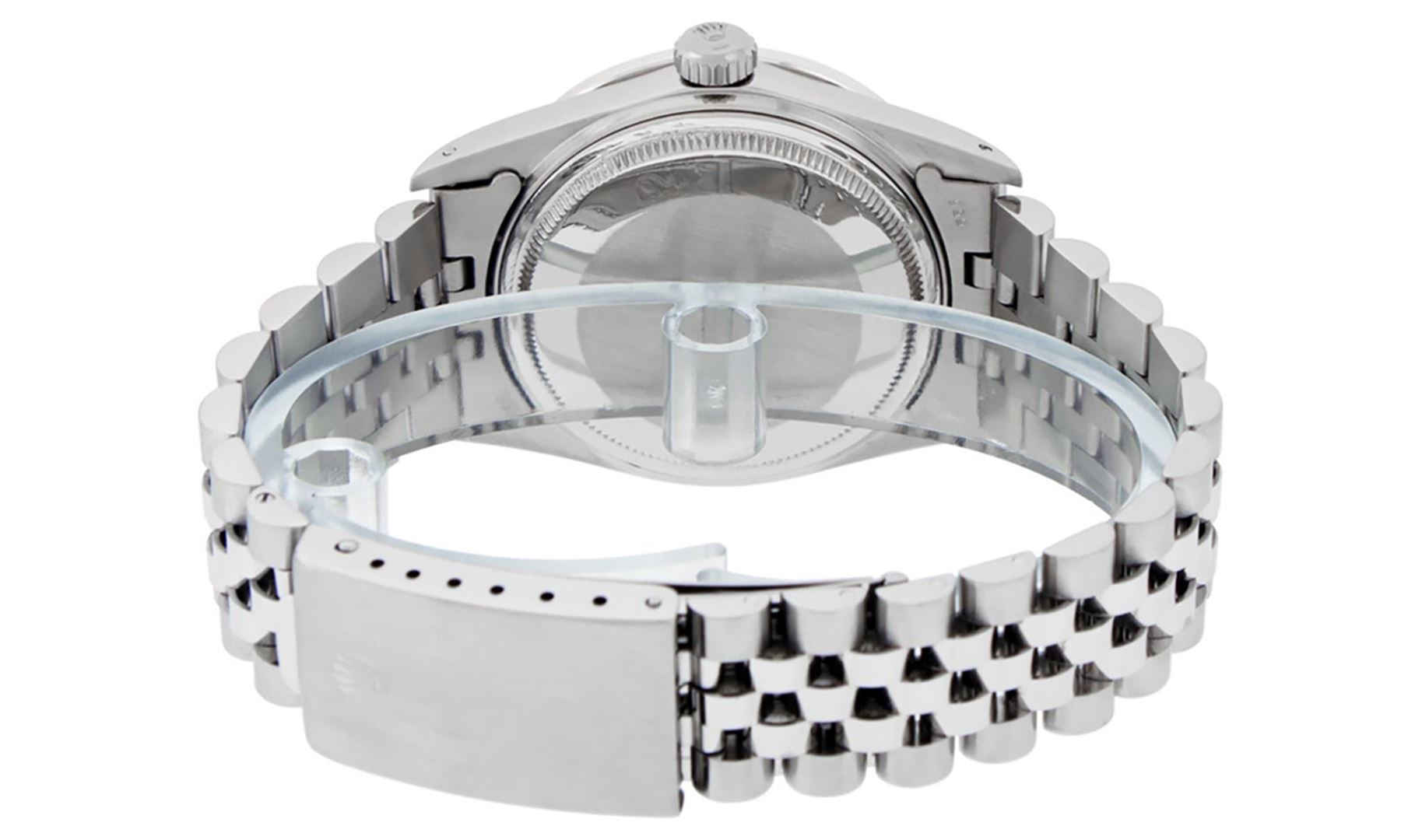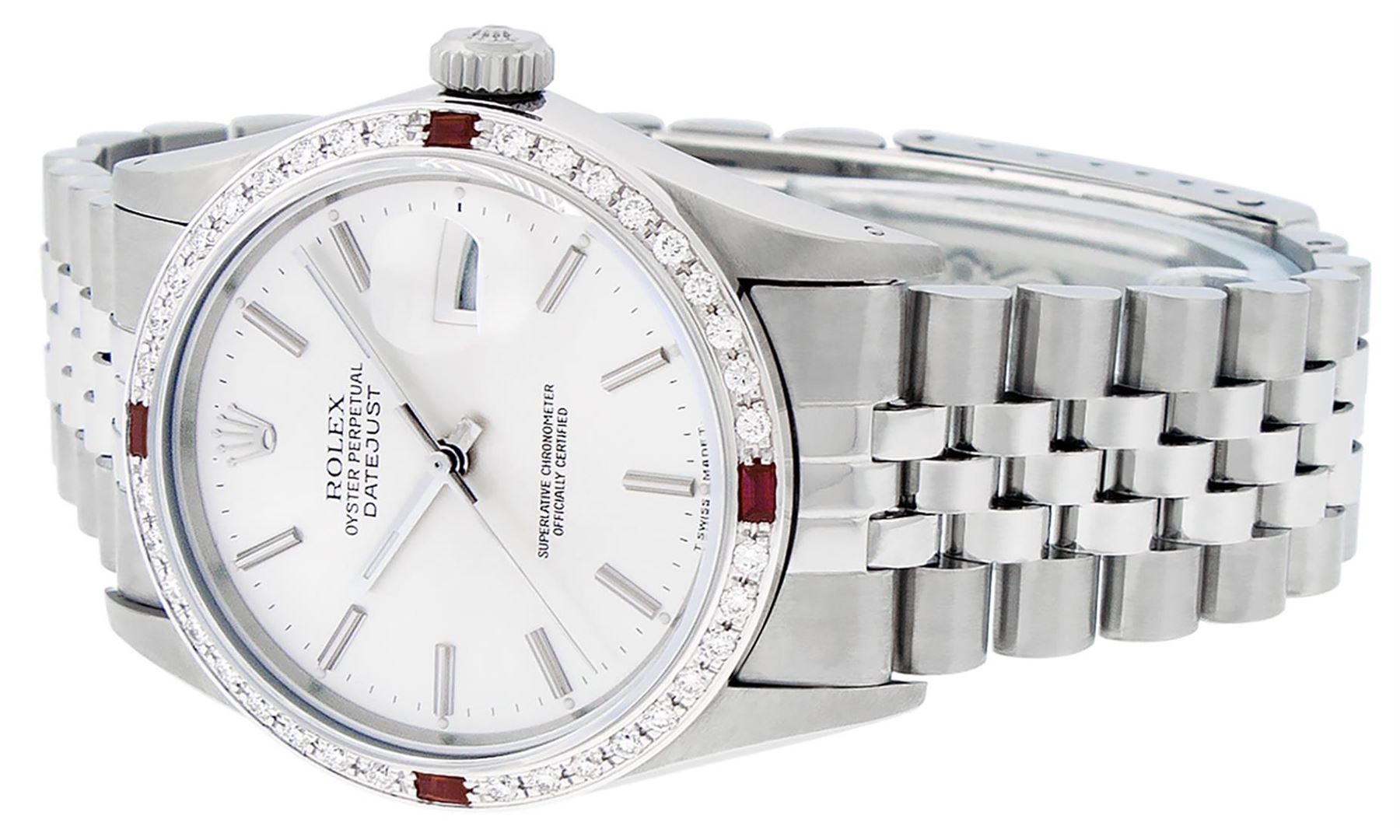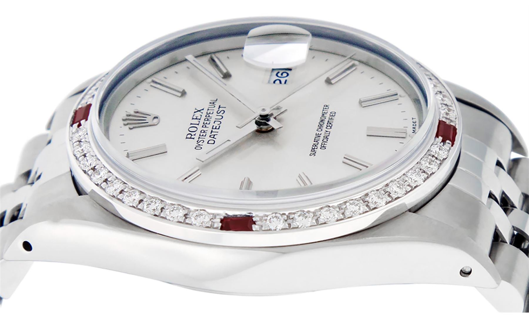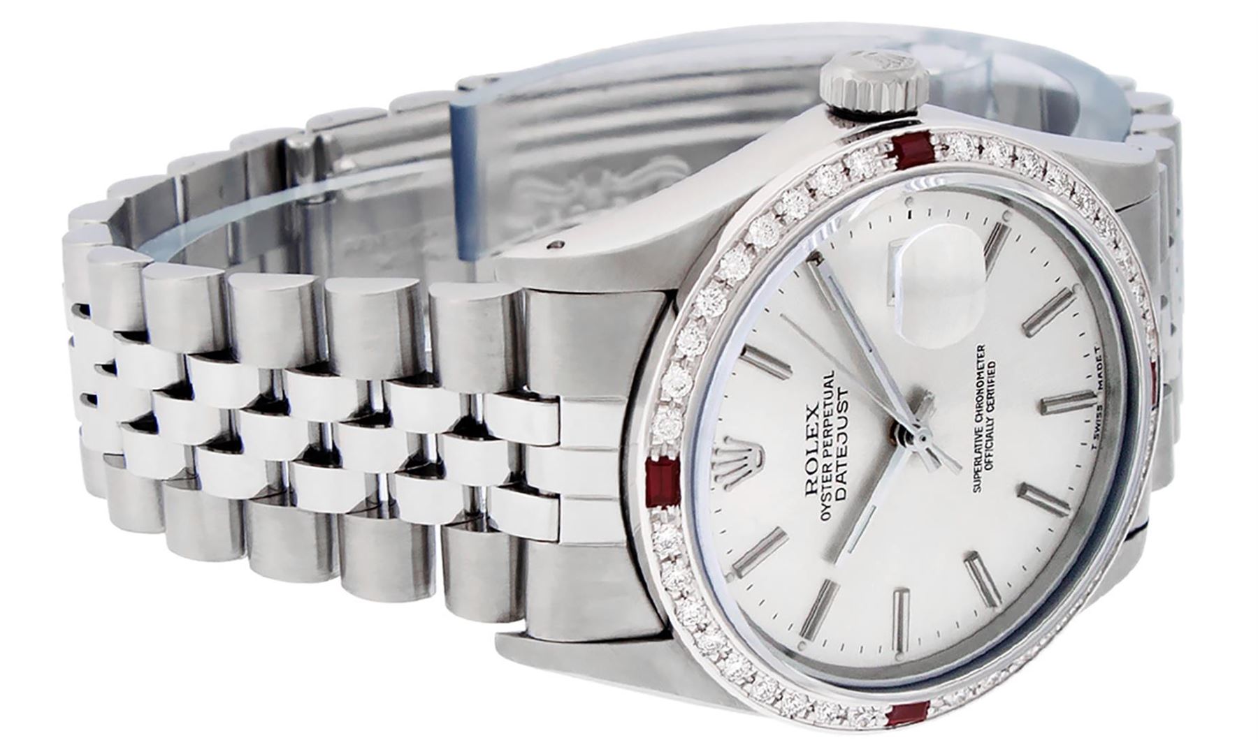 One Mens Pre Owned Stainless Steel Rolex Datejust Polished Bright with Satin Finish, This Watch Has Been Serviced & Electronically Tested, Rolex Stainless Steel Case: 36mm, Rolex Stainless Steel Crown, Custom Bezel: New 18K White Gold Ruby Beadset Diamond Bezel, Diamond + Gem Count: 36 Diamonds + 4 Rubies, Total Weight 1.00 Carat, Clarity: SI-VS, Color: G to H. Custom Crystal: New Sapphire With Magnified Date Window. Custom Hands: New Luminescent Hands. Rolex Movement: Automatic Winding Movement 3035. Rolex Dial: Silver Index With Dash Track & Lumi Dots. Date Window: 3 O'Clock Position Date Display, Quickset, Model: Datejust, Condition: G-6 Extra Fine. Rolex Bracelet: Stainless Steel Jubilee Band. Bracelet: 7.0 Inch Length, Adjustable. Standard Clasp, With Rolex Logo. This Watch Has Been Serviced Time Tested And Is In Excellent Condition It Is Free Of All Scratches And Dents.