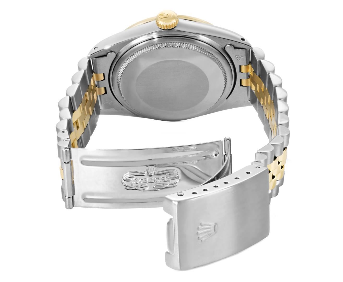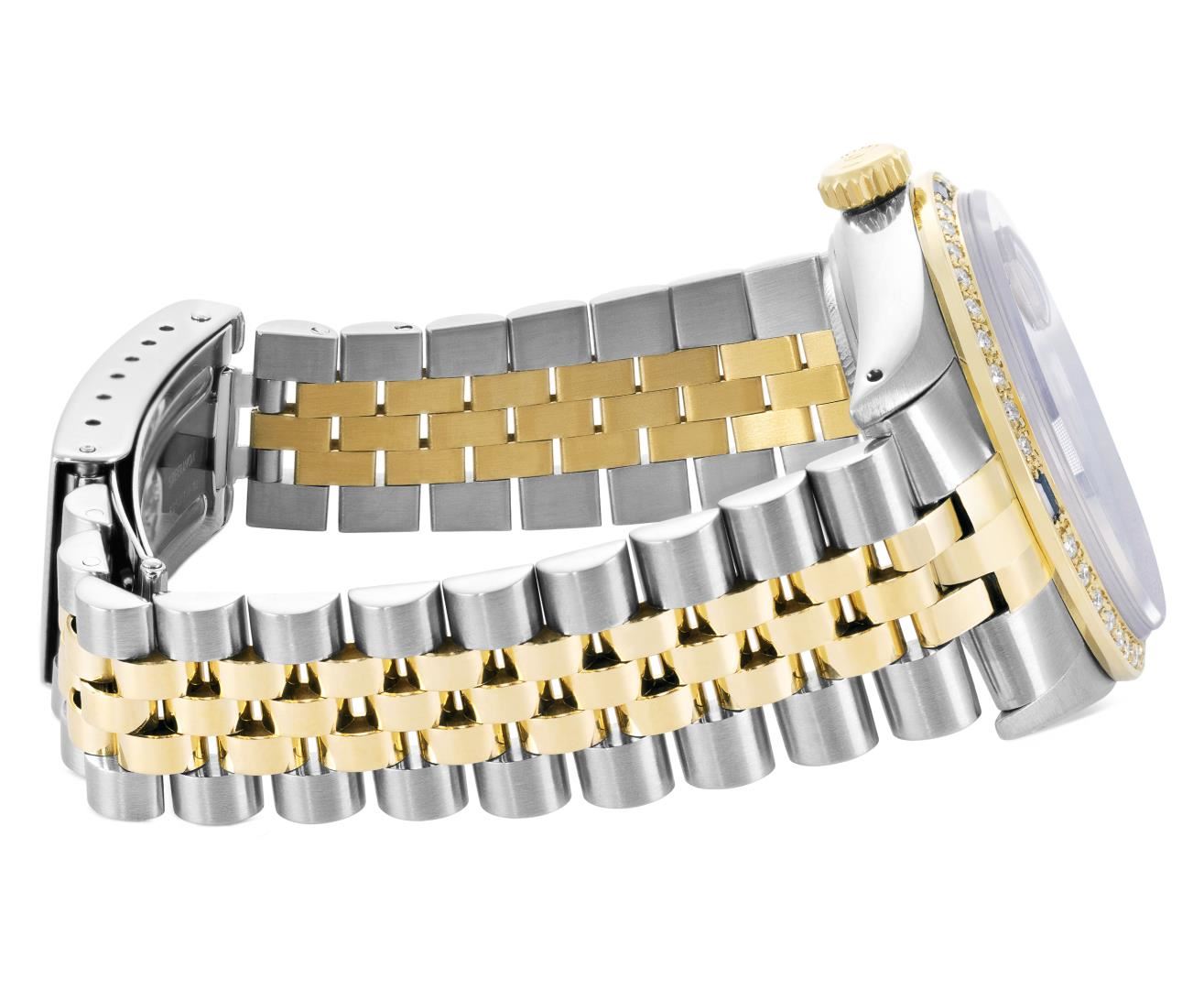 One Mens Pre Owned Two Tone Yellow Gold And Stainless Steel Rolex Datejust Polished, Serviced And Electronically Tested, Yellow Gold And Stainless Steel Case: 36mm, Rolex Yellow Gold Crown, Custom Bezel: New 18K Yellow Gold Sapphire Beadset Diamond Bezel, Diamond Count: 36 Diamonds + 4 Sapphires. Custom Crystal: New Sapphire With Magnified Date Window. Custom Hands: New Hands. Rolex Movement: Automatic Winding Movement 3035. Rolex Factory Dial: Champagne Index With Dash Track And Lumi Dots. Date Window: 3 O'Clock Position Date Display, Quickset, Model: Quickset Datejust. Condition: G-6 Extra Fine. Rolex Bracelet: Two Tone Yellow Gold And Stainless Steel Jubilee Band. Bright Polish. 7.0 Inch Length, Adjustable. Standard Clasp, With Rolex Logo. This Watch Has Been Serviced Time Tested And Is In Excellent Condition It Is Free Of All Scratches And Dents. This Watch Comes With A Rolex Box.