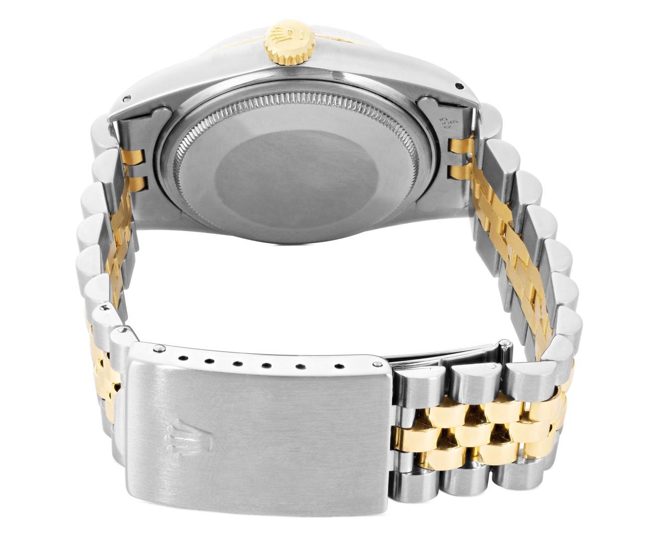 One Mens Pre Owned Yellow Gold Two Tone Rolex Datejust Polished, Serviced And Electronically Tested, Rolex Yellow Gold And Stainless Steel Case: 36mm, Rolex Yellow Gold Crown, Rolex Bezel: Yellow Gold Fluted Bezel. Custom Crystal: New Acrylic With Magnified Date Window. Hands: Luminescent Hands. Rolex Movement: Automatic Winding Movement 3035. Rolex Dial: Silver Dial With Index Hour Markers and Dash Track With Lumi Dots. Date Window: 3 O'Clock Position Date Display, Quickset, Model: Quickset Datejust. Condition: G-6 Extra Fine. Rolex Bracelet: Two Tone Yellow Gold And Stainless Steel Jubilee Band. Bright Polish. 7.0 Inch Length, Adjustable. Standard Clasp, With Rolex Logo. This Watch Has Been Serviced Time Tested And Is In Excellent Condition It Is Free Of All Scratches And Dents.