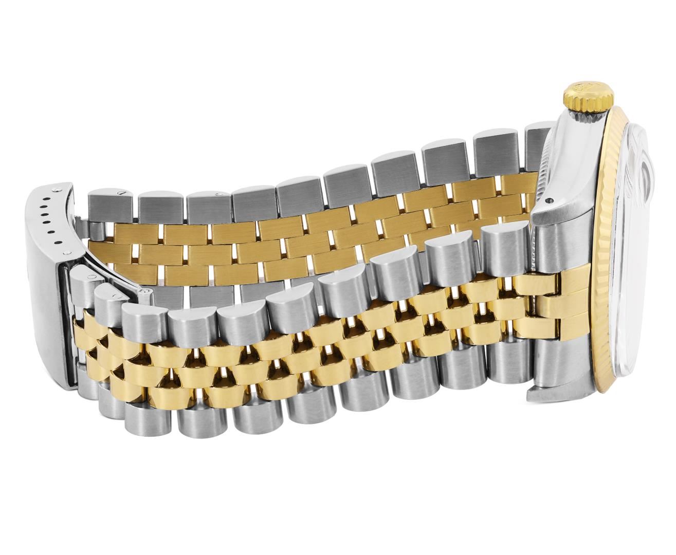 One Mens Pre Owned 18K Two Tone Yellow Gold And Stainless Steel Rolex Datejust Polished, Serviced And Electronically Tested, Rolex Yellow Gold And Stainless Steel Case: 36mm, Rolex Yellow Gold Crown, Rolex Bezel: Yellow Gold Fluted Bezel. Custom Crystal: New Plastic With Magnified Date Window. Hands: Luminescent Hands. Rolex Movement: Automatic Winding Movement 3035. Rolex Dial: Champagne Dial With Index Hour Markers and Dash Track With Lumi Dots. Date Window: 3 O'Clock Position Date Display, Quickset, Model: Quickset Datejust. Condition: G-6 Extra Fine. Rolex Bracelet: Two Tone Yellow Gold And Stainless Steel Jubilee Band. Bright Polish. 7.0 Inch Length, Adjustable. Standard Clasp, With Rolex Logo. This Watch Has Been Serviced Time Tested And Is In Excellent Condition It Is Free Of All Scratches And Dents.