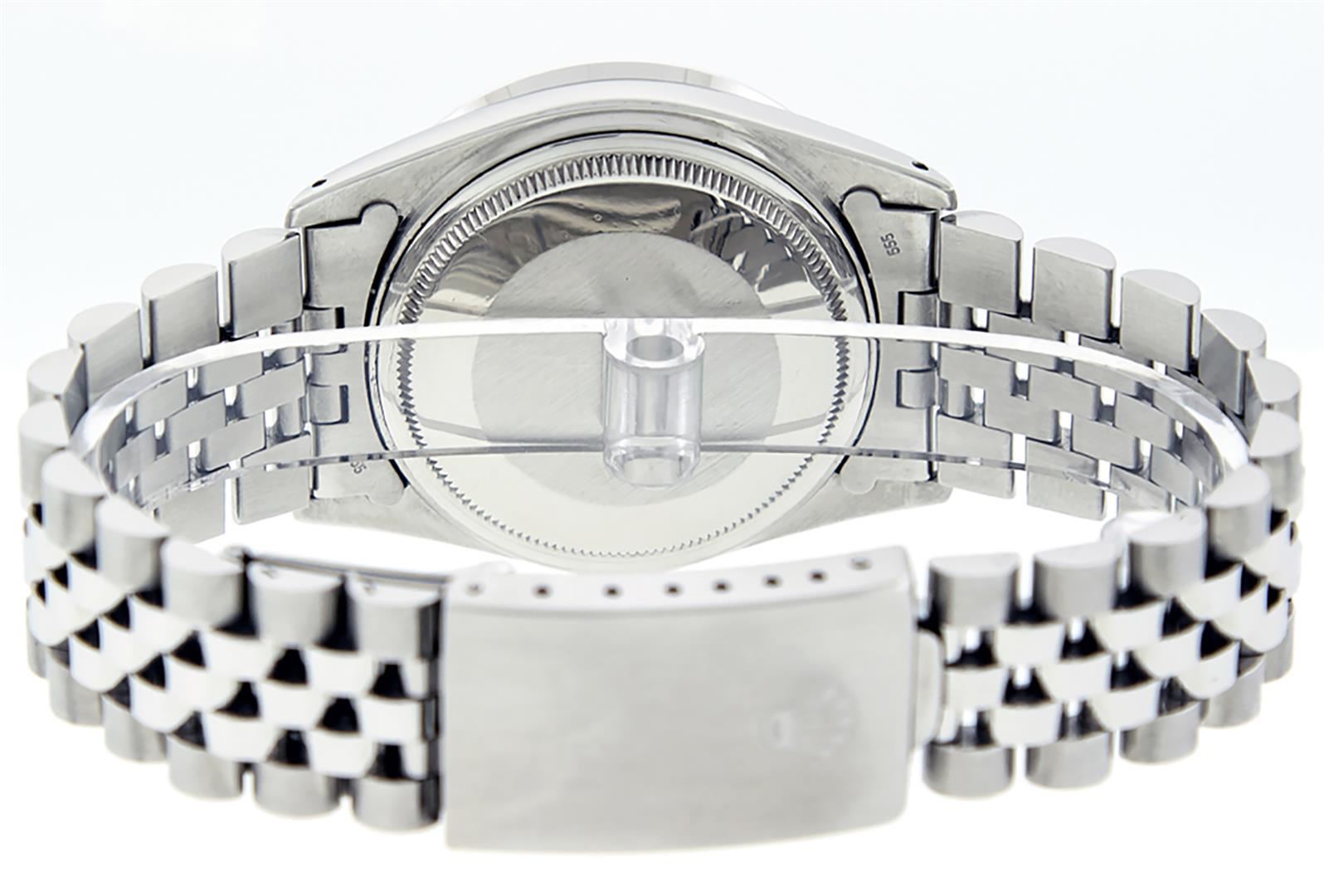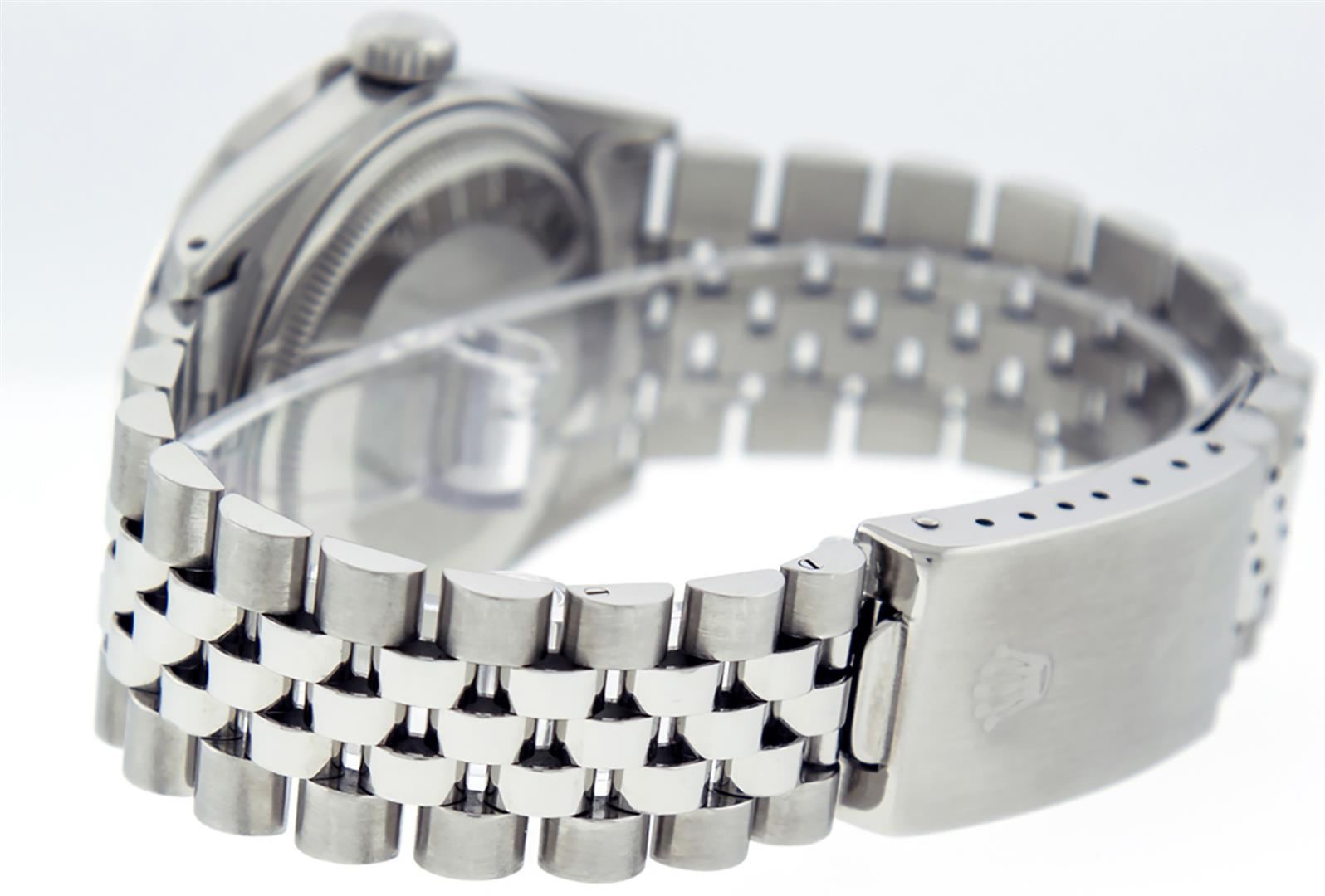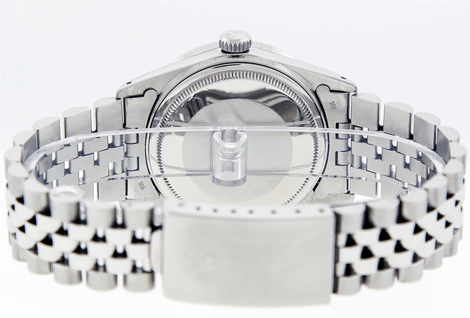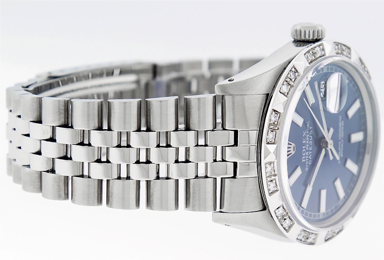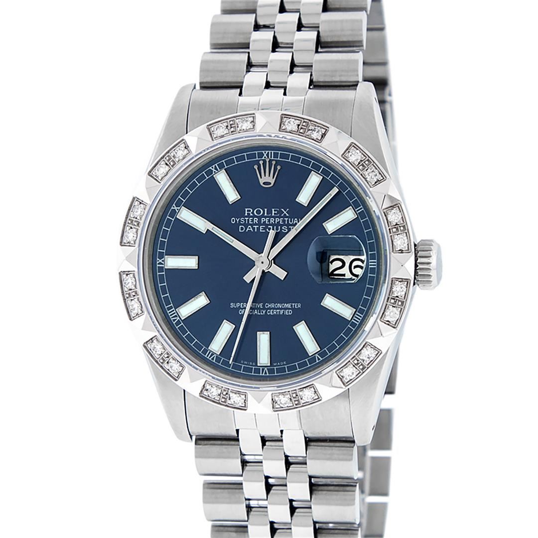 One Mens Stainless Steel Rolex Datejust Polished Bright with Satin Finish, Serviced & Electronically Tested, Stainless Steel Case: 36mm, Stainless Steel Crown, Custom Bezel: New 18K White Gold Pyramid Diamond Bezel, Diamond Count: 24 Diamonds, Total Weight .70 Carat, Clarity: SI-VS, Color: G to H. Custom Crystal: New Synthetic Sapphire Cyclops Lens. Custom Hands: New Luminescent Hands. Movement: Automatic Winding Movement. Custom Dial: Blue Index Dial. Date Window: 3 O'Clock Position Date Display, Quickset, Model: Datejust. Condition: G-6 Extra Fine. Bracelet: Stainless Steel Jubilee. Bright Polish & Satin Finish. 7.0 Inch Length, Adjustable. Standard Clasp, With Rolex Logo. This Watch Has Been Serviced Time Tested And Is In Excellent Condition It Is Free Of All Scratches And Dents.