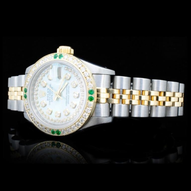 Bezel Style: Custom Yellow Gold Bezel with diamonds and Emeralds