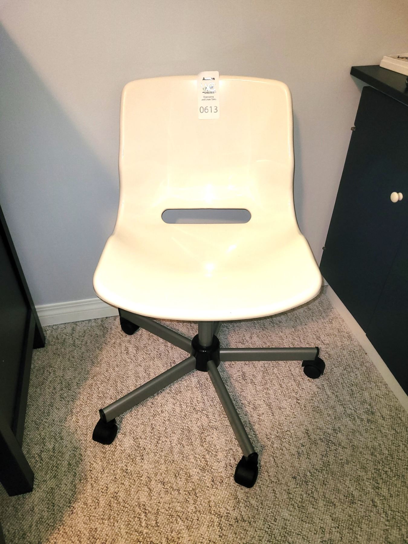 White rolling chair, painted ceramic tile picture, crate and stick art. Pickup at 10 am