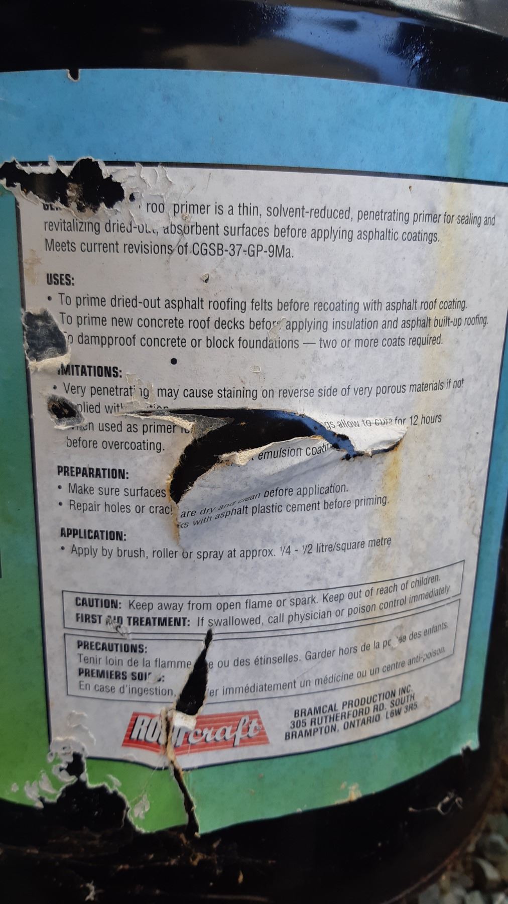 5 gal pail of waterproofing5 gal pail of roofing primer. Pick up 9-10 resin. Pick up 10 - 12 pm