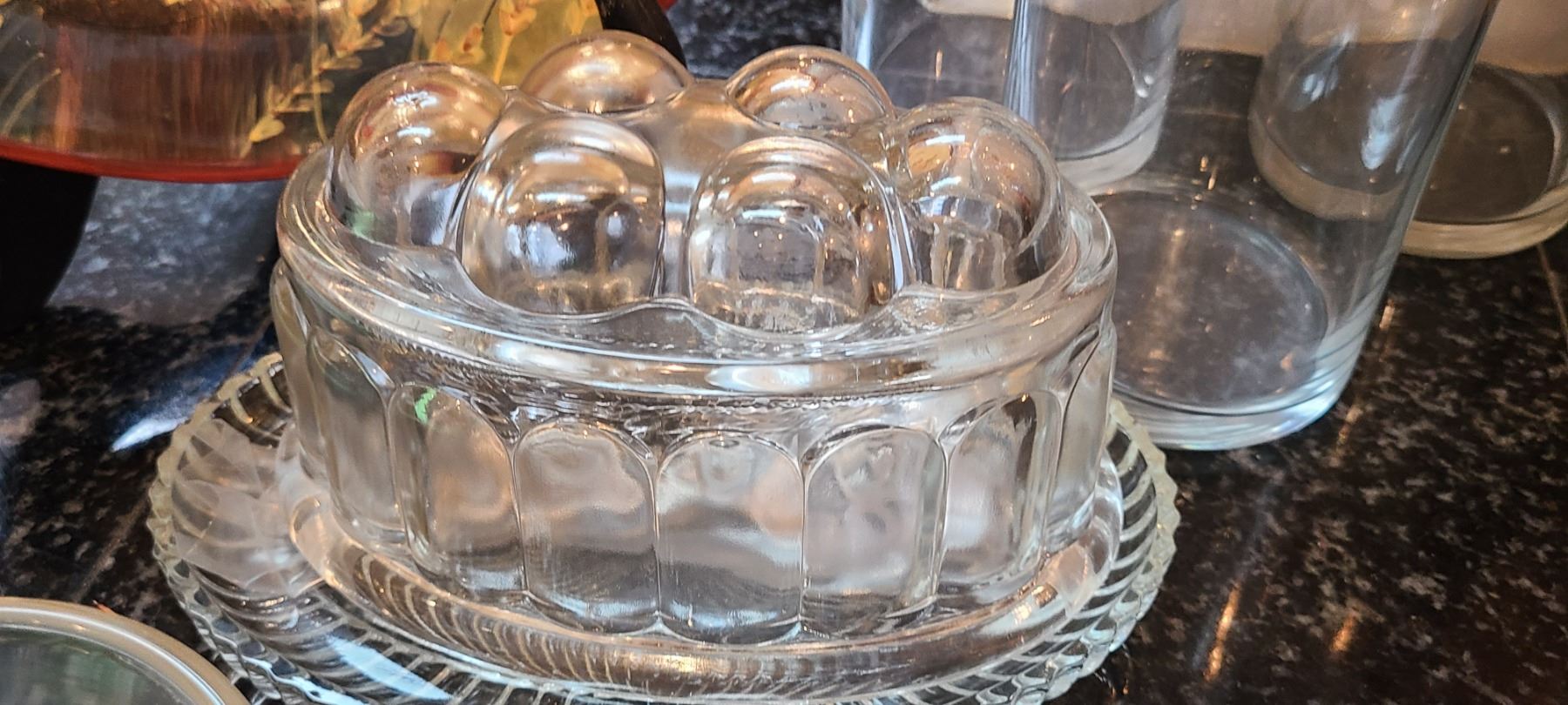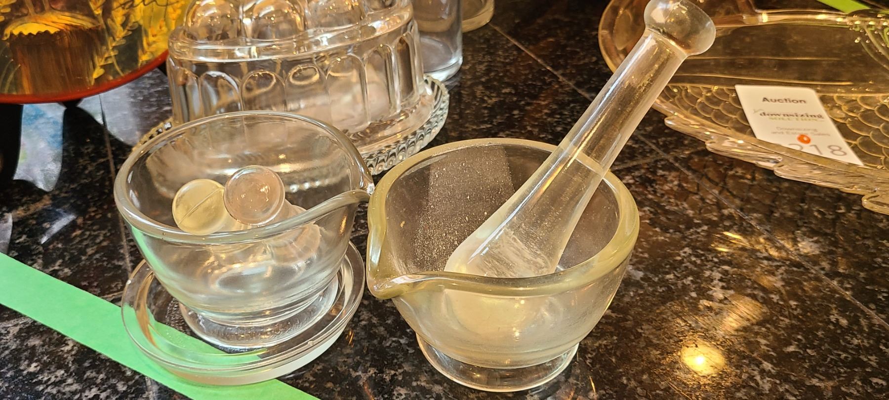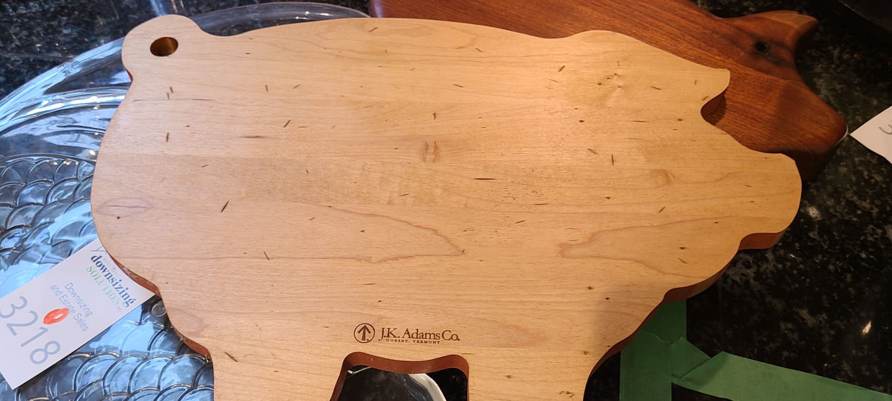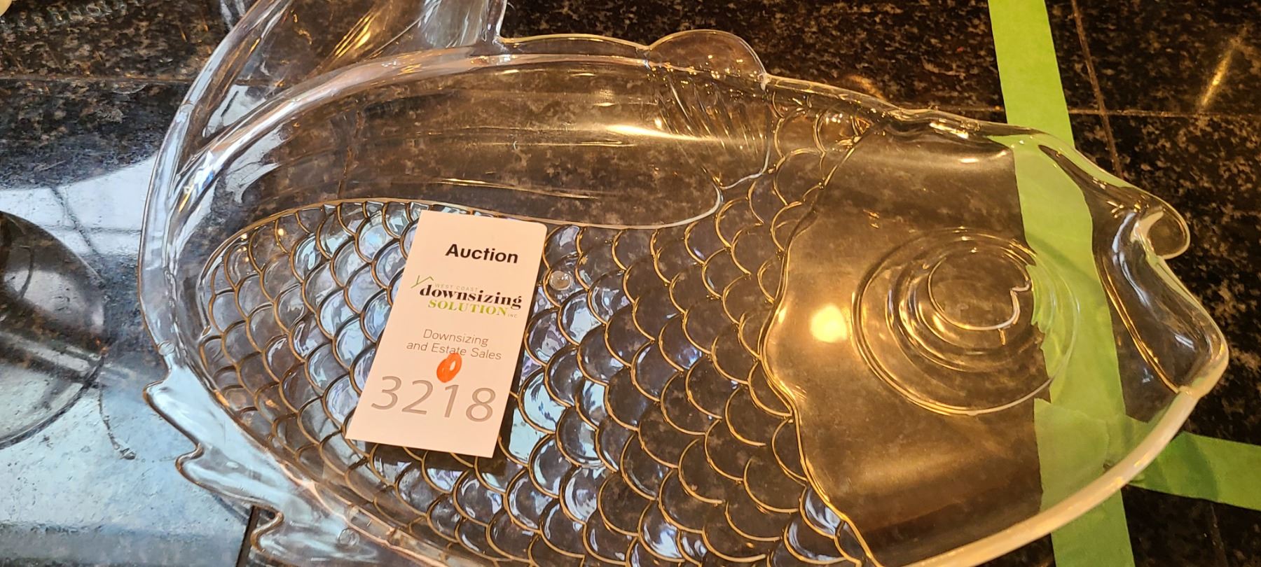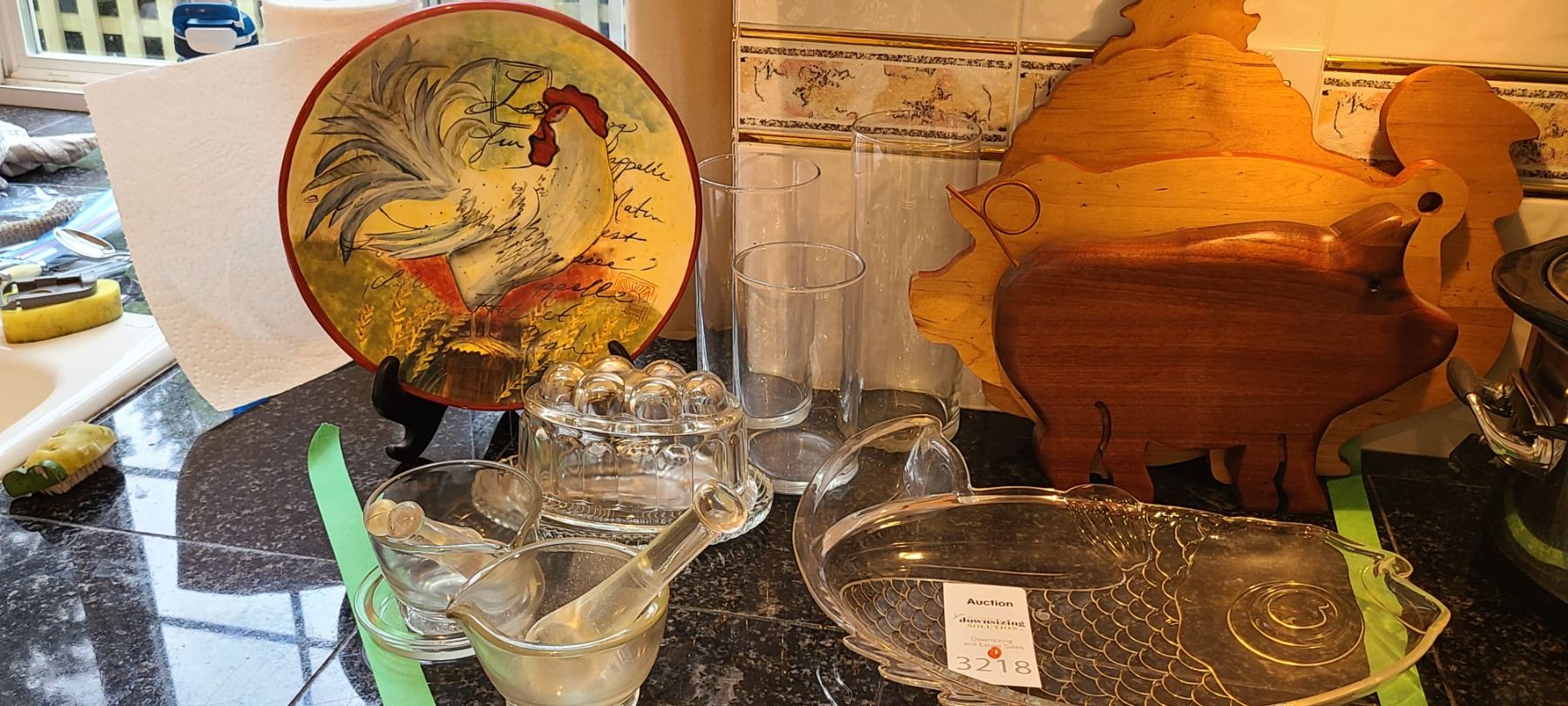 Glass butter dish, plastic fish dish, animal cutting boards, glass vases, glass mortar & pestels. pick up 9-10