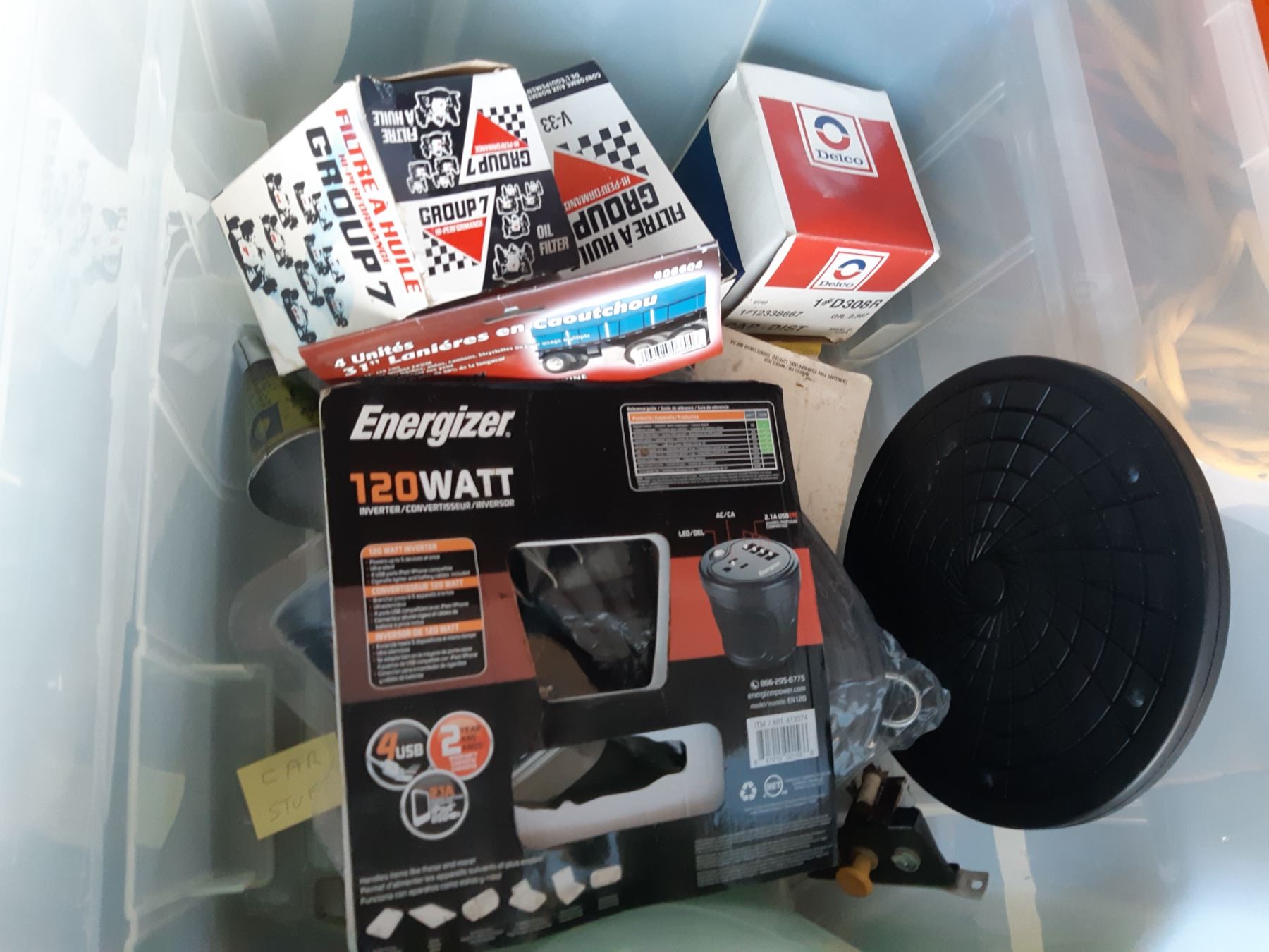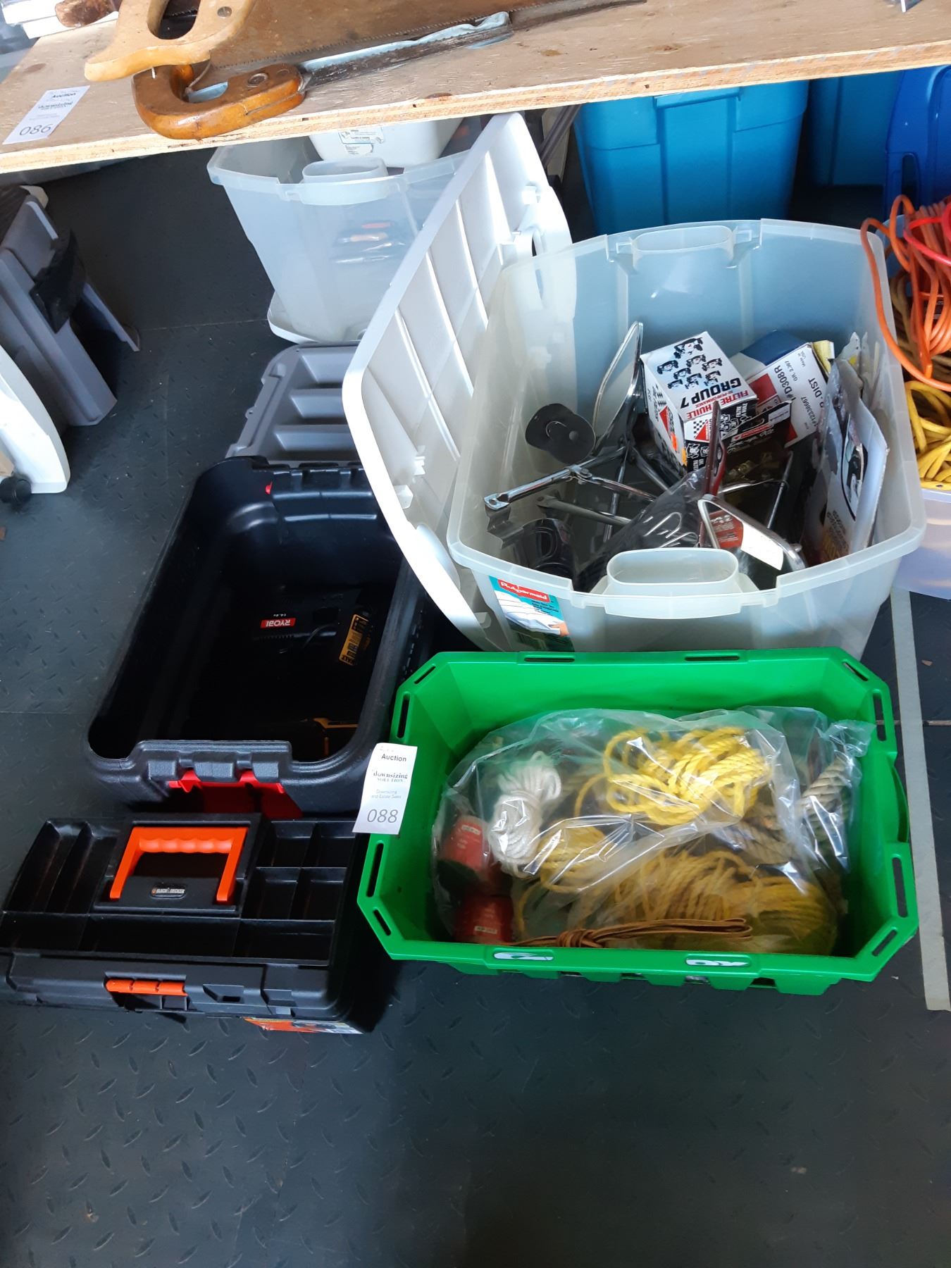 Three totes of rope, bungee cords, truck mirrors, tool box, electric drill. Untested, pickup at 9:30 am