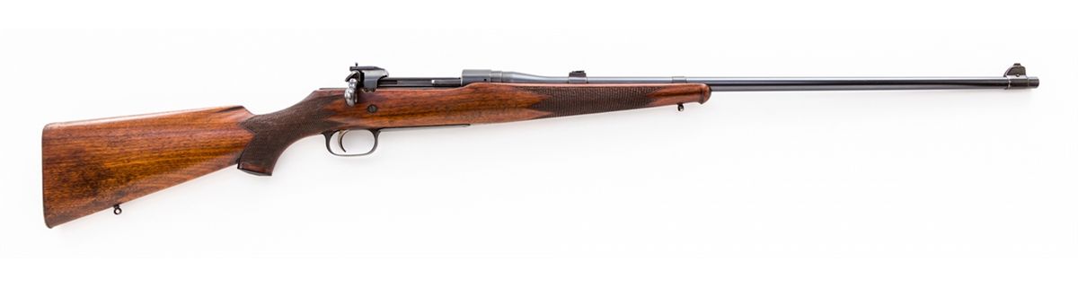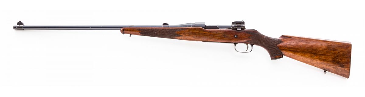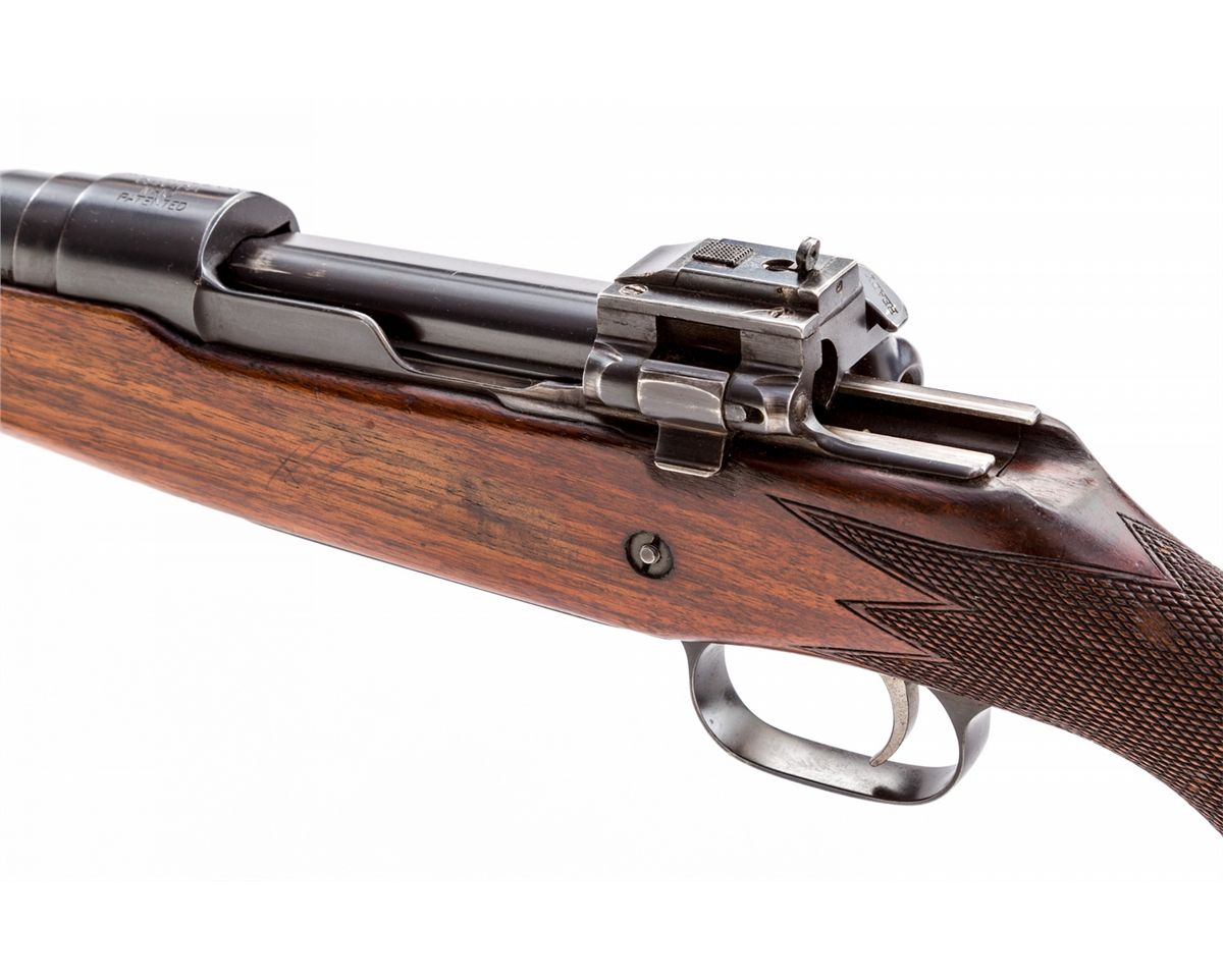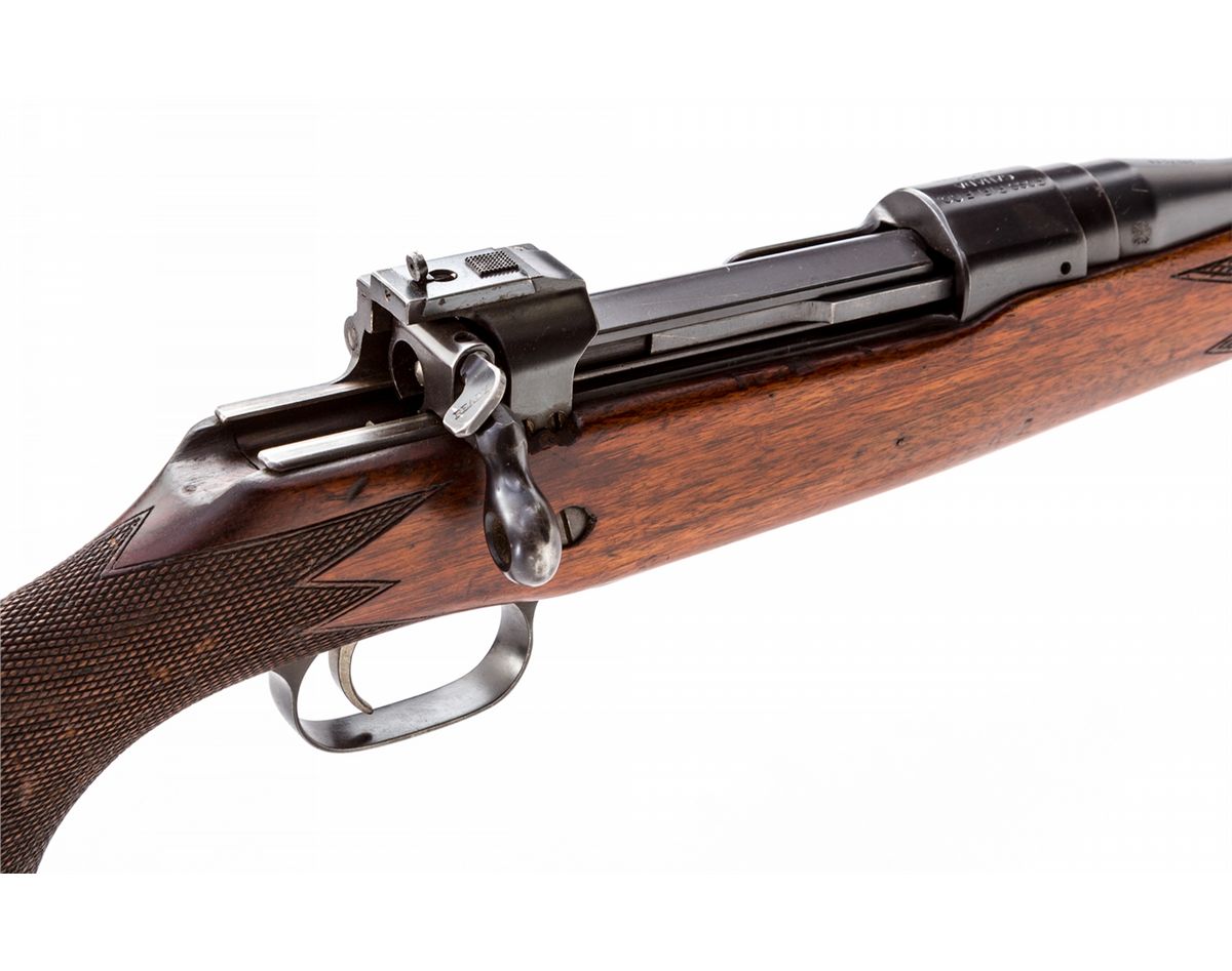 Ross M-10 Straight-Pull Bolt Action Rifle, #17005, .280 Ross cal., 26'' barrel, blue finish, factory checkered pistol-grip walnut stock, with Ross steel checkered buttplate, sling swivel eyelets, flip-up peep sight, single leaf rear sight, and bright bead front sight. Condition is fine with metal surfaces retaining approx. 96% blue showing thinning and losses at highpoints and some micro-scratching. Stock with light scuffs and pressure dings from field use. Action is crisp, bore is bright. Est.: $1,800-$2,400. (C&R)