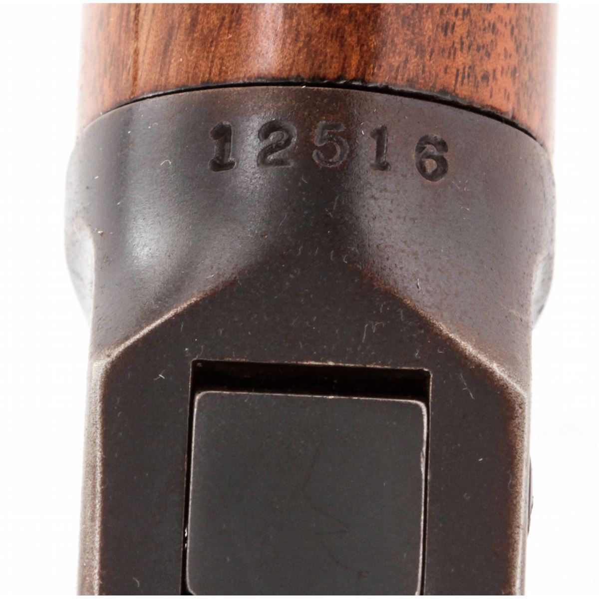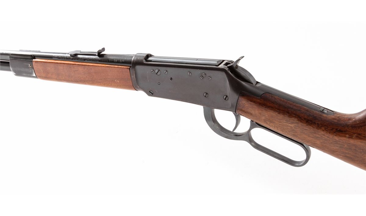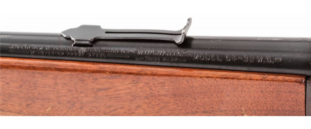 Rossi/Winchester Composite Model 94 Lever Action Carbine, #12516, .32 WS cal., 20'' Winchester barrel, blue finish, South American hardwood stock and forend. Left side of frame with various plugged screw holes for peep sight and scope mount. Condition is good as modified retaining approx. 92% matte blue to frame. Original barrel shows approx. 95% blue. Stock with scuffs and scratches. Rear sight missing its notched elevator. Good action and bore. Est.: $200-$400. (C&R)