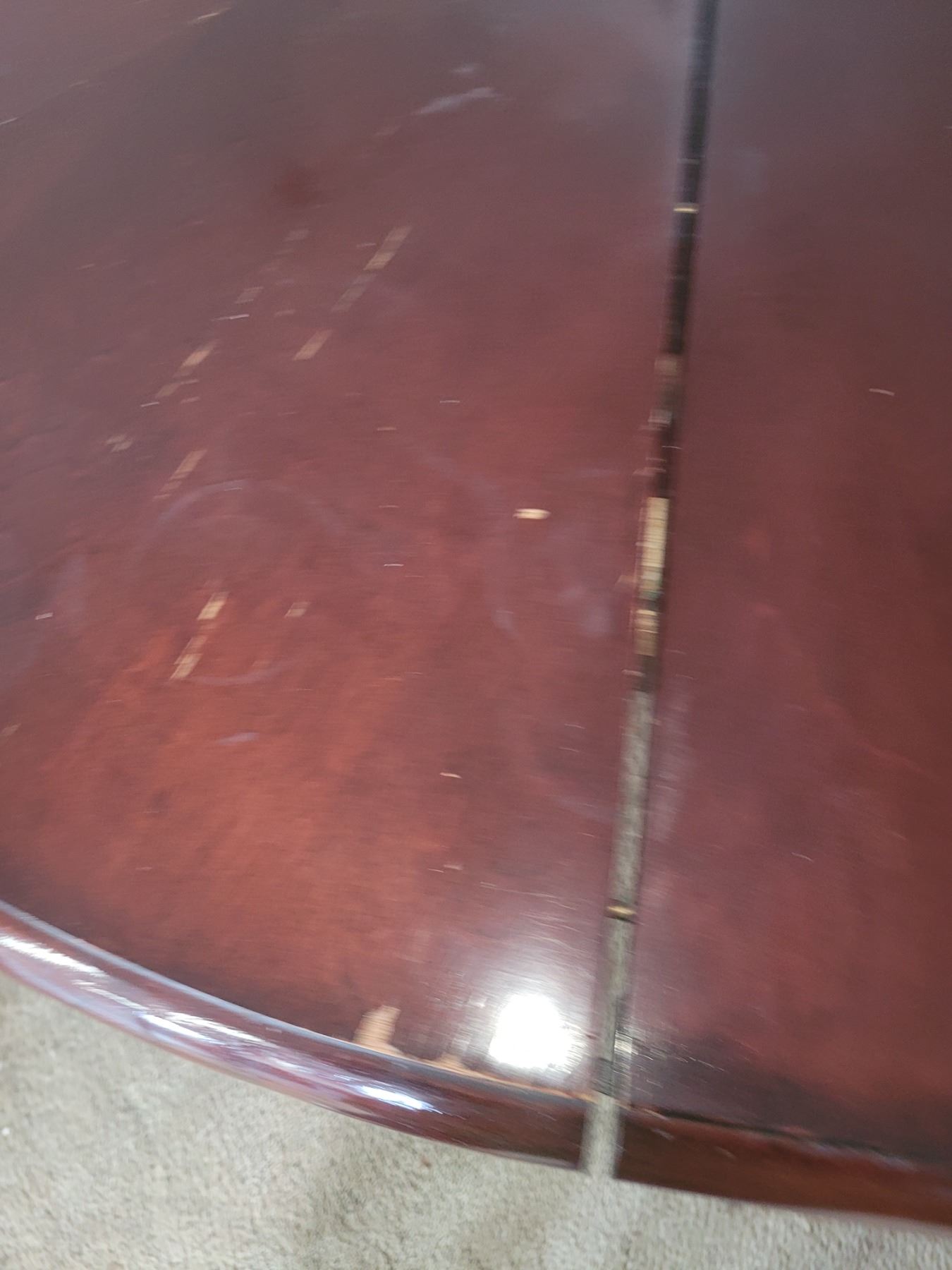 Caution brand wood, round table 47x47x29. Leaf is 14" w. Pick up 9.