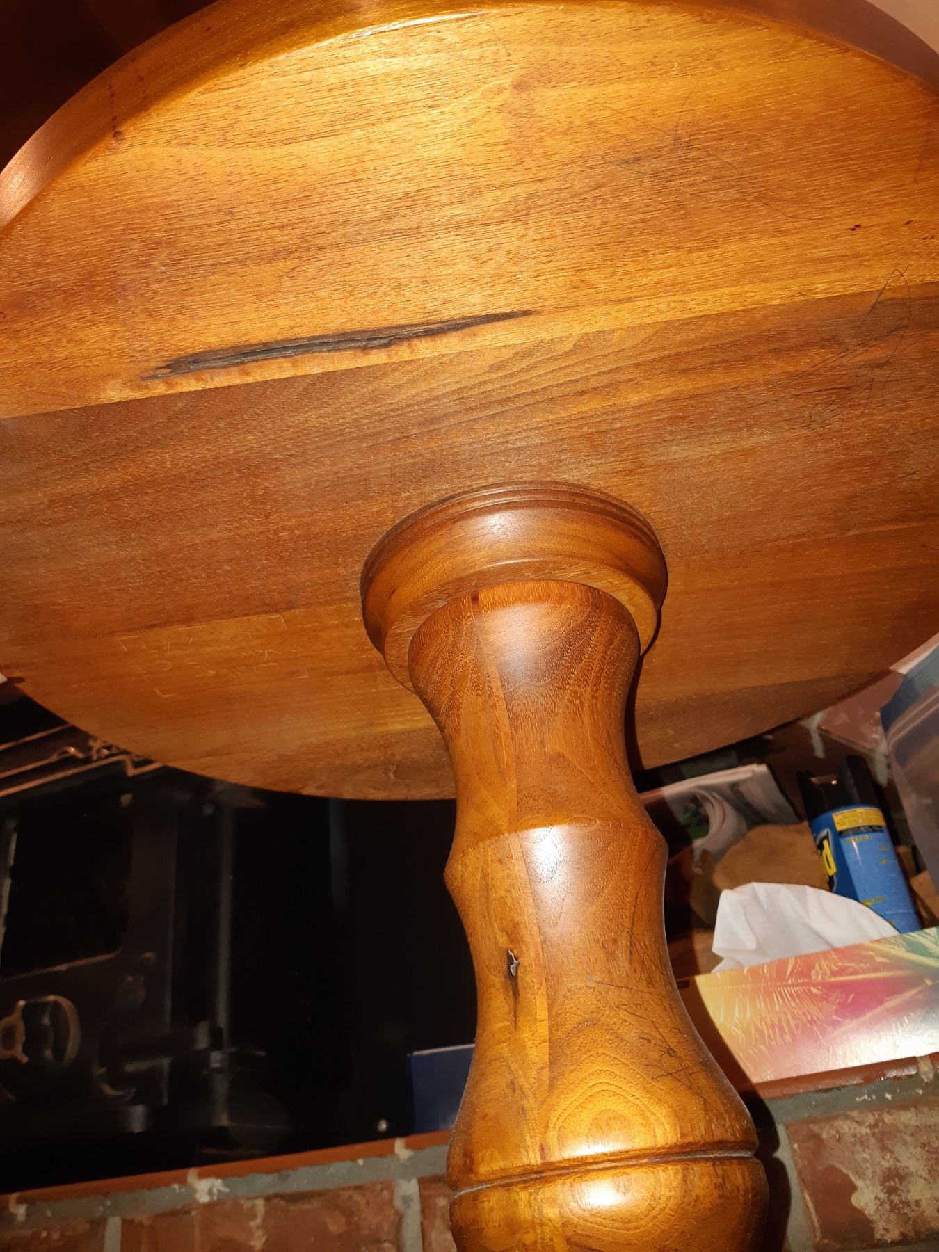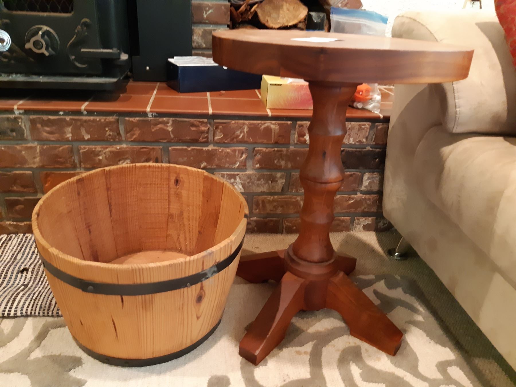 Round pedestal end table, note water marks 18x24. Apple barrel with metal trims. Pickup at 10:30 am