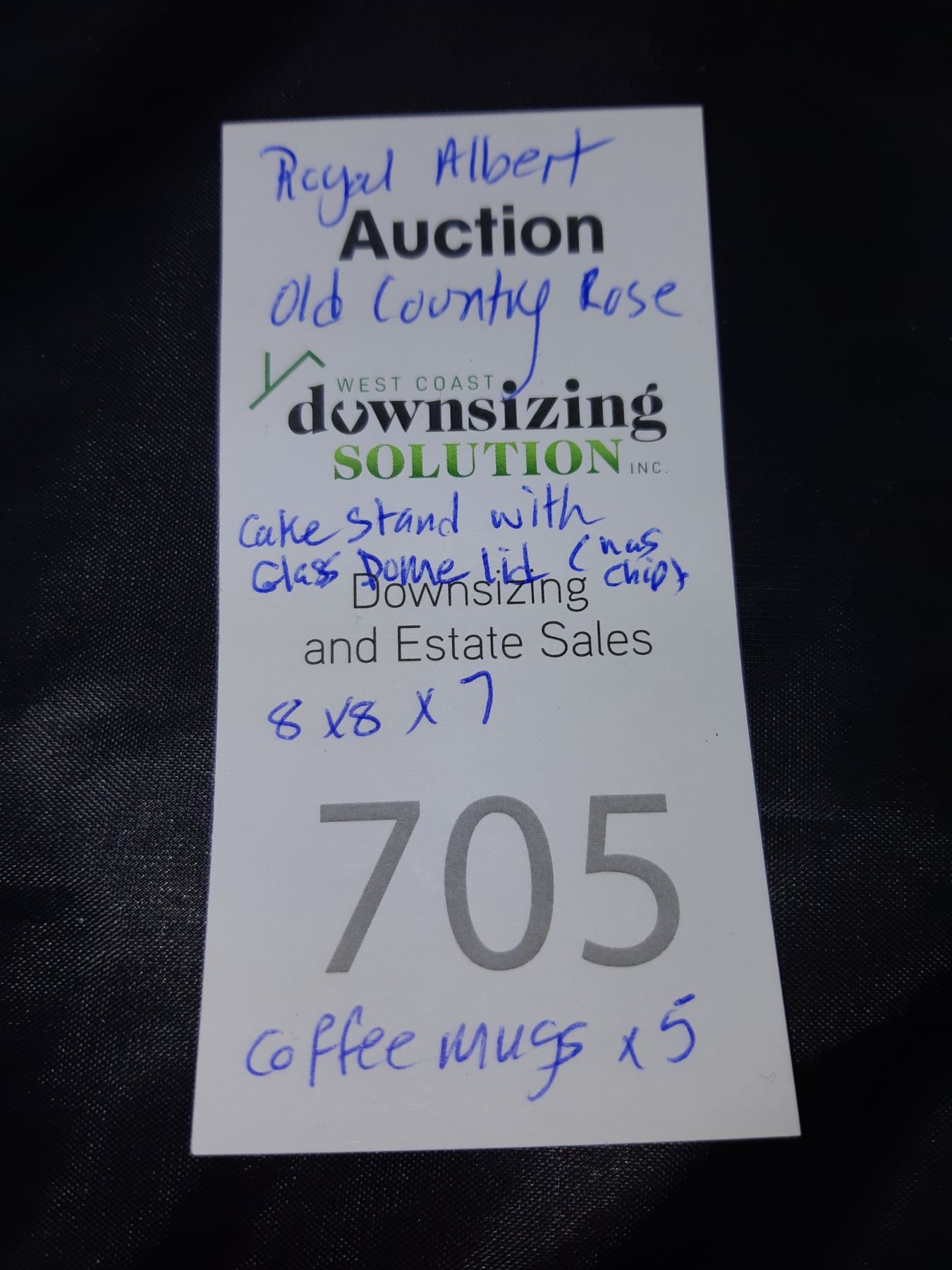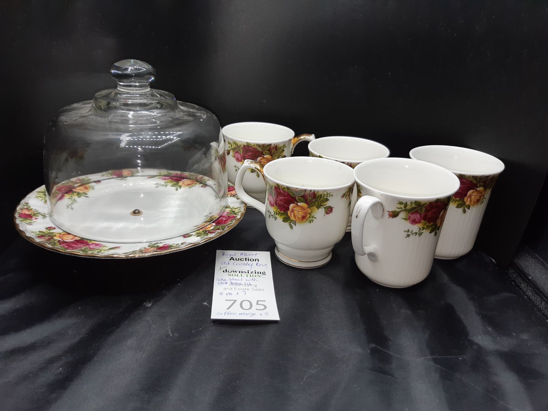 Glass domed cake stand 8x8x7 has chip underneath plate. 5 coffee mugs. Bring packing material and pickup at 9 am