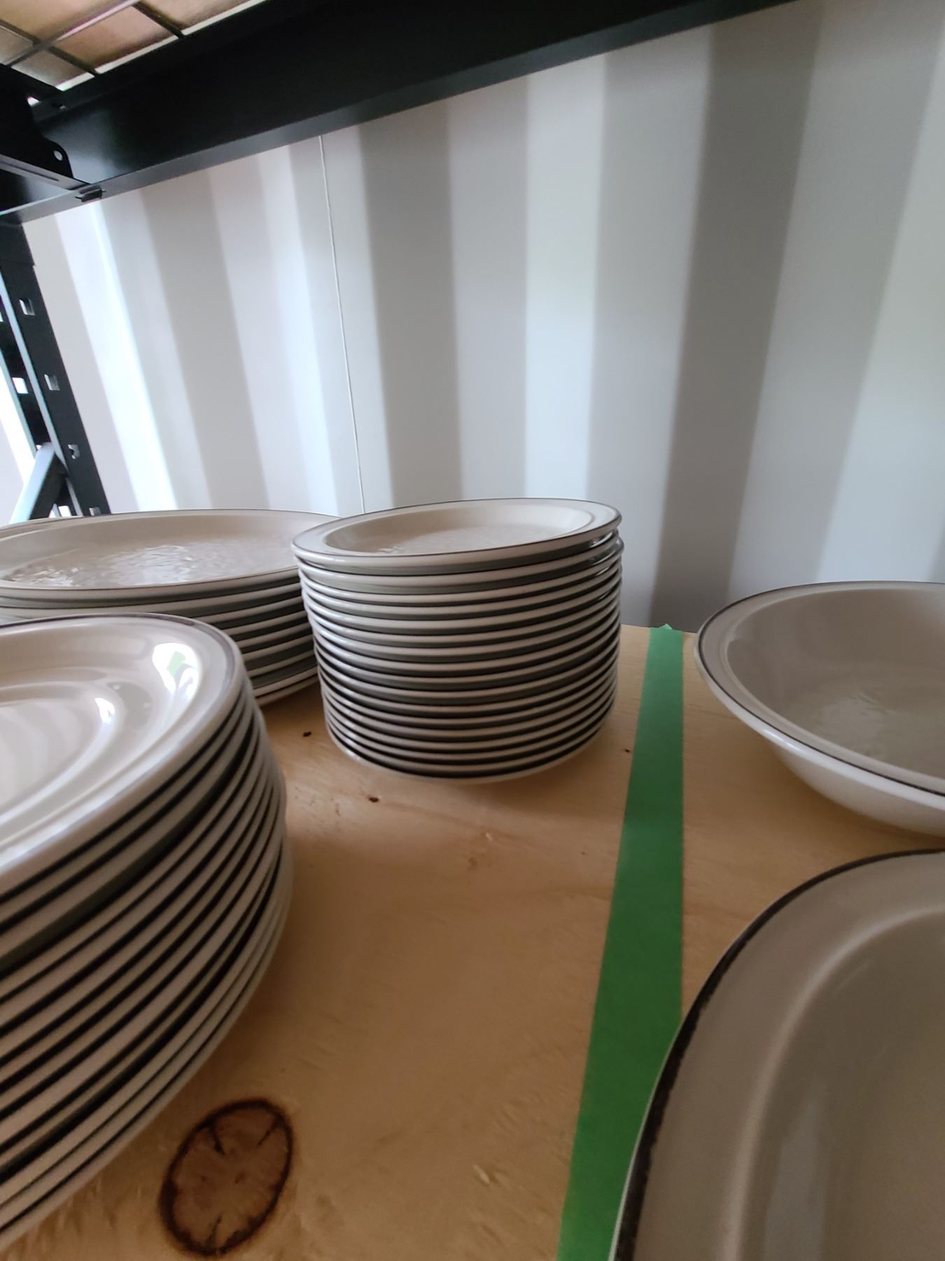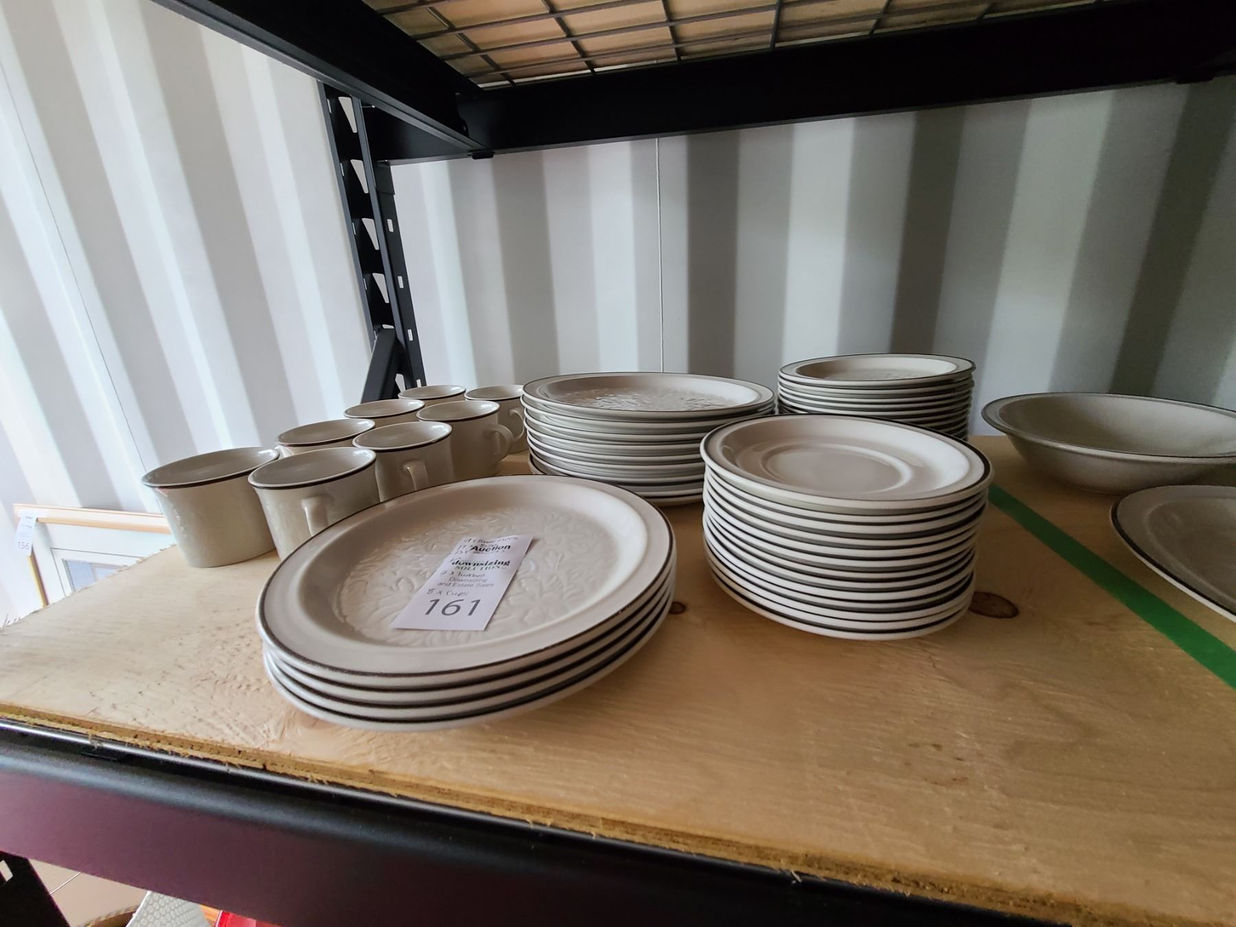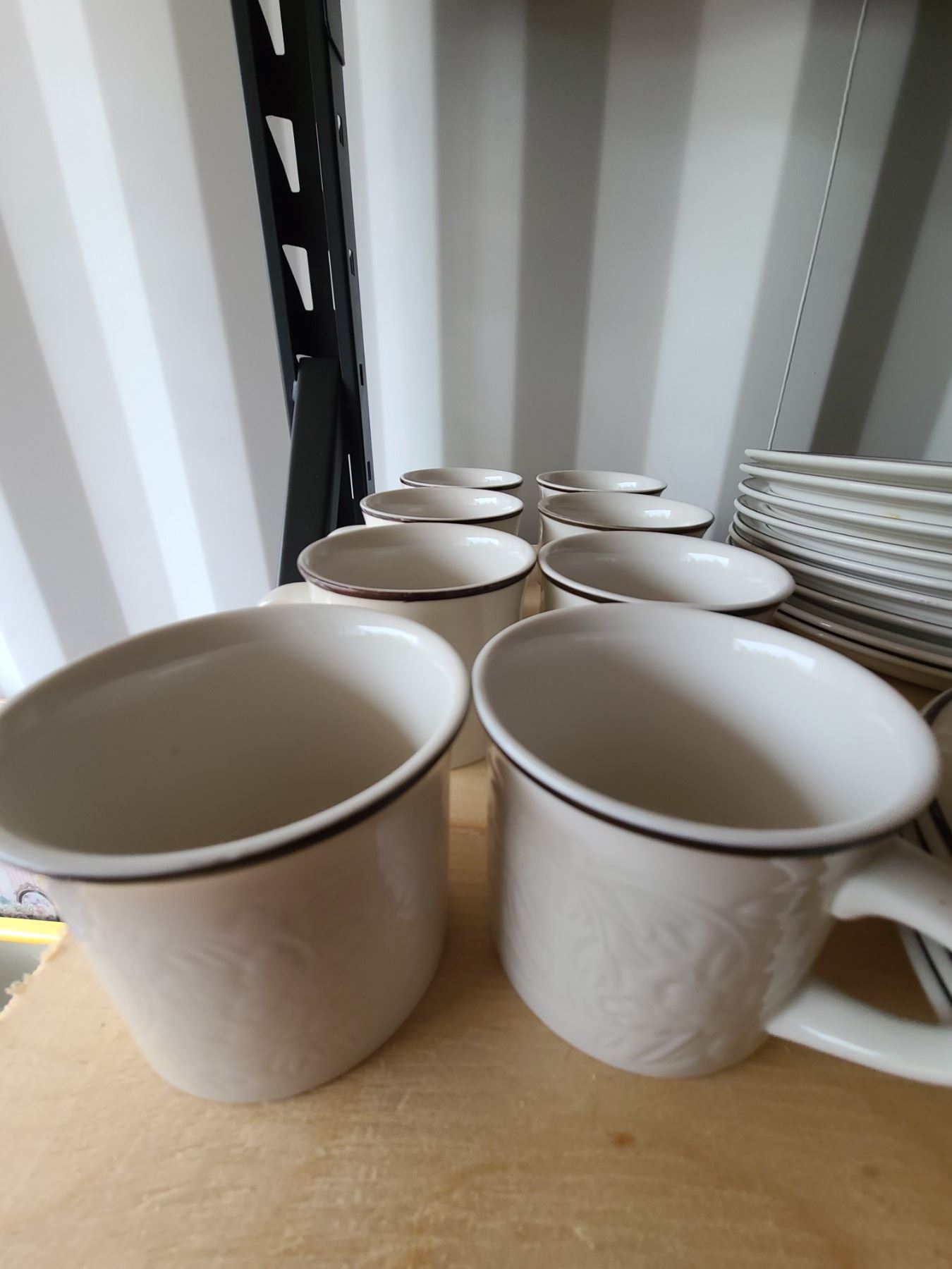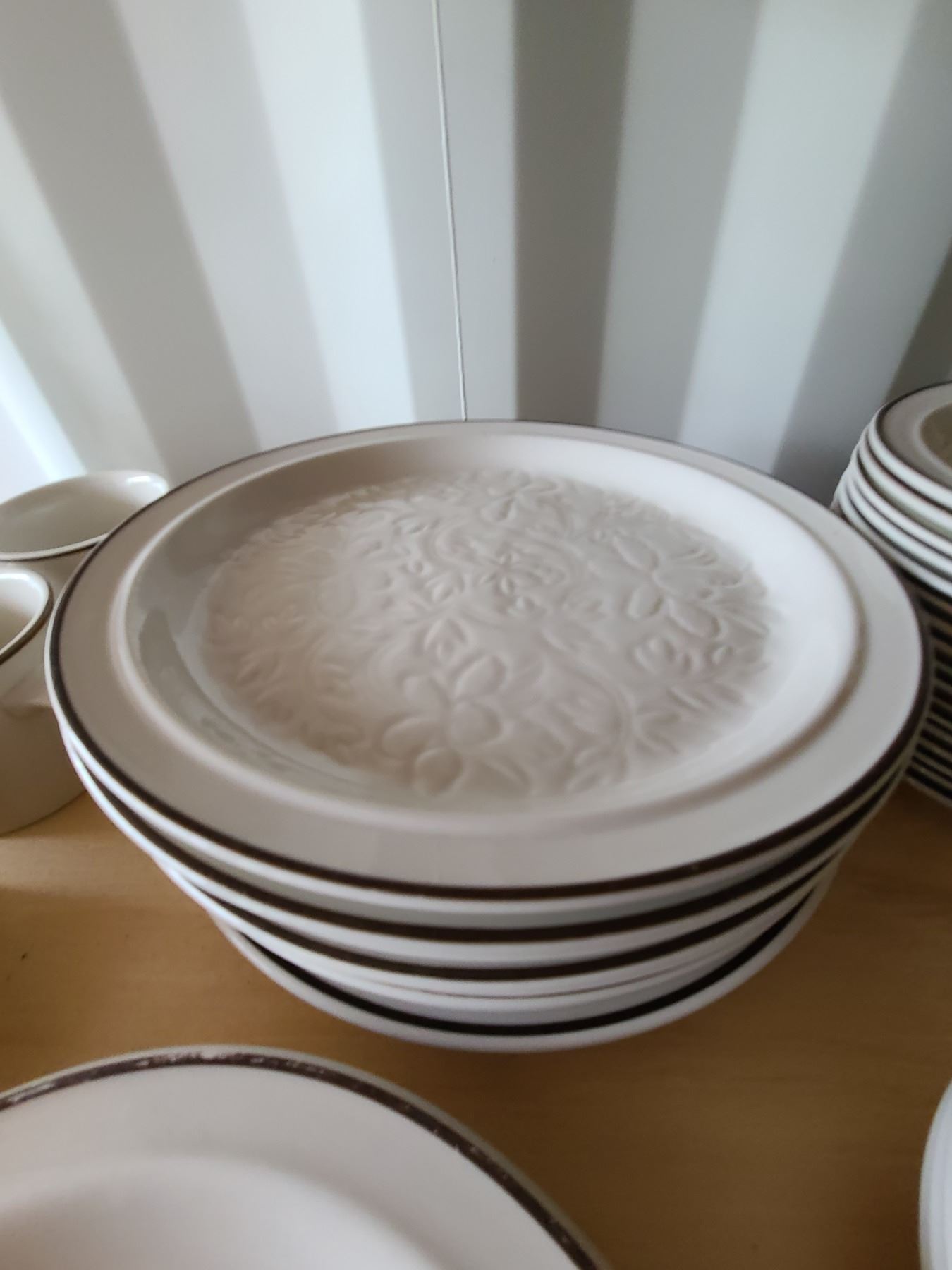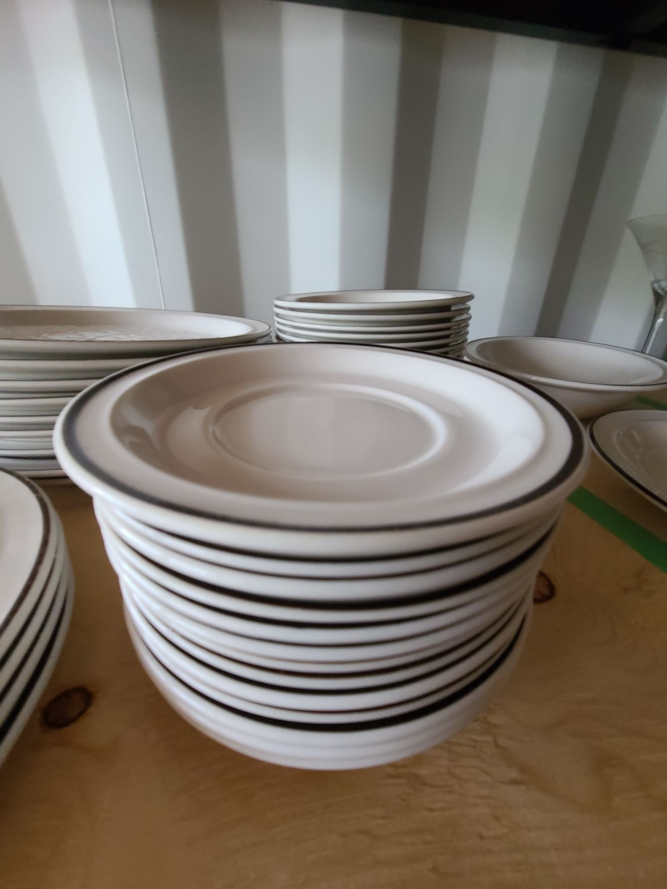 9 Dinner Plates, 17 B& B, 13 Saucers, 8 cups, one has small chip, 4 lunches plates. Bring packing material and pick up at 9am