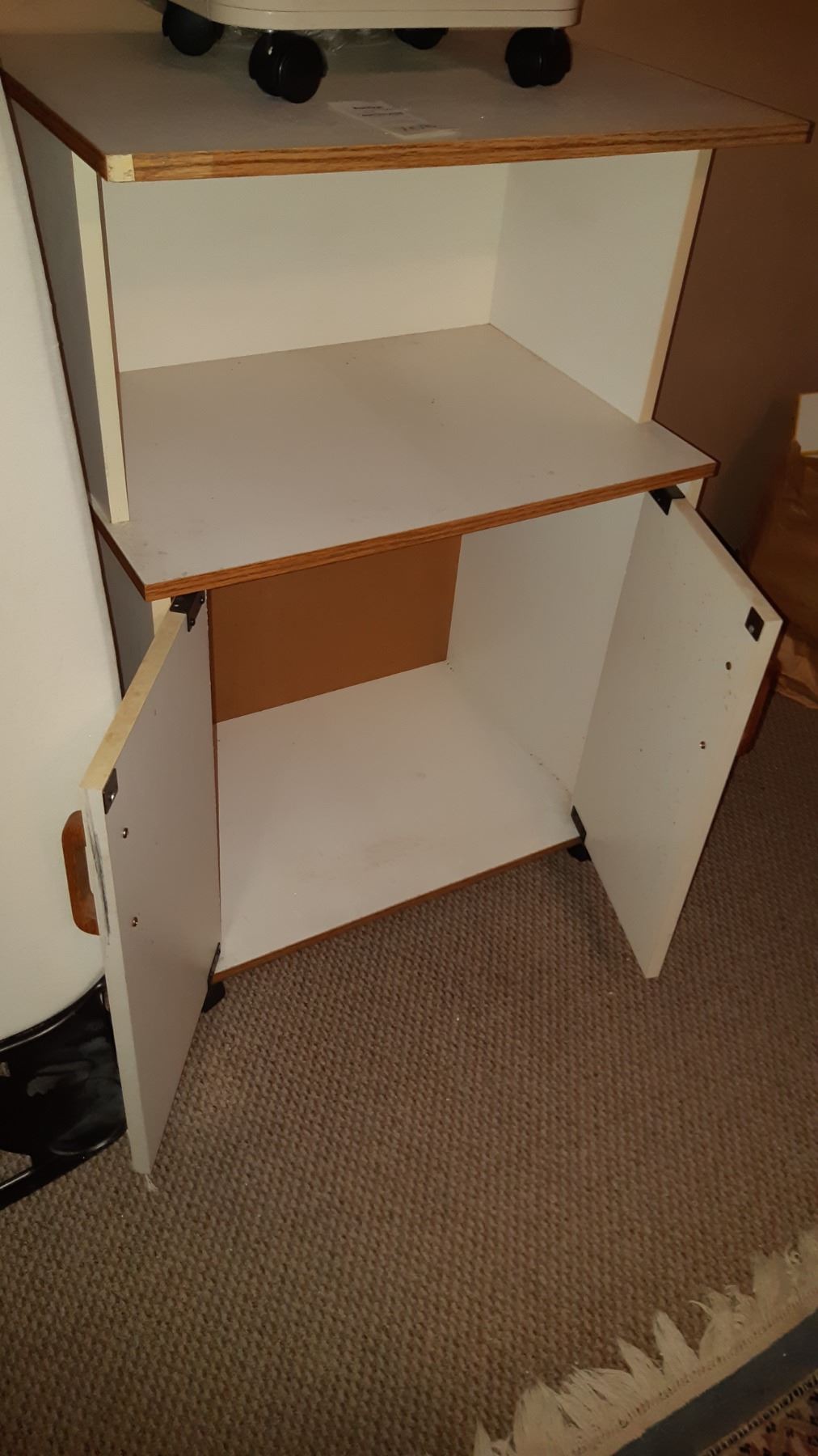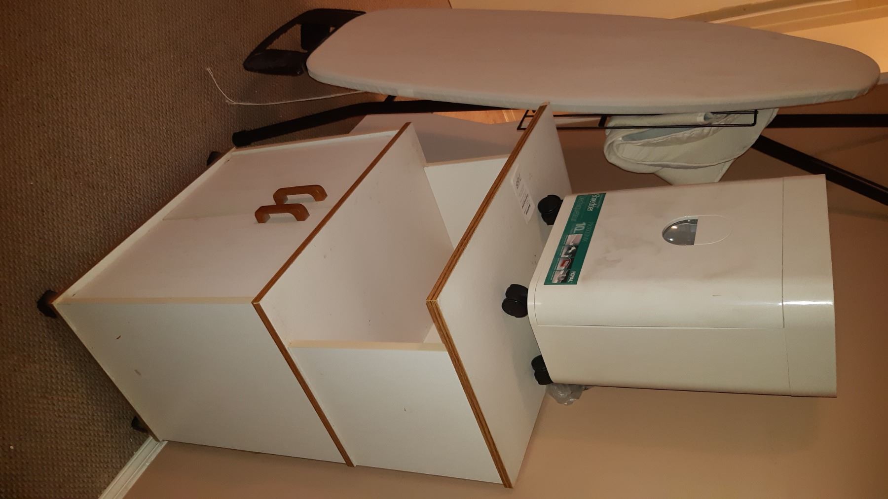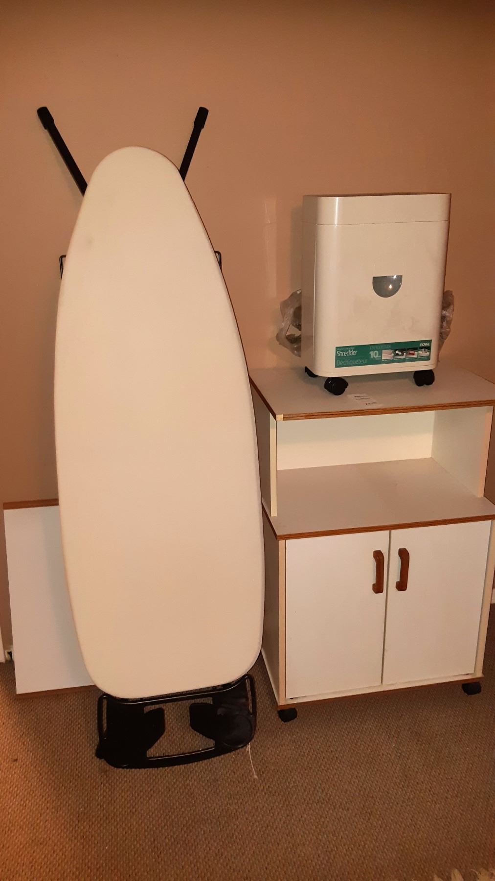 Royal paper shredder PX1000MX, 2 tired rolling cabinet & ironing board.pick up at 11am.